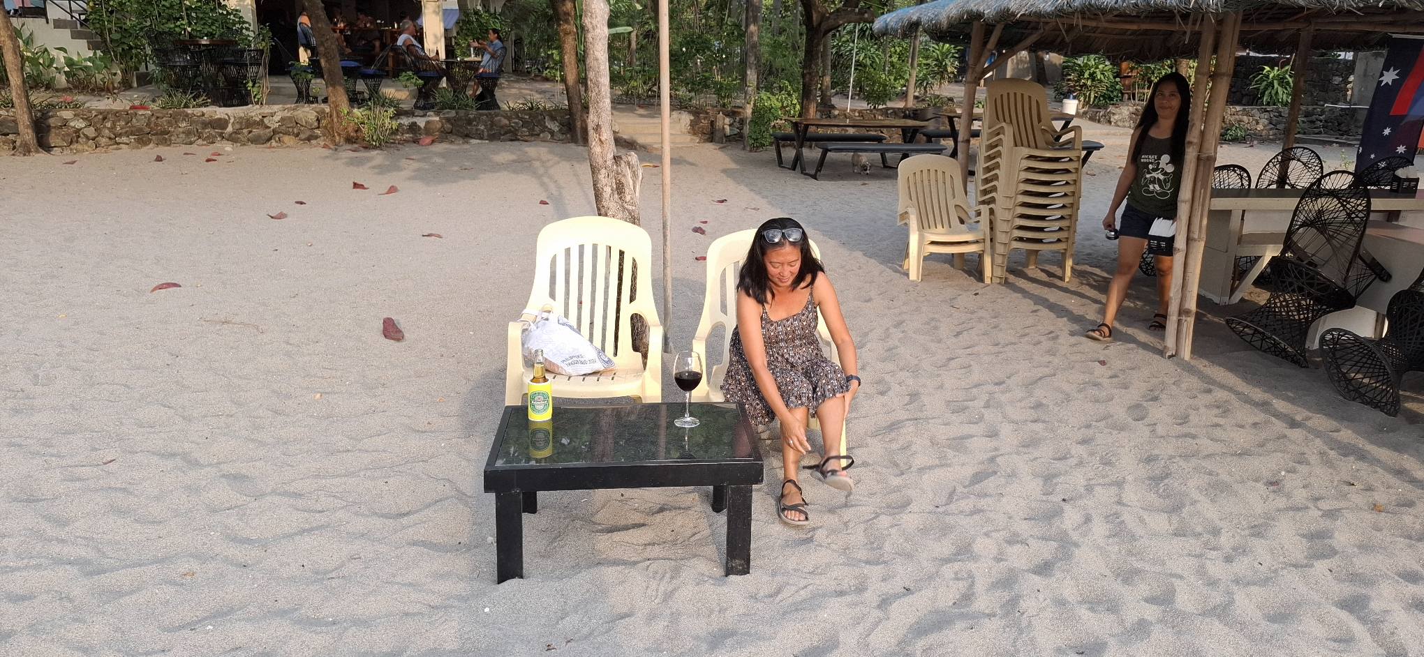 I took a pass on playing darts because of my back issues. I only experienced pain when bending over or lifting a leg — walking wasn’t bad. So, at beer o’clock, we marched on down to Baloy Beach.