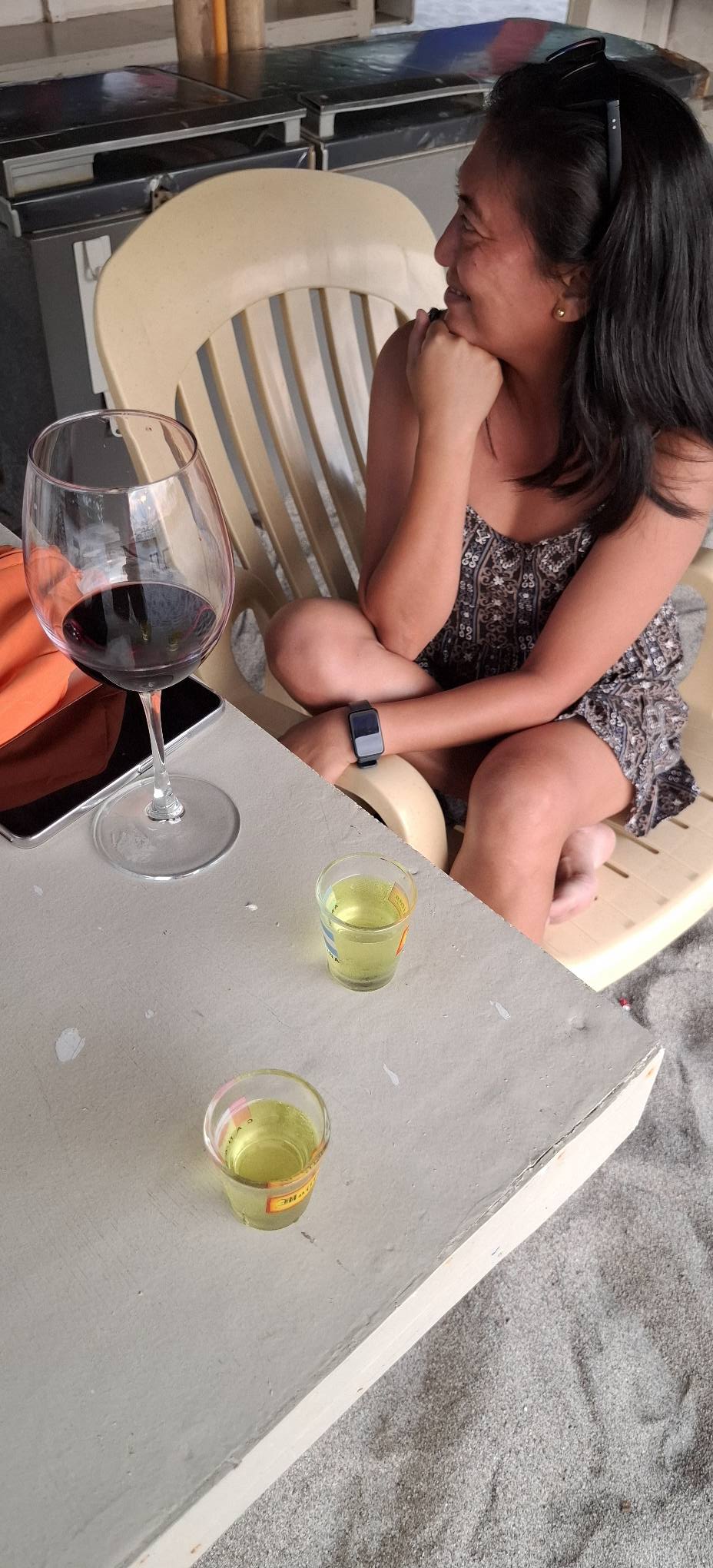 The floating bar view upon arrival.We were the only customers, so there were a dozen or so bargirls with nothing to do. I felt a little sorry for them, but not sorry enough to spring for multiple lady drinks.Swan was happy with her wine.