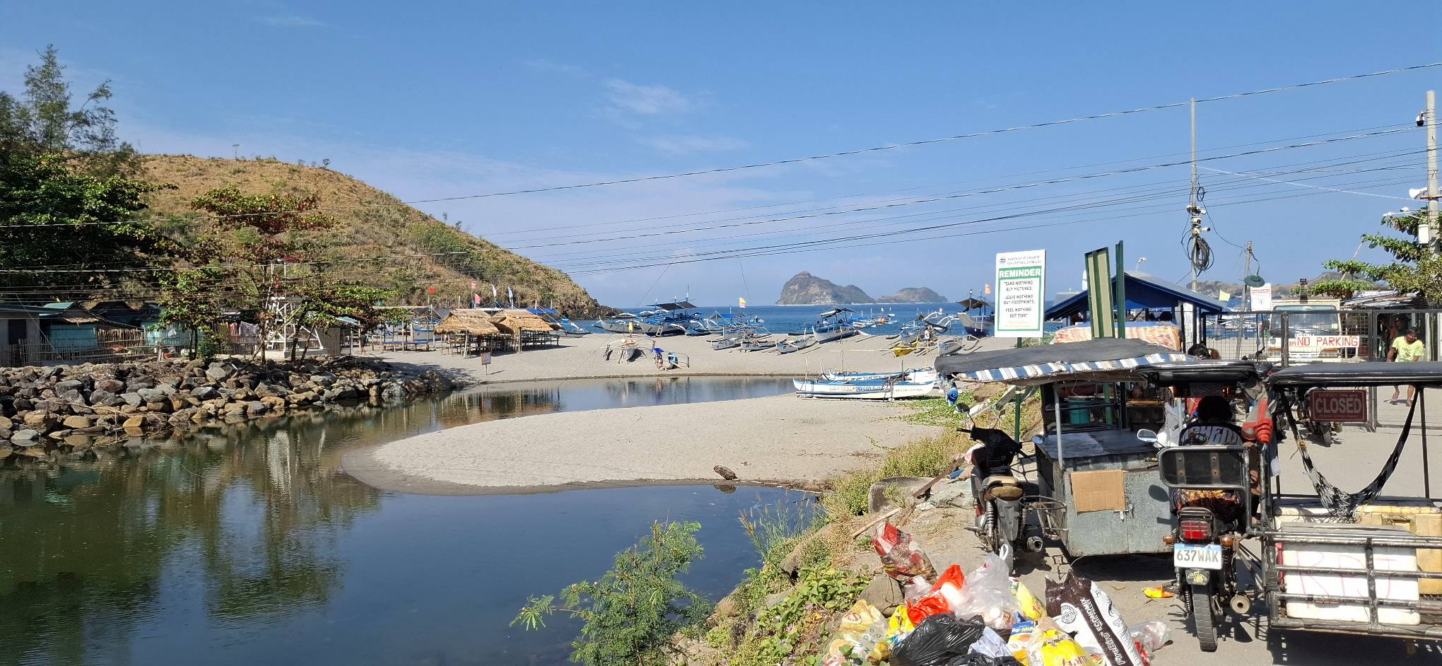 It was 33 kilometers door-to-door from my house to Wave Song. Coincidentally, Kevin Kim took a 33K hike yesterday. Upon arriving in Pundaquit before checking into our hotel, we stopped at one of my favorite places, CMC Car Wash, for lunch. Swan’s friend Mercy, at the far end of the table, provided the driver service. If all goes according to plan, she’ll find her way back to pick us up in the morning.CMC is a big open-air bar with a great kitchen.This snake was only on display, not on the menu.I enjoyed my big pork rib lunch.Our room at Wave Song is small, but clean and functional. 3000 pesos per night.The view from our front porch.That’s a good sign that I’ll be sleeping well.Boats on the beach.Boats on the water.Mountains, sand, and water. Pundaquit has it all.