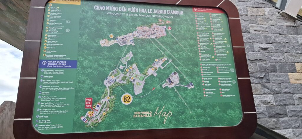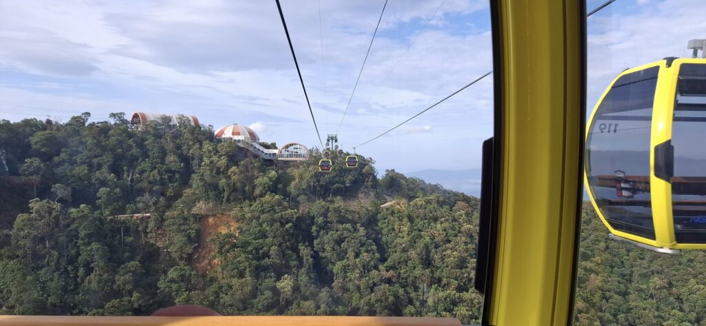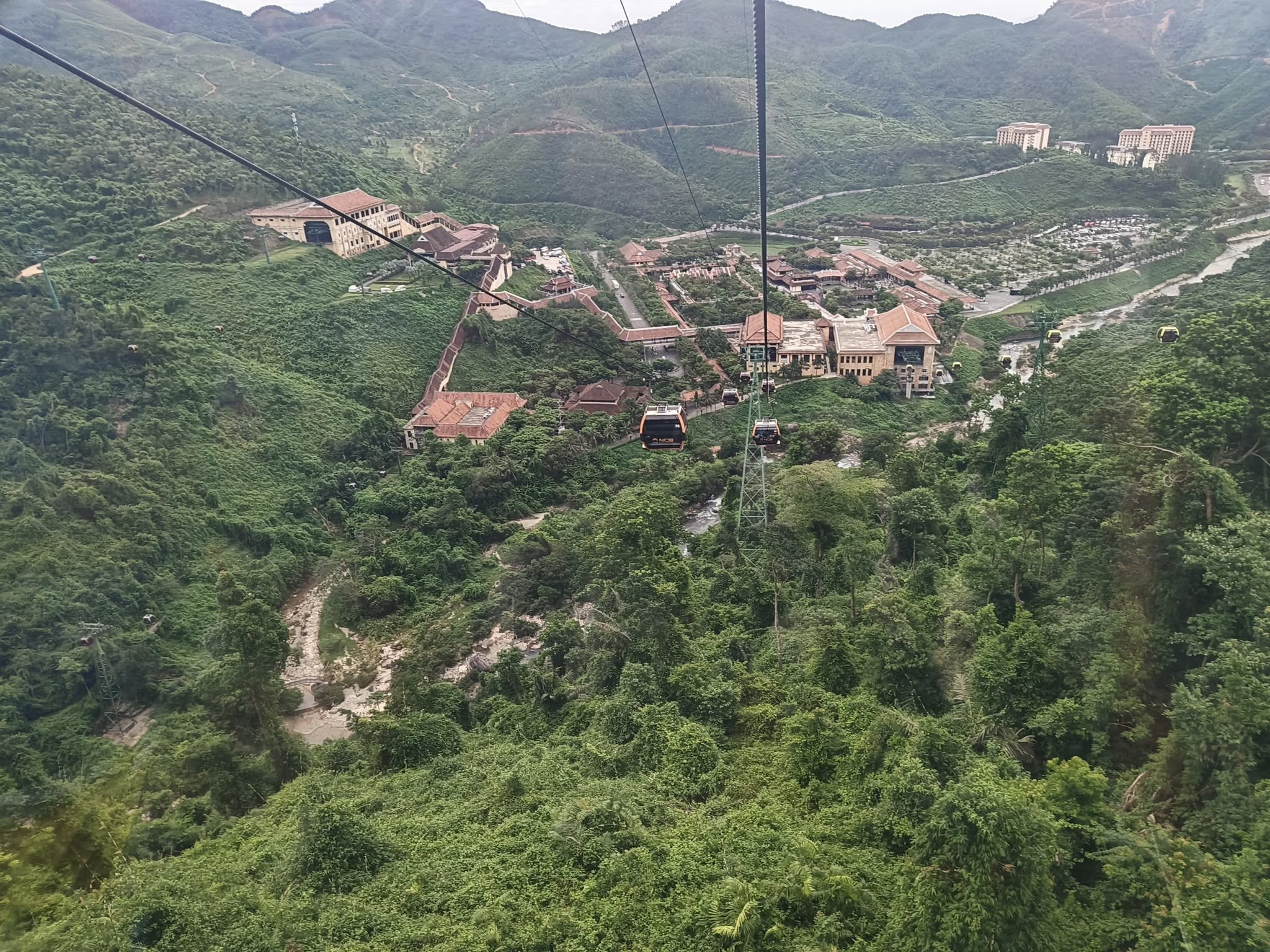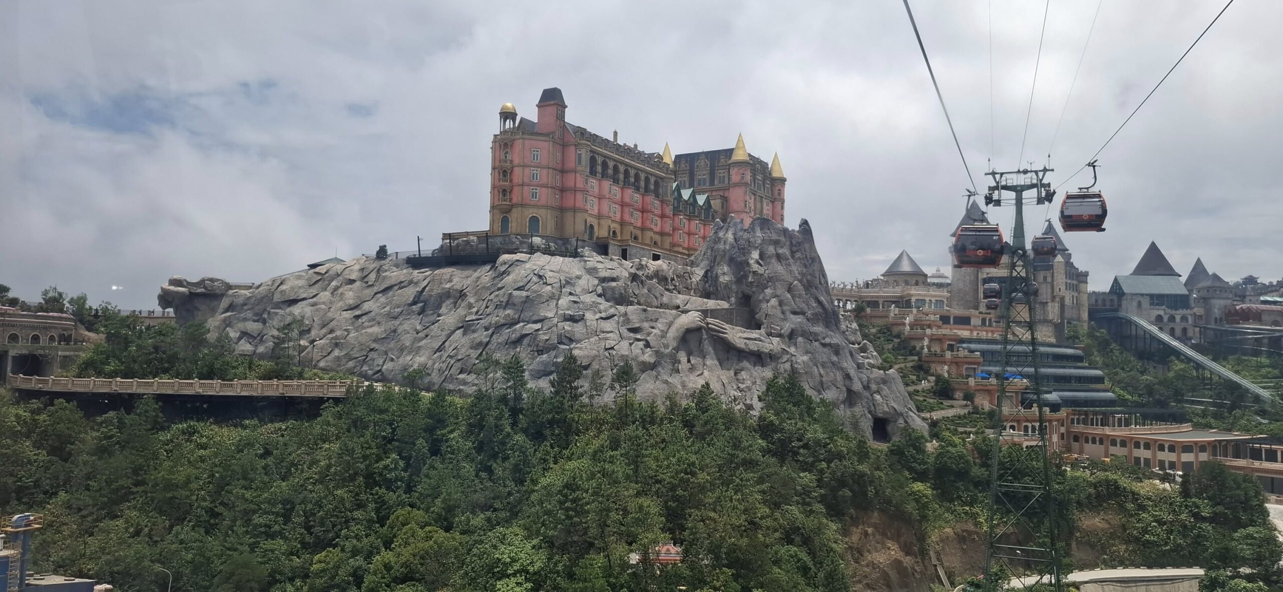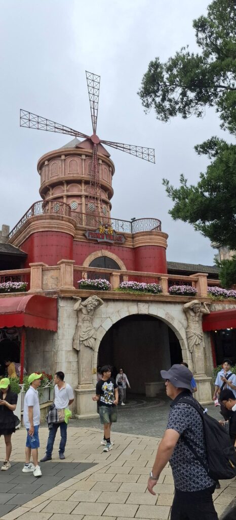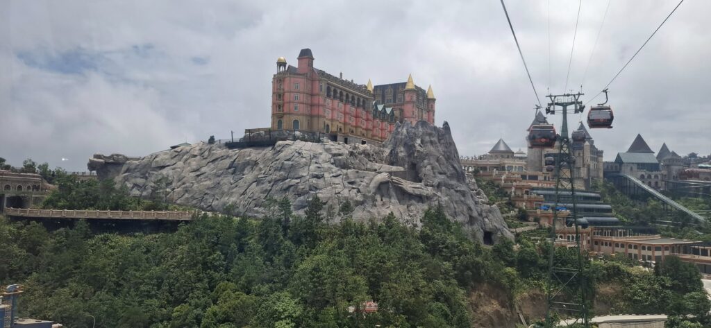 The only way to the top is by cable car (there is a service road for workers). It is the longest and highest cable car system in the world. At the top is an amusement park-like setting, the resort calls a Fairy Kingdom. I understand the old buildings in the French village section are relics from the colonial days.