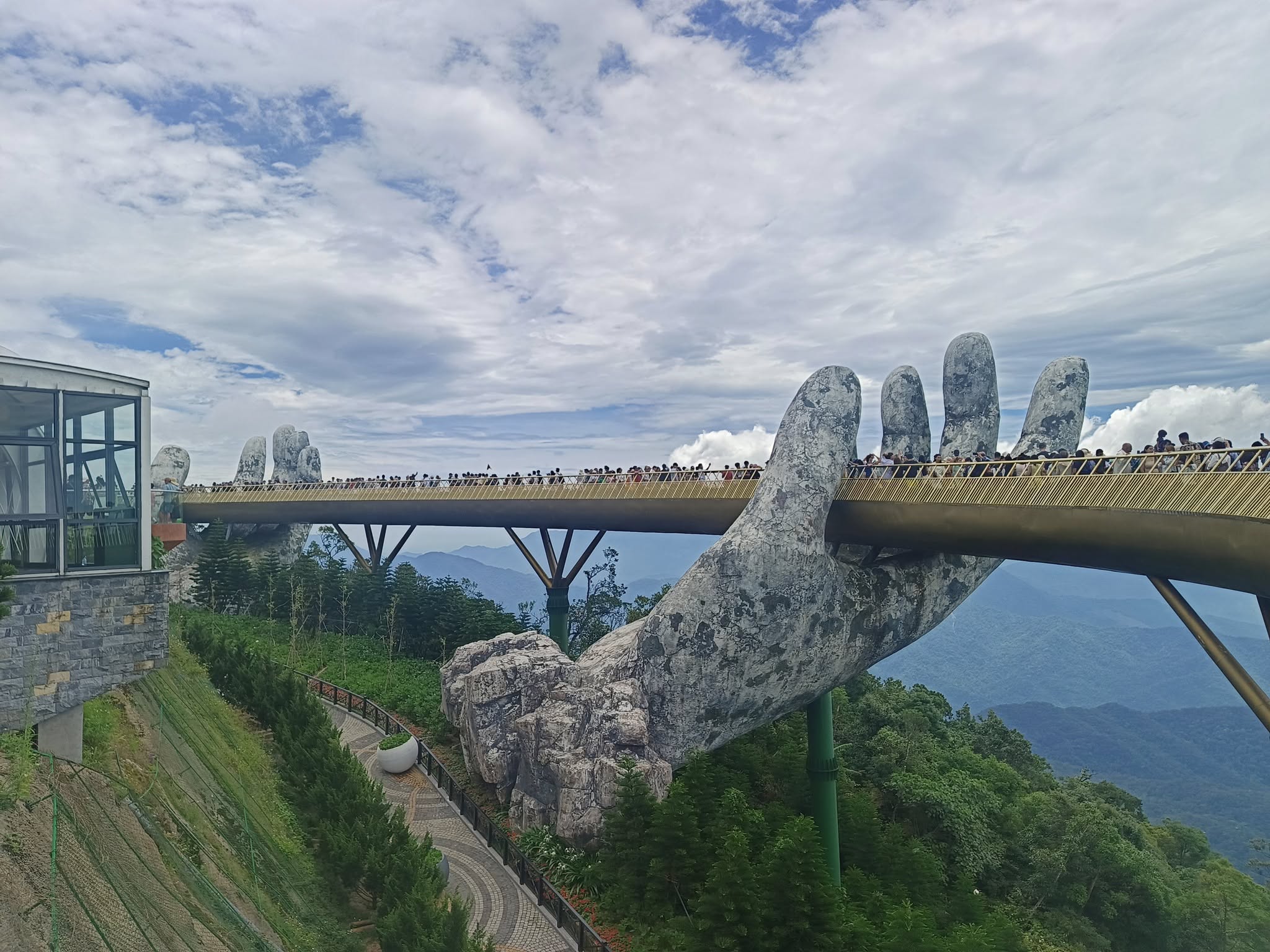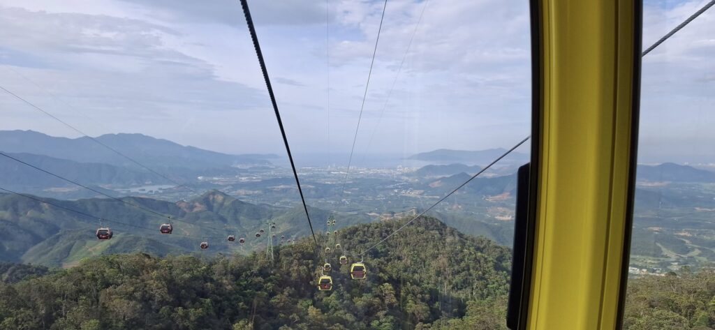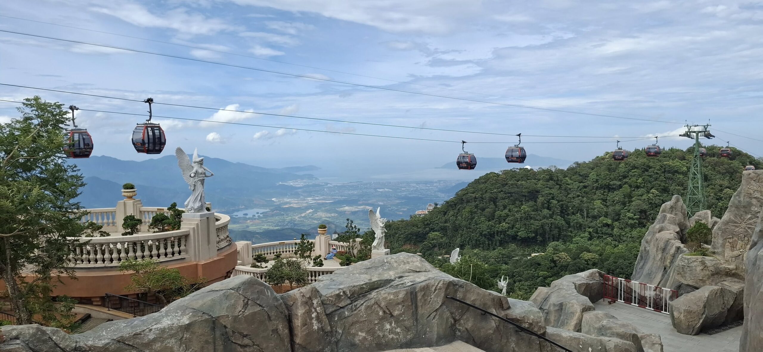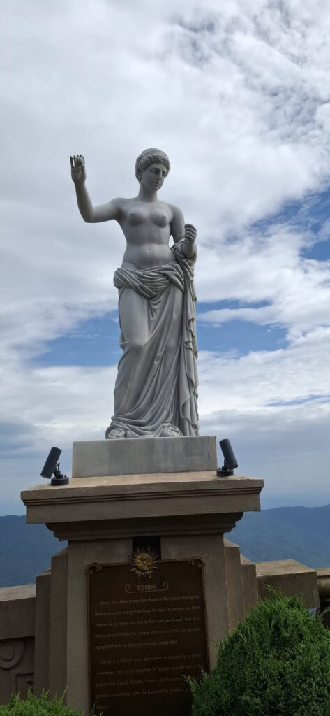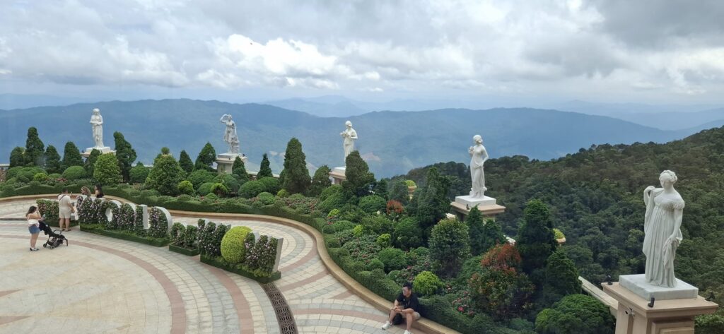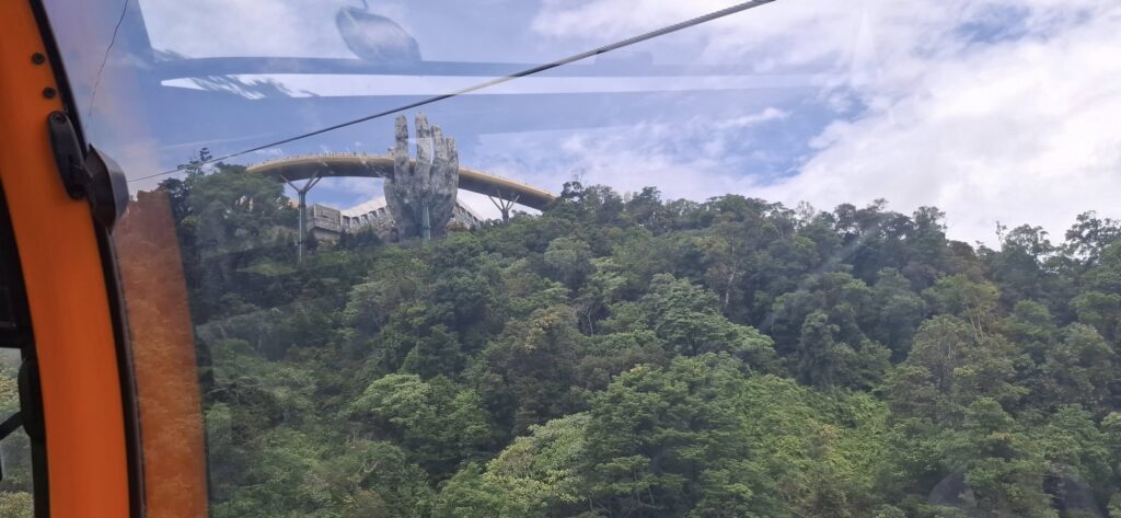 Getting there from Da Nang took about an hour. Once out of the city traffic, it was a scenic and pleasant ride.The entrance at the foot of the mountain.The cable car takeoff was a jolt.I have a bit of an aversion to heights, but it was still a fun ride to the top of the mountain (almost 5000 feet).Looking back from where we started.Approaching the Golden BridgeOn solid ground again at the top.Statues everywhere. She was the breastA Golden GirlSwan made a new friendFeeling festiveOMG! Is this heaven?