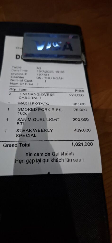 Owner Scott said the beef was from Argentina. It was definitely tender.And dinner for two was just a tad over a million dong.