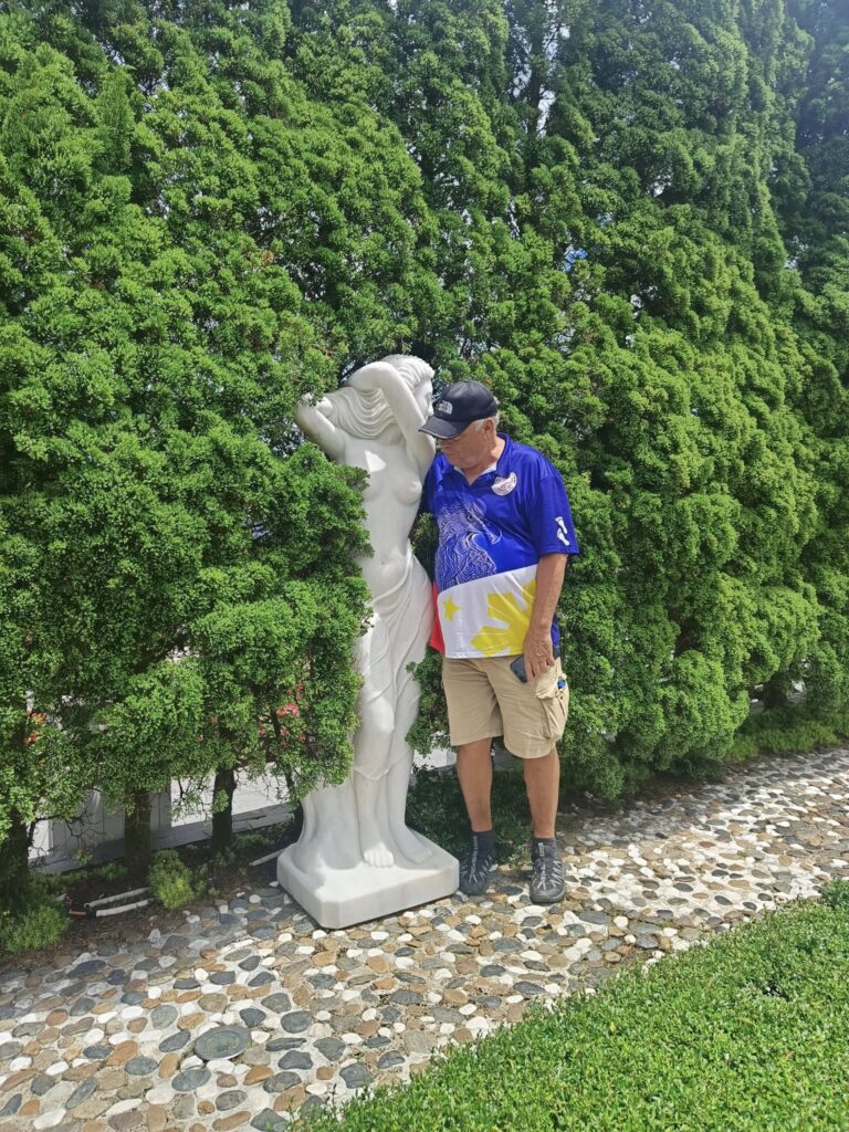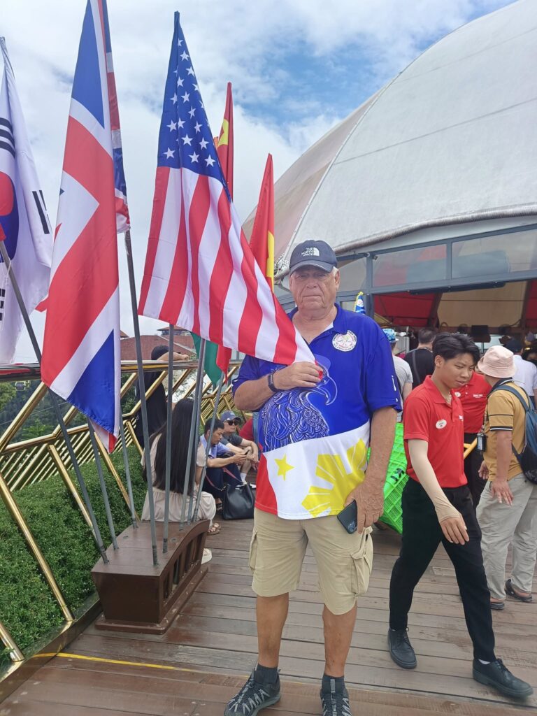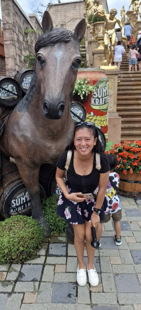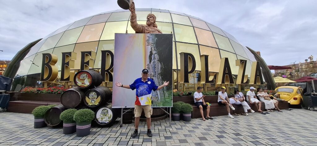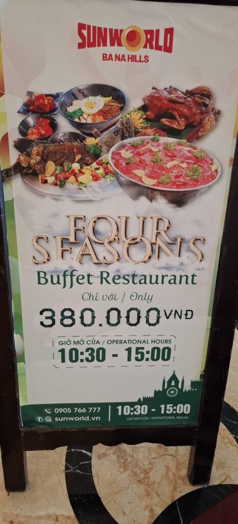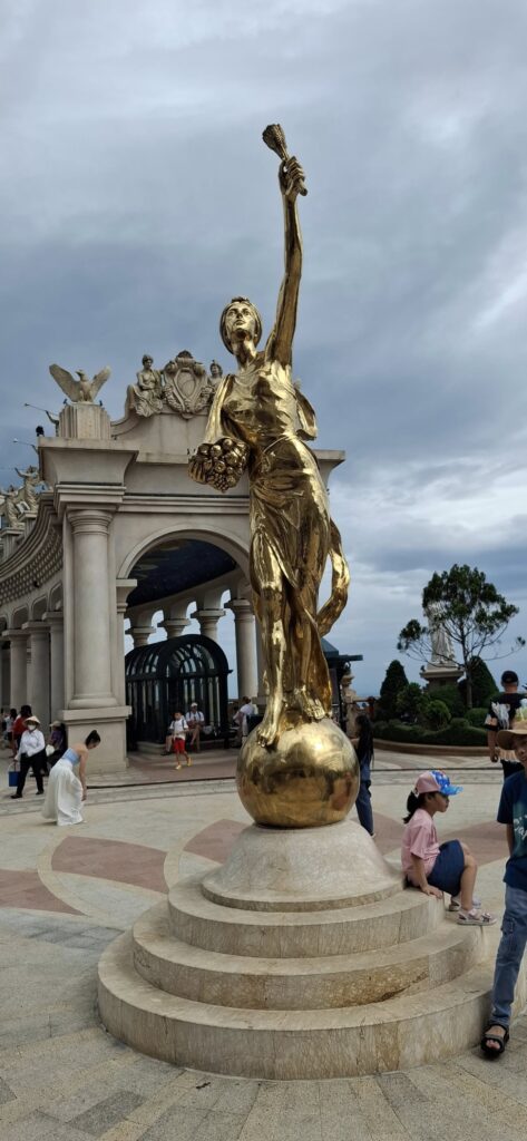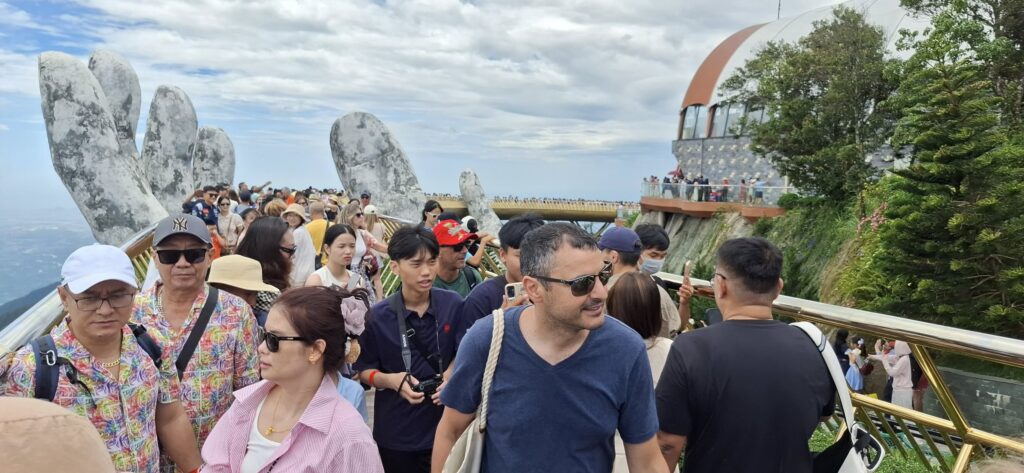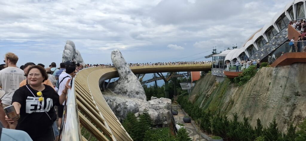 I gave the barkeep my two coupons……and he gave me FOUR draft beers. Swan had one, and I had three. They were small glasses, mind you.The beer pavilionBut only if you are alone or with someone.Swan horsing around.A windmill is good to have.A time travel vibeA garden of Goddesses.Our tour package included a free buffet (one t) lunch.My plate.I paid for that beer and got a full pint.A rare appearance of Old Glory.The Golden Bridge awaits our crossing.It was insanely crowded.But we made it.What a pisser.I guess that’s a sun skirt.I’m not sure what to think.I forgot what I was going to say about this.The back of Buddha’s head. I understand there is a temple here, but we didn’t see it. Not part of the resort, and not sure how you would access it.The view from our mountaintop vantage point.What are you pointing at?Never mind, she has a heart of stone.This is definitely a hands-on resort.And it is huge.And apparently, they aren’t done yet.As we prepared to depart, I caught a glimpse of Gandalf. Is he grey or white?Down we go.I would enjoy a return visit someday.Rush hour traffic in Da Nang was no picnic.