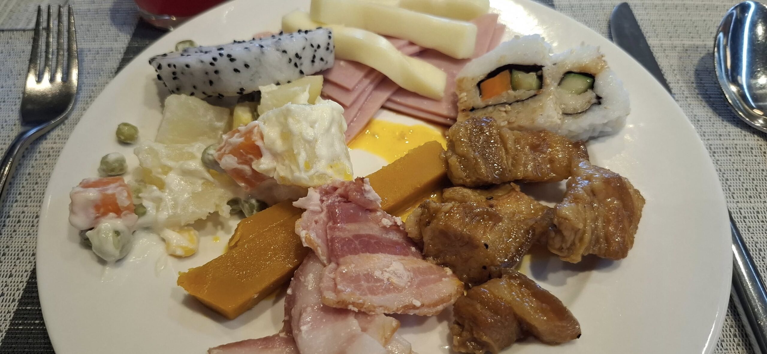 My hotel room comes with a complimentary buffet breakfast, so that’s as good a place to start as any.