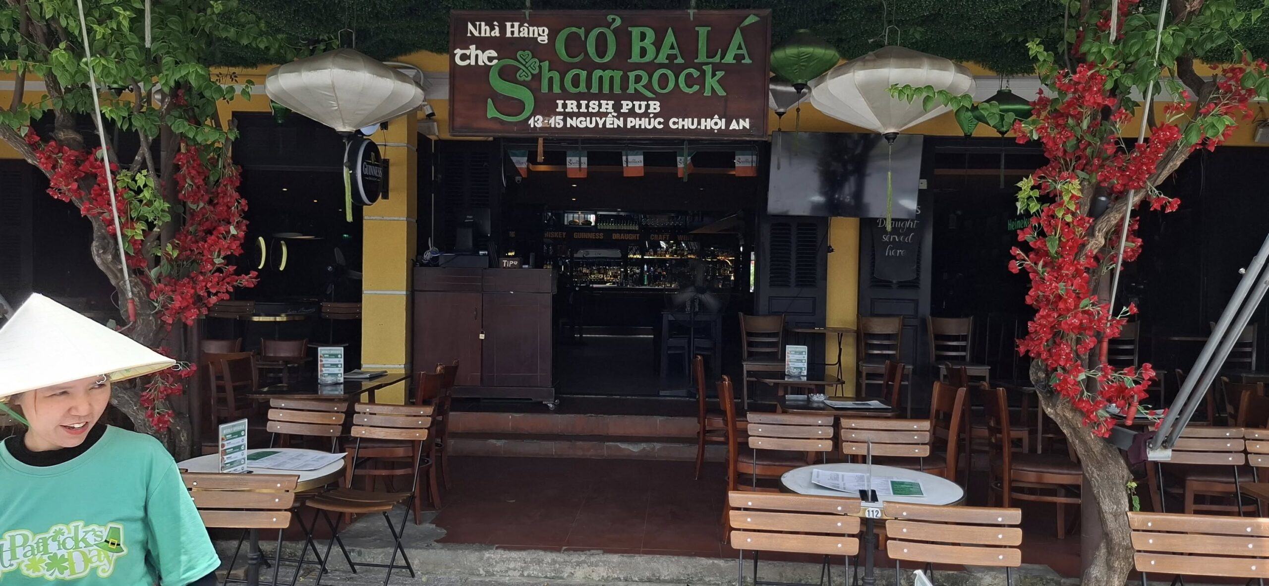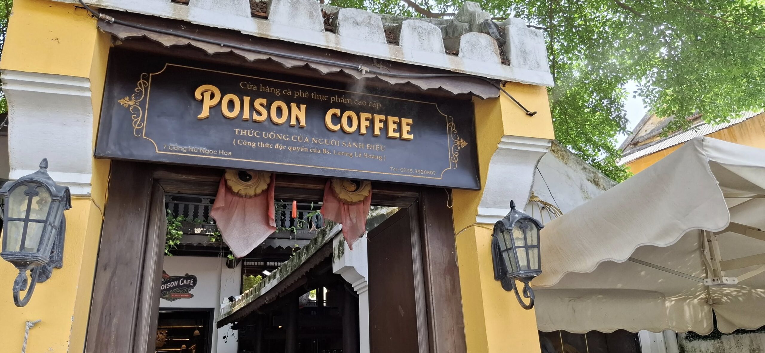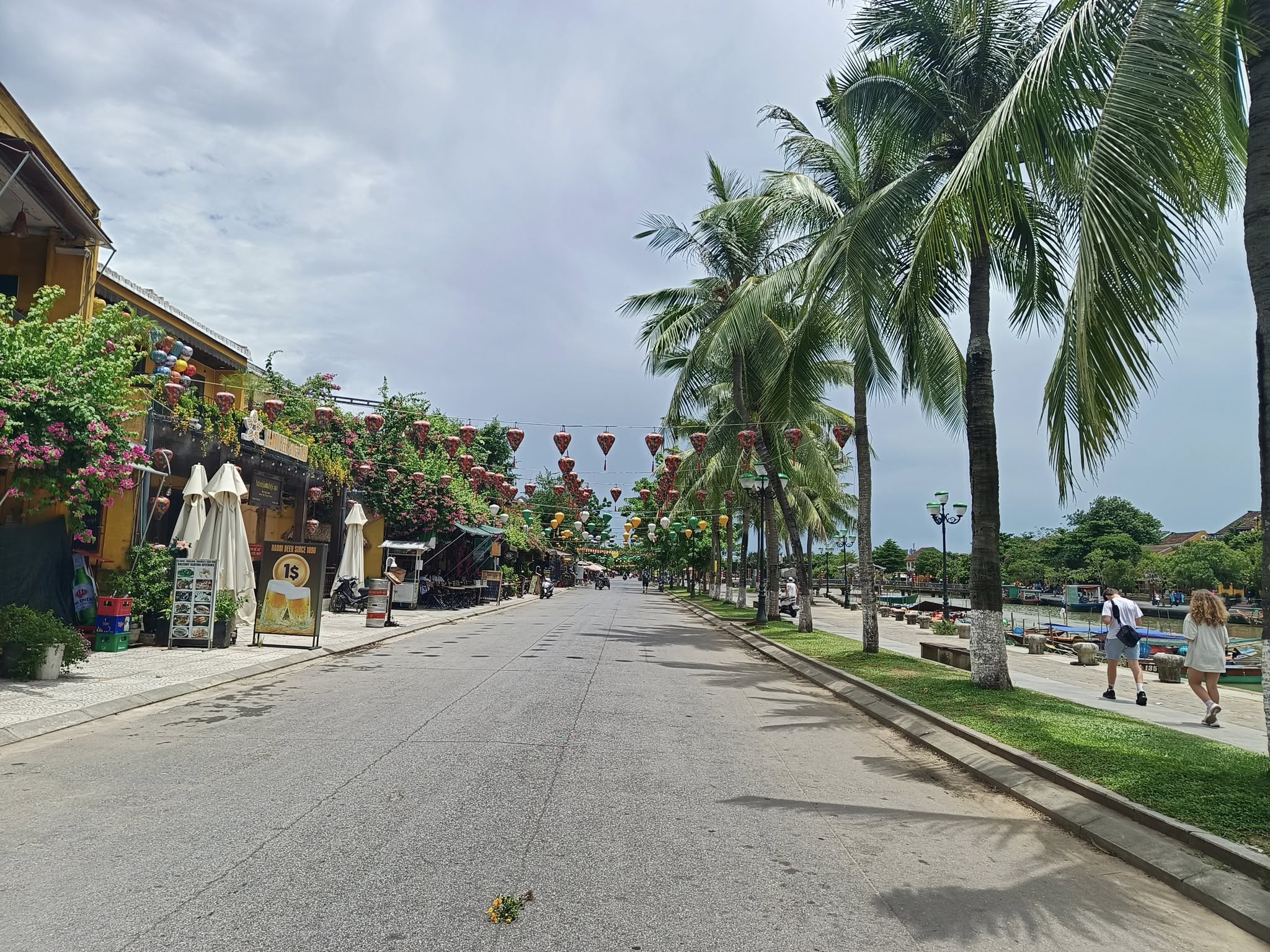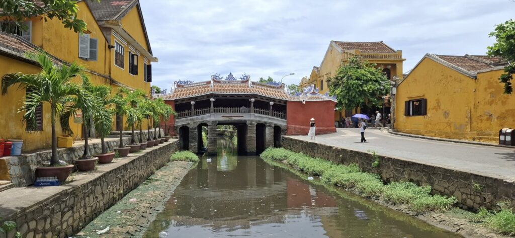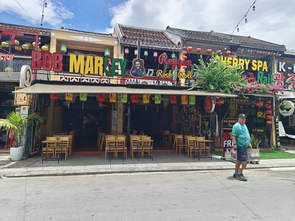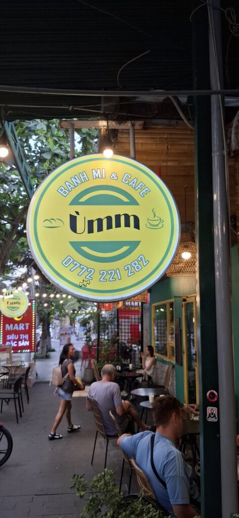 A riverside view.Nice!It turns out that Hoi An is famous for its Banh Mi sandwiches.We weren’t hungry yet, though.I’ll eat at Dirty Fingers, but Poison Coffee is a bridge too far!Speaking of which, this is the famous “Japanese bridge” built in the 1600s.Over the river we go!A Hoi An moment.We headed back to meet our driver with a stroll on this road.Still too early to visit a pub, despite being enticed by this lovely lady.I think I’d love this street at beer o’clock.