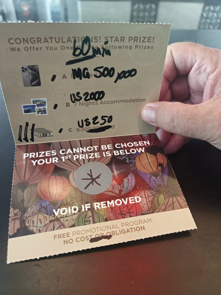 On the way to the hotel, I told Swan I’m sure her prize would be revealed to be the free hotel stay. When we arrived at the Karma and the ticket was scratched, I was proved right about that. And then there was some confusion. We had agreed to a one-hour presentation, and fifteen minutes later, nothing had happened. Swan told the Karma representative that we needed to leave by 1 p.m., and the rep went and made a phone call. When she returned, she told us that there was not enough time, so the prize would be voided. I said, ‘Okay, we arrived at 12:30; we’ll stay until 1:30,’ and the rep said that still wasn’t enough. We needed to spend one hour with the person making the presentation. I smelled a rat and said, Never mind. We’ll go. The rep apologized and gave us a 500,000 dong voucher ($19) for a local Da Nang restaurant.