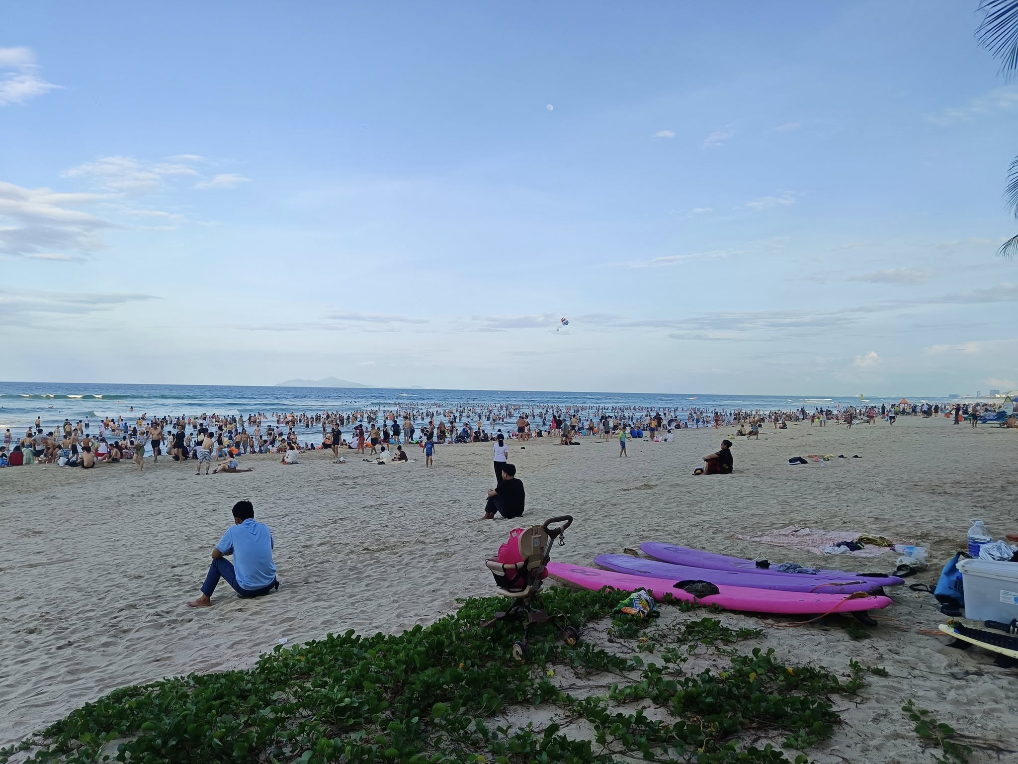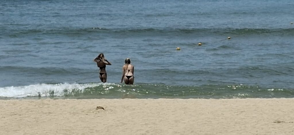 As seen from the beachLooking up the beach……and looking down the beach. I grew up in Southern California, but I don’t remember the beaches ever being this crowded.Our drinks have arrived!The view from our perch.