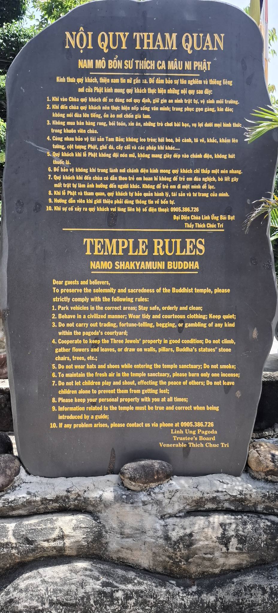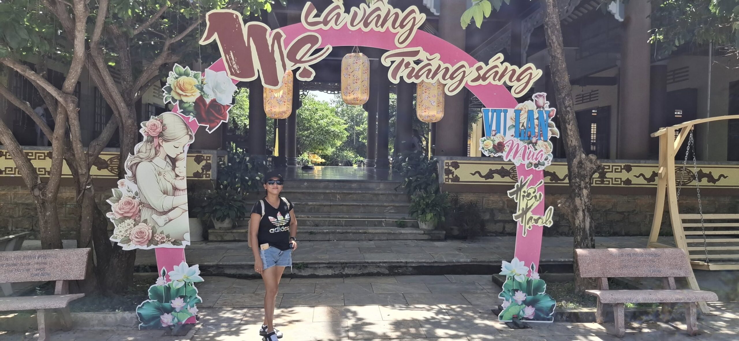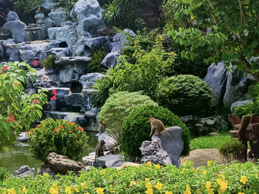 As we neared the temple, we saw these critters monkeying around.Rules, rules, everywhere there’s rules… We obeyed them.Statues like this abounded.I know next to nothing about the Buddhist religion, but I could appreciate the artwork involved.Many structures like this one were scattered throughout the massive temple grounds.I was surprised to see this bench emblazoned with the name of the town where I grew up.Buddha brings the faithful to their knees.Out of respect, Swan was asked to wear this wraparound skirt to cover her legs while inside the temple.When I used the restroom, I was provided with guidance on the proper way to pee.Swan defrocked.A golden momentYet another fancy building.It seems God was keeping an eye on things.Dragon my ass up the stairs.The portal awaitsDa Nang in the distance.Swan close up.Who is that looking at my ass?“Yes, ma’am. Whatever you say, ma’am. No offense intended.”Whaddya mean he looks like me?Are you a cherry girl?I guess even statues get tired.That’s a bridge too far, Swan, come back!