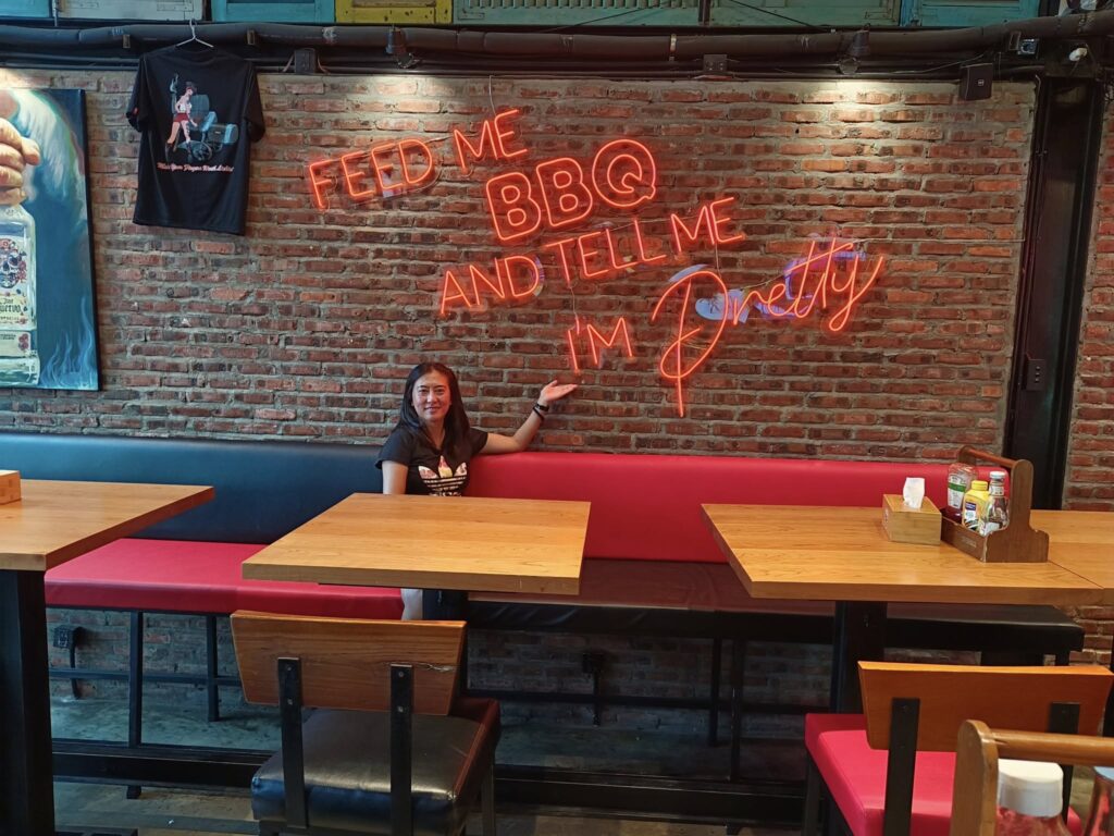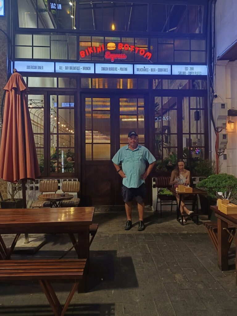 Withdrawals are limited to two million dong ($76), so I’ll likely be visiting once a day or more.Our dining destination. Not a bikini in the place, though. As you can see on the signage, this is an American diner. What? You thought I would eat the local food? C’mon, this is me we are talking about!