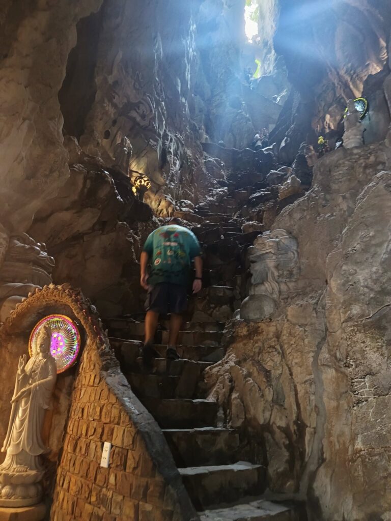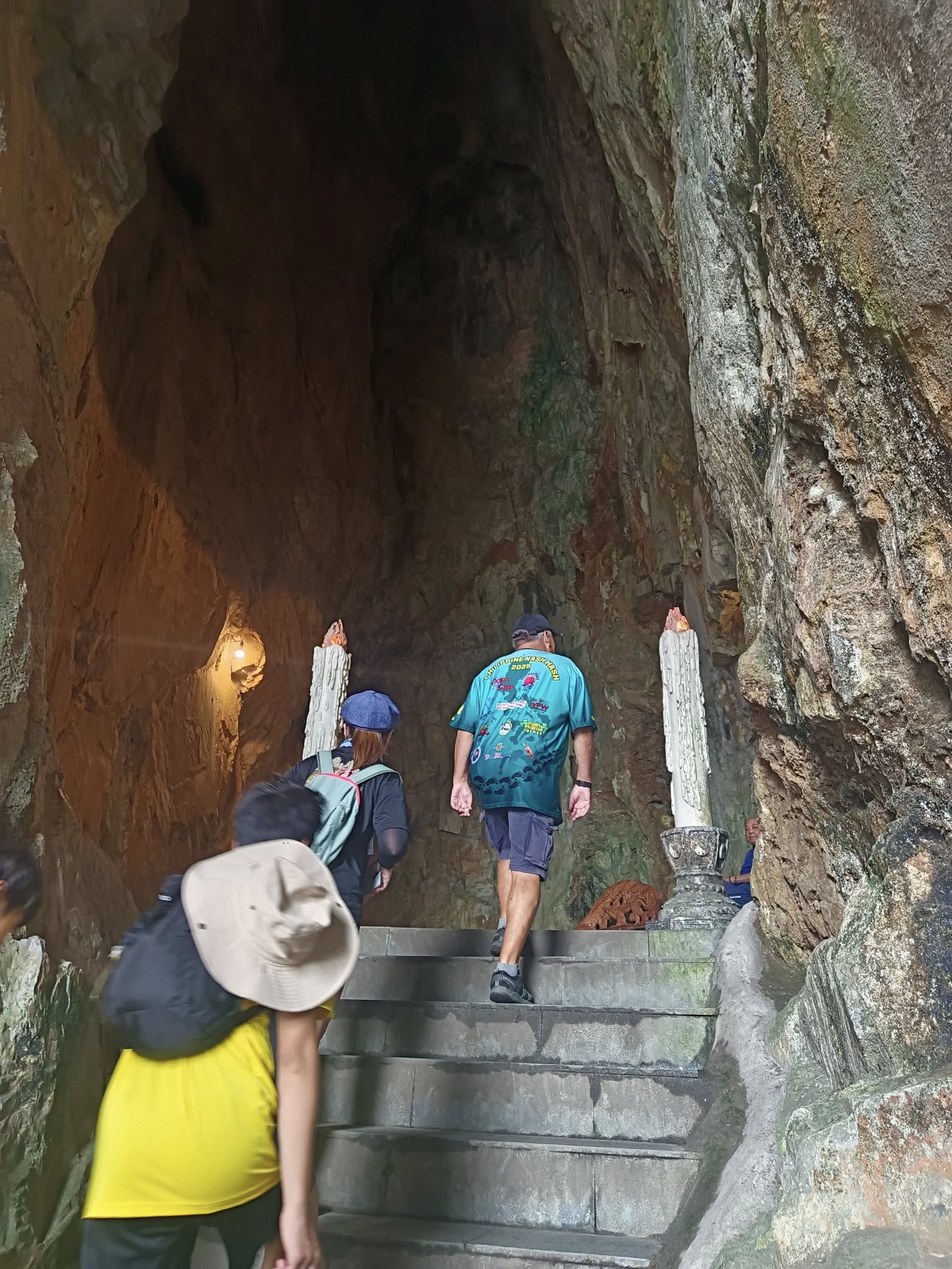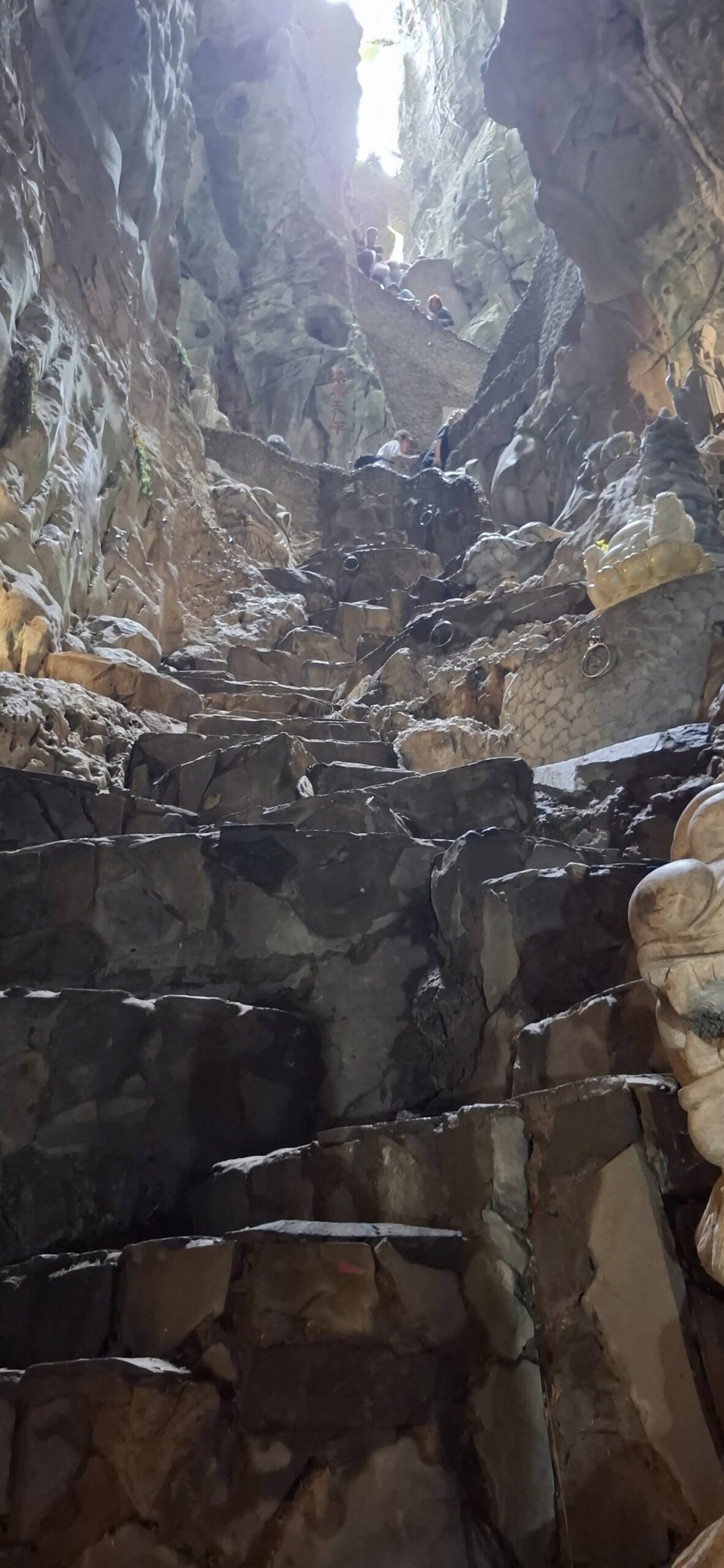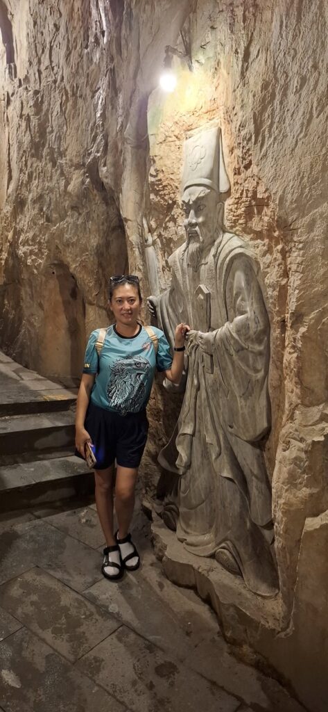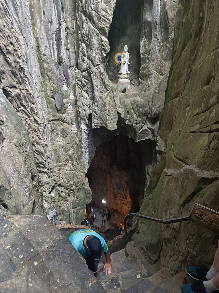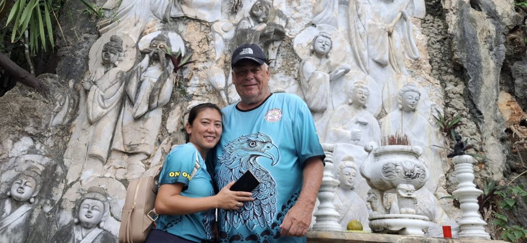 Hitting the highway with driver Tom.One of the mountains they call Marble.The entrance to the cave. As usual, there were tons of tourists sharing the experience. I understand this is the busiest time of year for tourism in this area.Should I stay or should I go?Penetrating the void.Inside the cave were statues and other relics.Most of the passageways were easily navigable, but some places required crouching down.Hello up there!It got a little dicey climbing these steep, narrow, and uneven steps. The voice in my head kept saying, “walk towards the light.”You only live once (unless you get that do-over life).Almost there…Made it to the top!A view from here.And one of the other Marble Mountains we didn’t visit.A random stranger offered to take a photo of us.Going back down was even scarier than the climb.