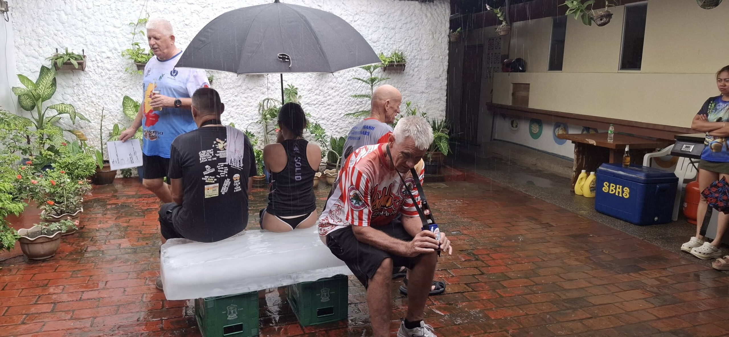 Something weird happened along the way. As we passed the Savers store, we saw a group of out-of-town Hashers waiting there. Um, this is LAST week’s meetup place, I told them. I explained that the start this week was another kilometer or so up the highway. They decided to follow me on my trail instead.My group was the first to arrive at the On-Home venue.The Hash GashThe old fuckersThe Hash Circle area at Johansson’s is uncovered, and it rained for the duration.It’s nice on ice, even in the rain.The usual after-Hash gathering at IDM.