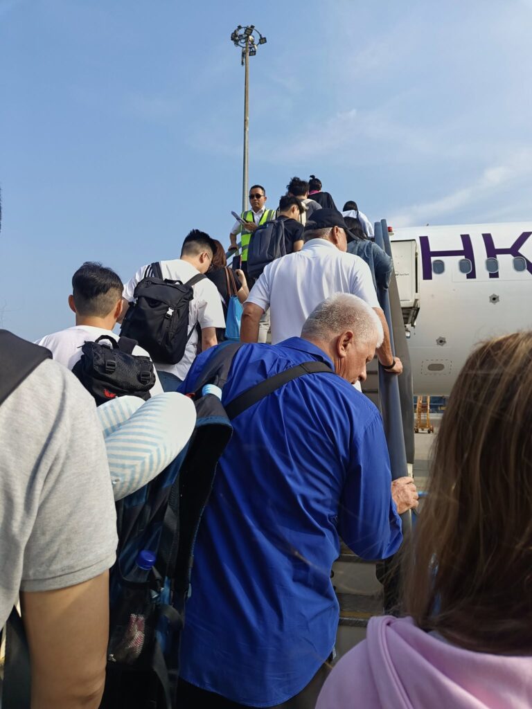 The day began with an alarm on my phone at 4:30 a.m. We had to be up early and ready to catch the 6 a.m. hotel shuttle to the airport. Once there, it was the typical travel bullshit of waiting in seemingly endless lines. I’d never flown with HK Express before, but they did okay for a budget airline. Didn’t charge me extra for my checked bag, but also insisted that Swan check the suitcase she carried on with AirAsia. Well, since there was no charge, it made things easier. On the flight, snacks and drinks must be purchased, and when I asked for a bottle of water, I was informed that they don’t accept cash. Well, fuck you very much then. But the bottom line was that we achieved a wheels-down landing, and our luggage, although almost the last to come out on the carousel, made it too.