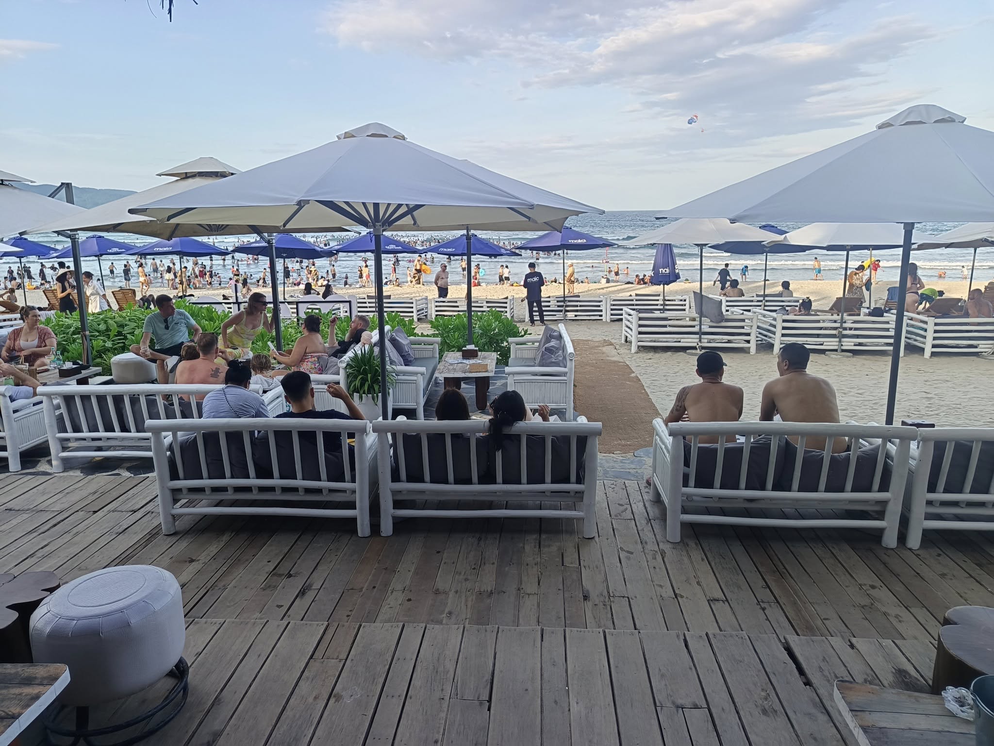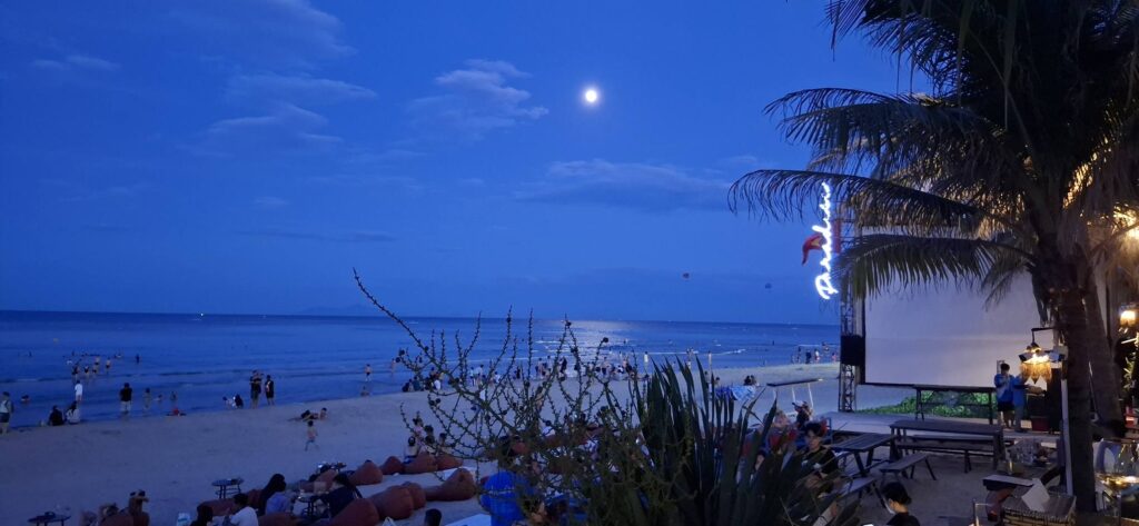 I’d never seen plants growing on the side of a high rise before.We visited a rooftop venue called Sky Bar, but they didn’t serve wine. We took this photo of the beach and departed.So, we did our nightcap at the beach bar across the road from our hotel.Our view from there.