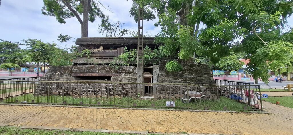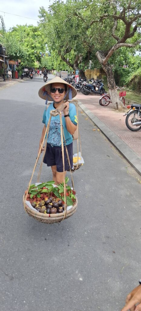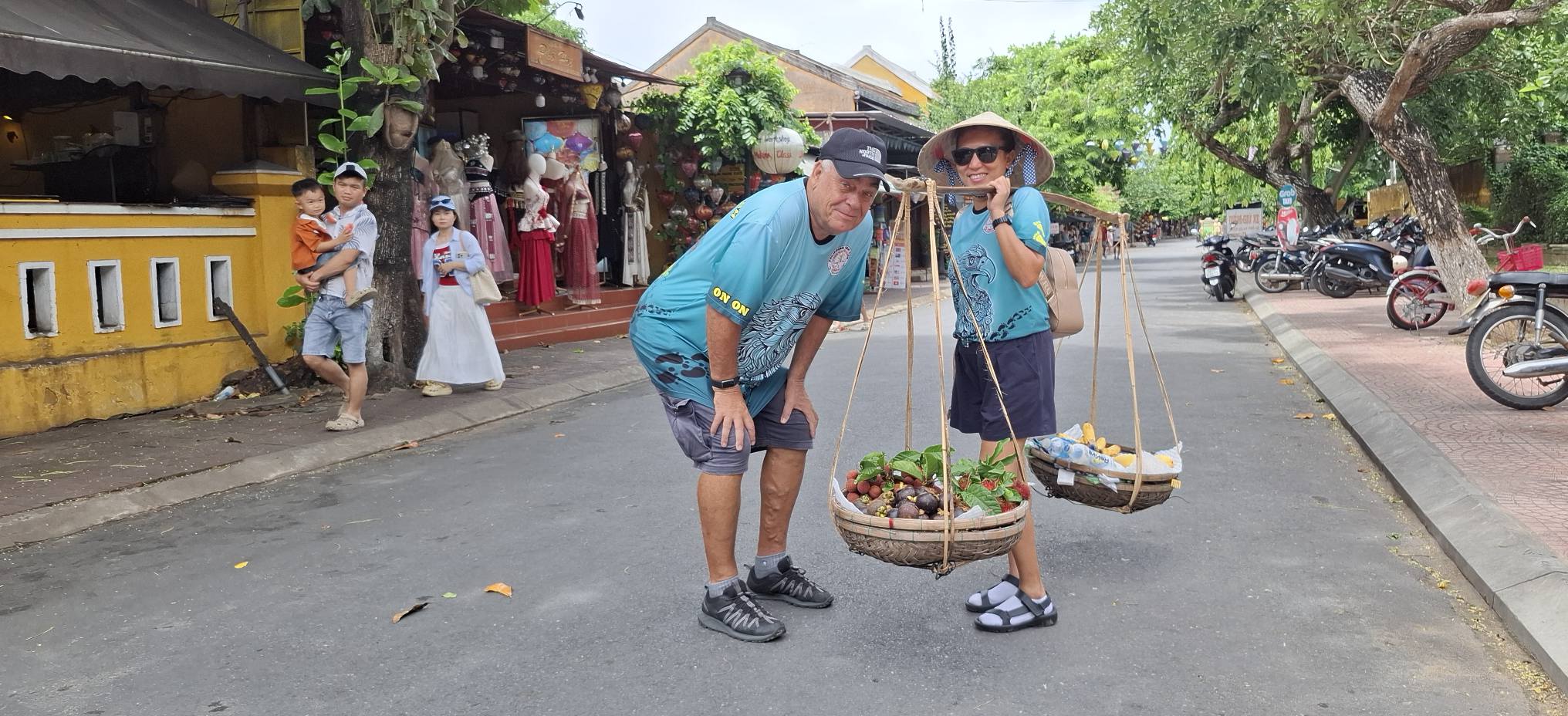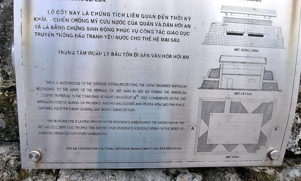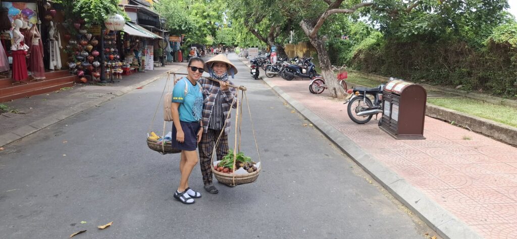 Tom told us this used to be an American Army installation during the war years.This old bunker has been preserved, more or less.The caption perfectly captures the Vietnamese perspective on the “American occupation period.” Oh, you mean that time when we came to defend South Vietnam from the invasion of their northern neighbors? Anyway, we lost, so the winners get to write the history.Our driver dropped us off in Old Town Hoi An, so we could explore on foot.Motorized vehicles aren’t allowed on this road, hence the bicycle carts.This was one of the friendliest vendors I’ve ever encountered. She volunteered to pose for a photo with Swan.Then she had Swan don her hat and carry her burden.“You too!” she told me.