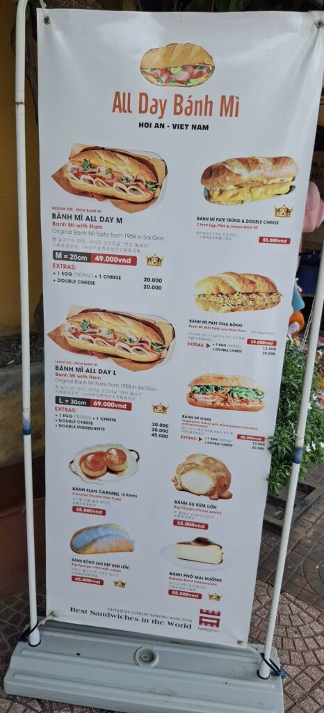 An uneventful trip back to Da Nang, but I did have my driver show me a place to get the Vietnamese Bahn Mi delicacy. When it was time to eat, we hoofed it over there. It’s a few blocks off the main beach road and surrounded by other restaurants, almost all of which are Korean.