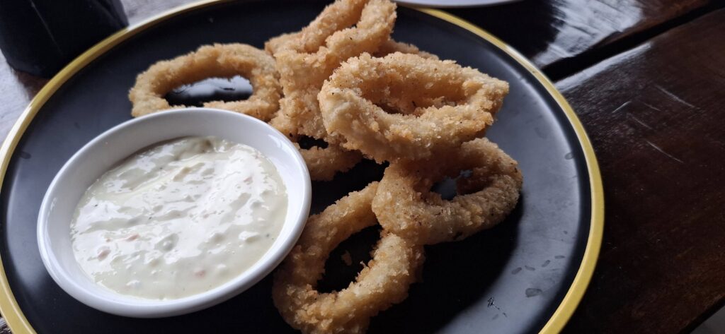 When it was time to head into town for some liquid refreshments, we started at Sloppy Joe’s. I was happy to see the kitchen was open because I was feeling a little hungry. Lots of stuff on the menu, but the item I was looking forward to eating, a sloppy joe sandwich, wasn’t listed. Swan suggested we wait and eat at Mugshots, but I got an order of squid rings to tide me over.
