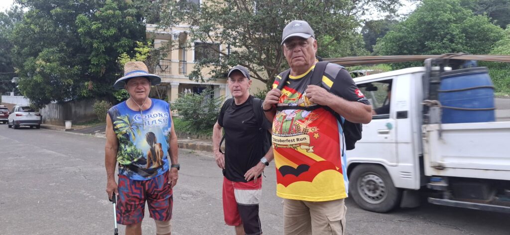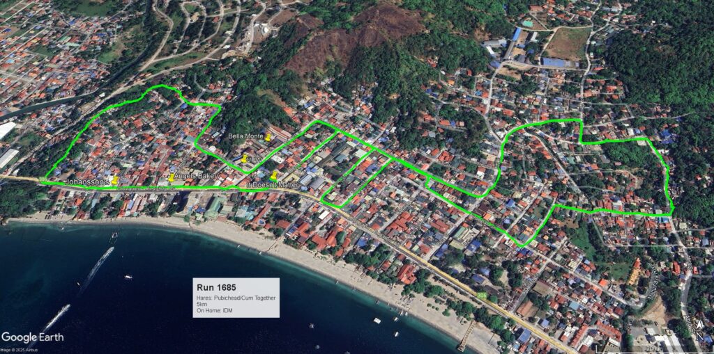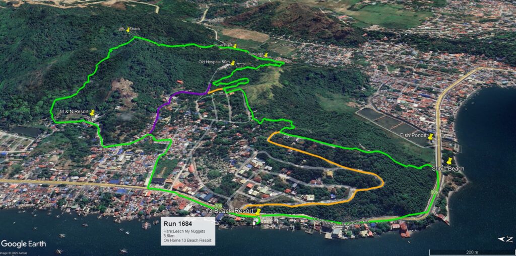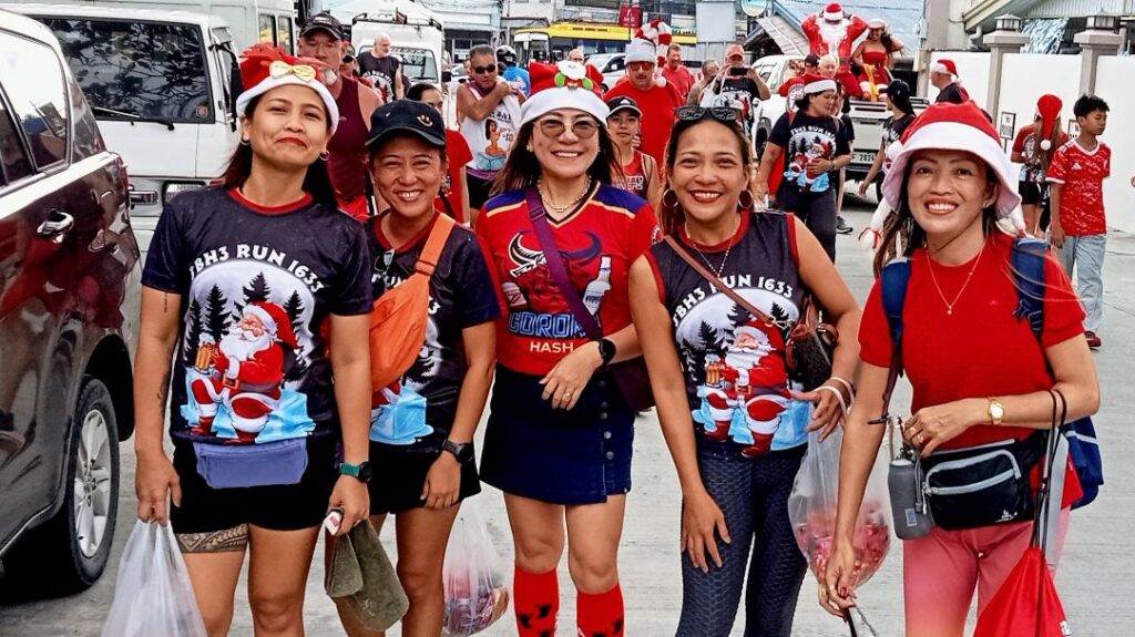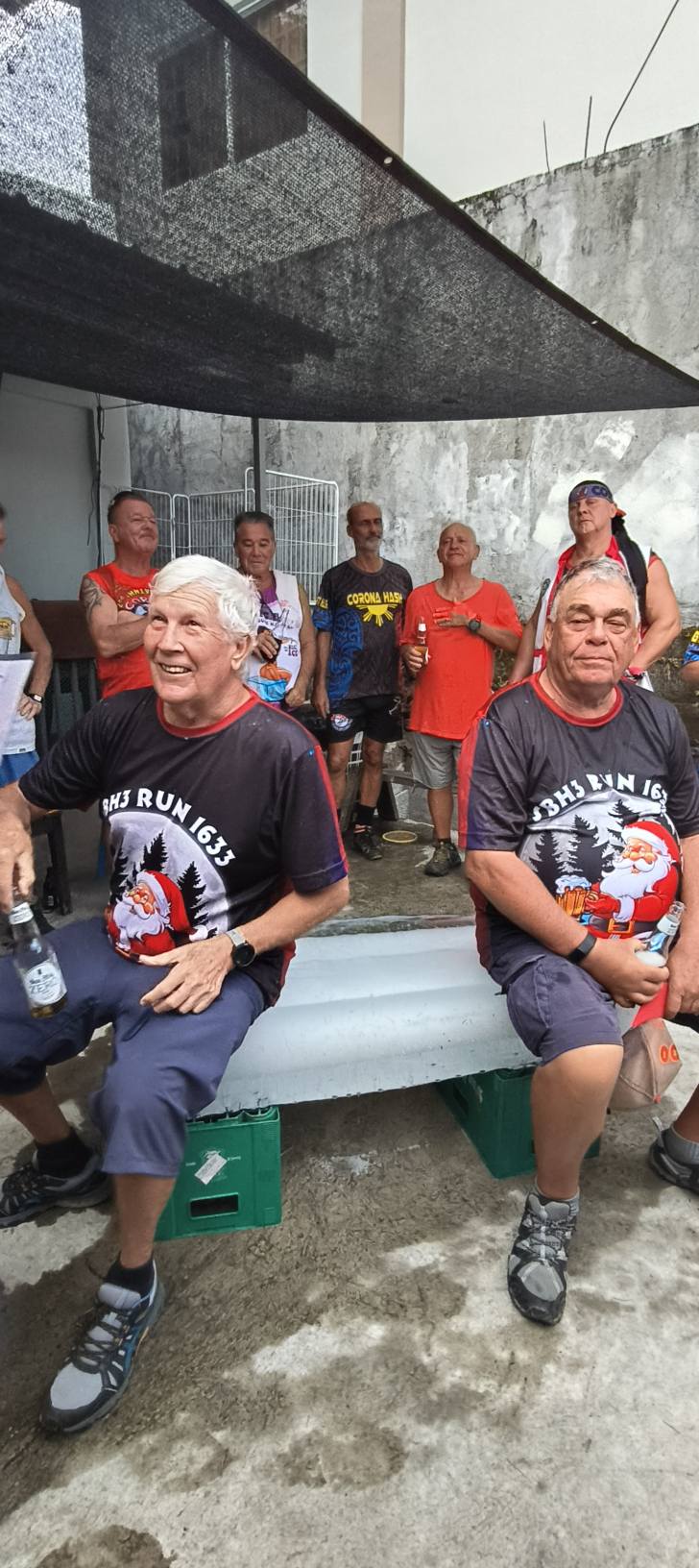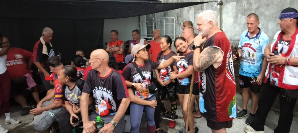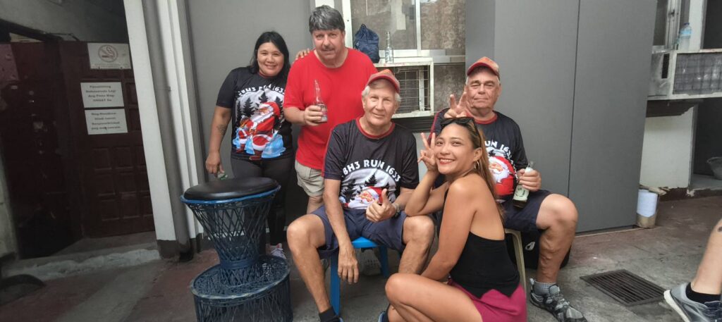 Leech My Nuggets did his usual fine job laying the trail. The purple line was his short version, the orange line was the wimp way.And away we go.On the streets of a nice subdivision.Then into the wild.It was nice having Pubic Head on trail with us again.These Subic Hillbillies were the day’s first cookie recipients.Then we were back on the streets of a local neighborhood.That’s the way it is sometimes.Marching onward.The highway portion of our journey.Years ago, Eagles Bar was a Hash On-Home venue. That was before my time here, but from what I’ve heard, I’m sorry I missed it.Arriving at yesterday’s On-Home.That view from 13.The Hash Gash table.Me and her.Pubic Head and I enjoying the view.Circle up!Meanwhile, this was happening.Going down.Over and out.The after-Hash gathering at It Doesn’t Matter.Being serenaded by some Christmas carolers.