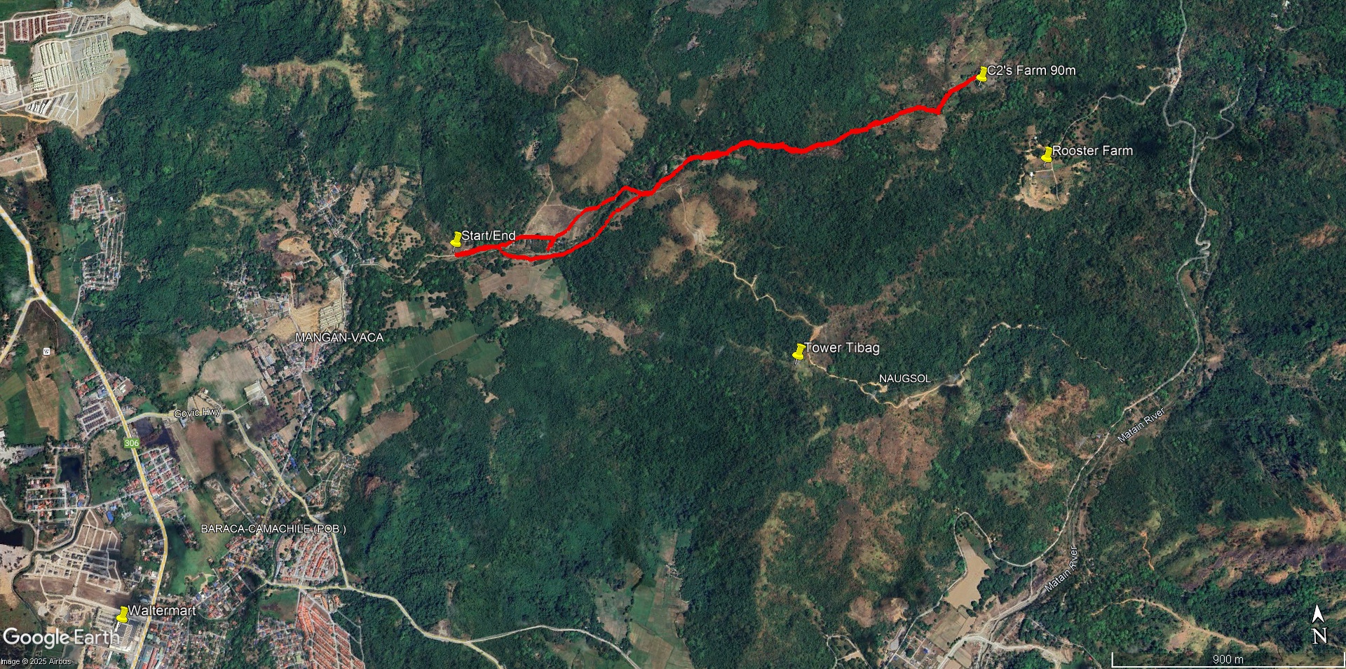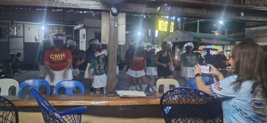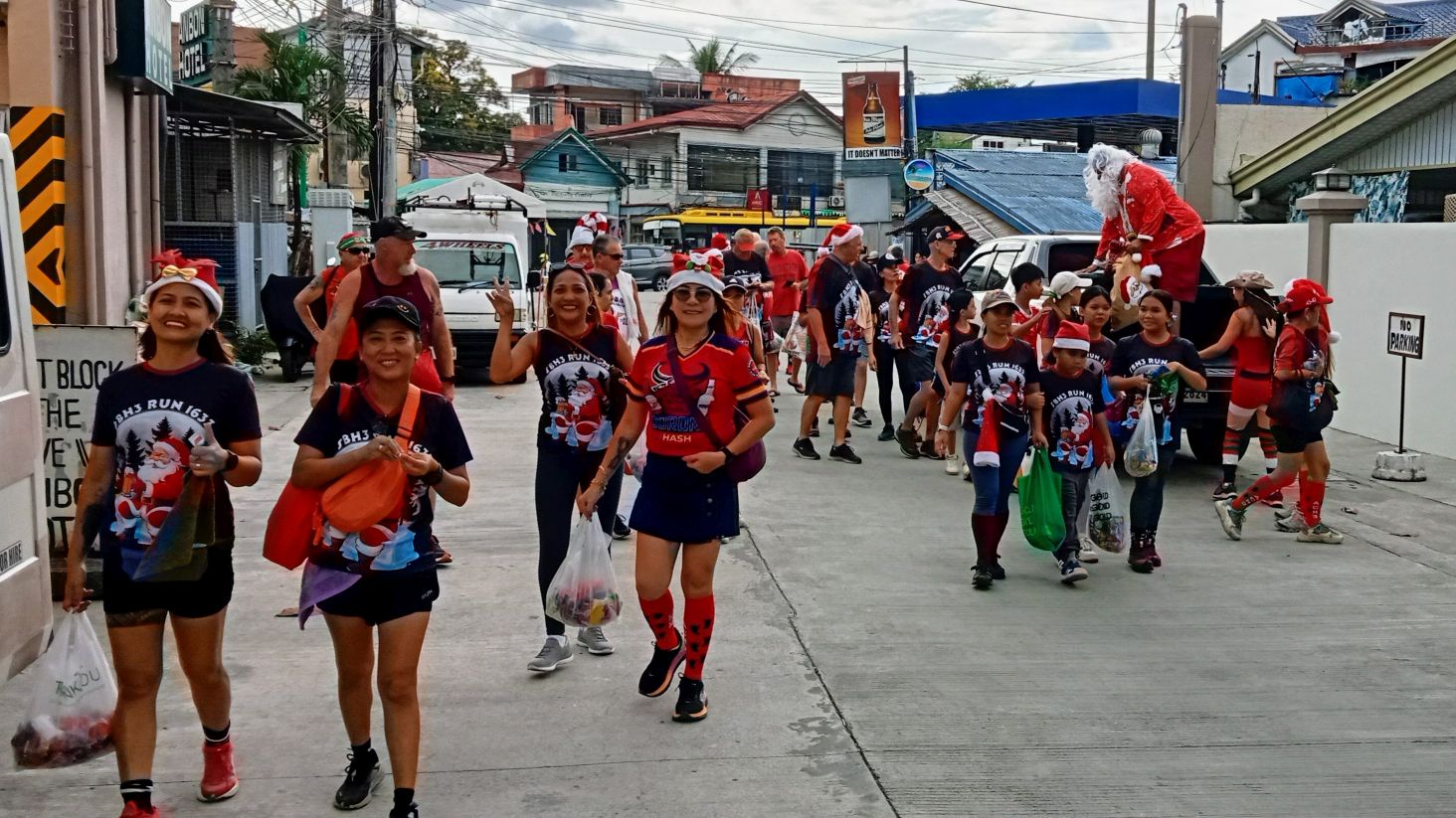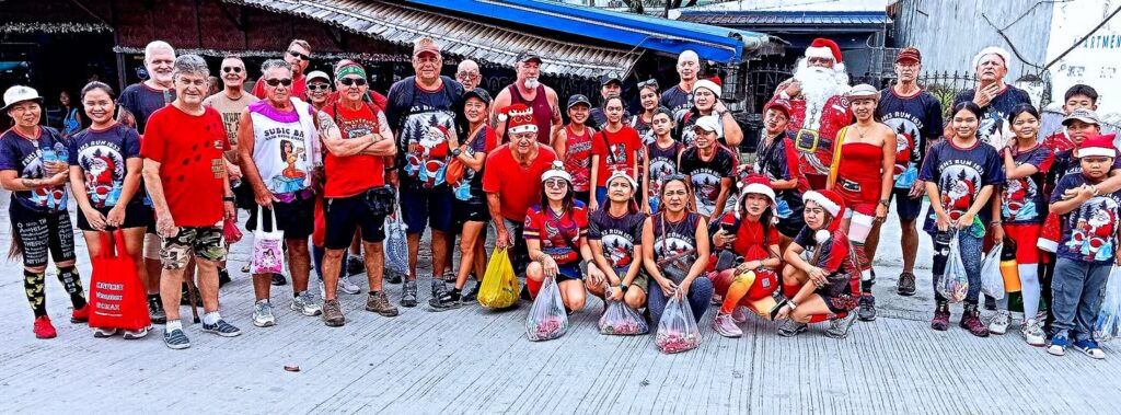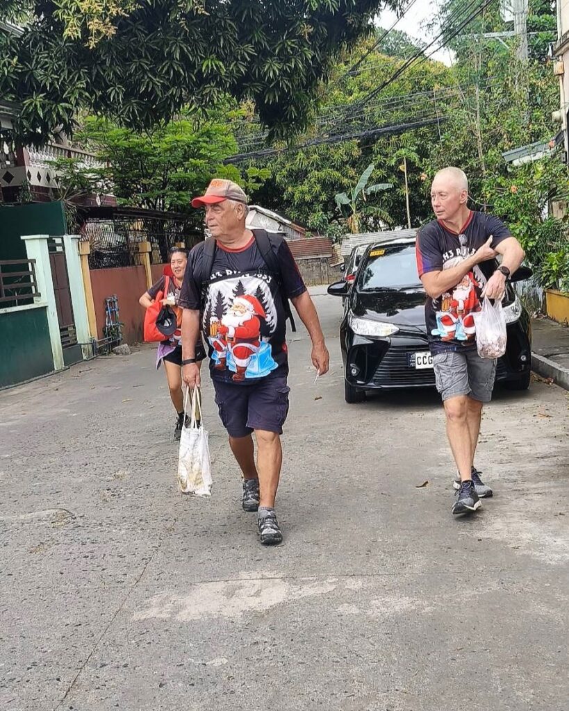 Leech My Nuggets did his usual fine job laying the trail. The purple line was his short version, the orange line was the wimp way.And away we go.On the streets of a nice subdivision.Then into the wild.It was nice having Pubic Head on trail with us again.These Subic Hillbillies were the day’s first cookie recipients.Then we were back on the streets of a local neighborhood.That’s the way it is sometimes.Marching onward.The highway portion of our journey.Years ago, Eagles Bar was a Hash On-Home venue. That was before my time here, but from what I’ve heard, I’m sorry I missed it.Arriving at yesterday’s On-Home.That view from 13.The Hash Gash table.Me and her.Pubic Head and I enjoying the view.Circle up!Meanwhile, this was happening.Going down.Over and out.The after-Hash gathering at It Doesn’t Matter.Being serenaded by some Christmas carolers.