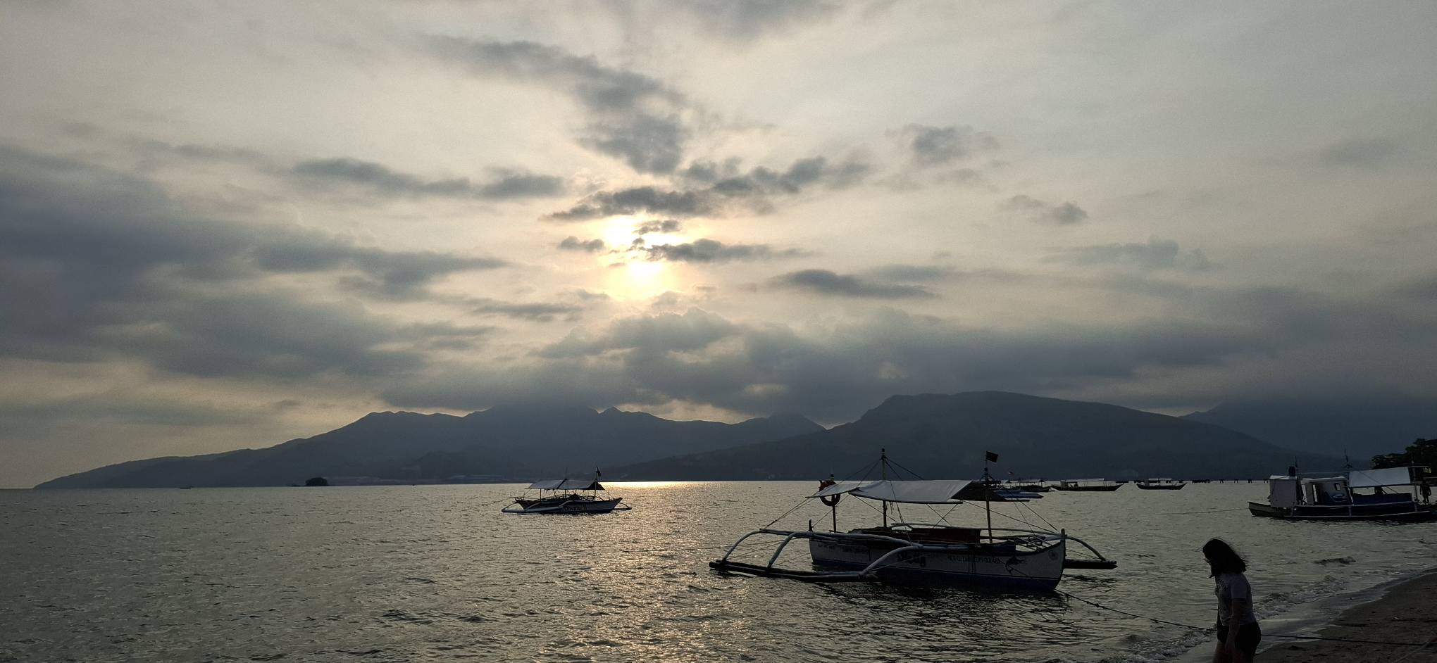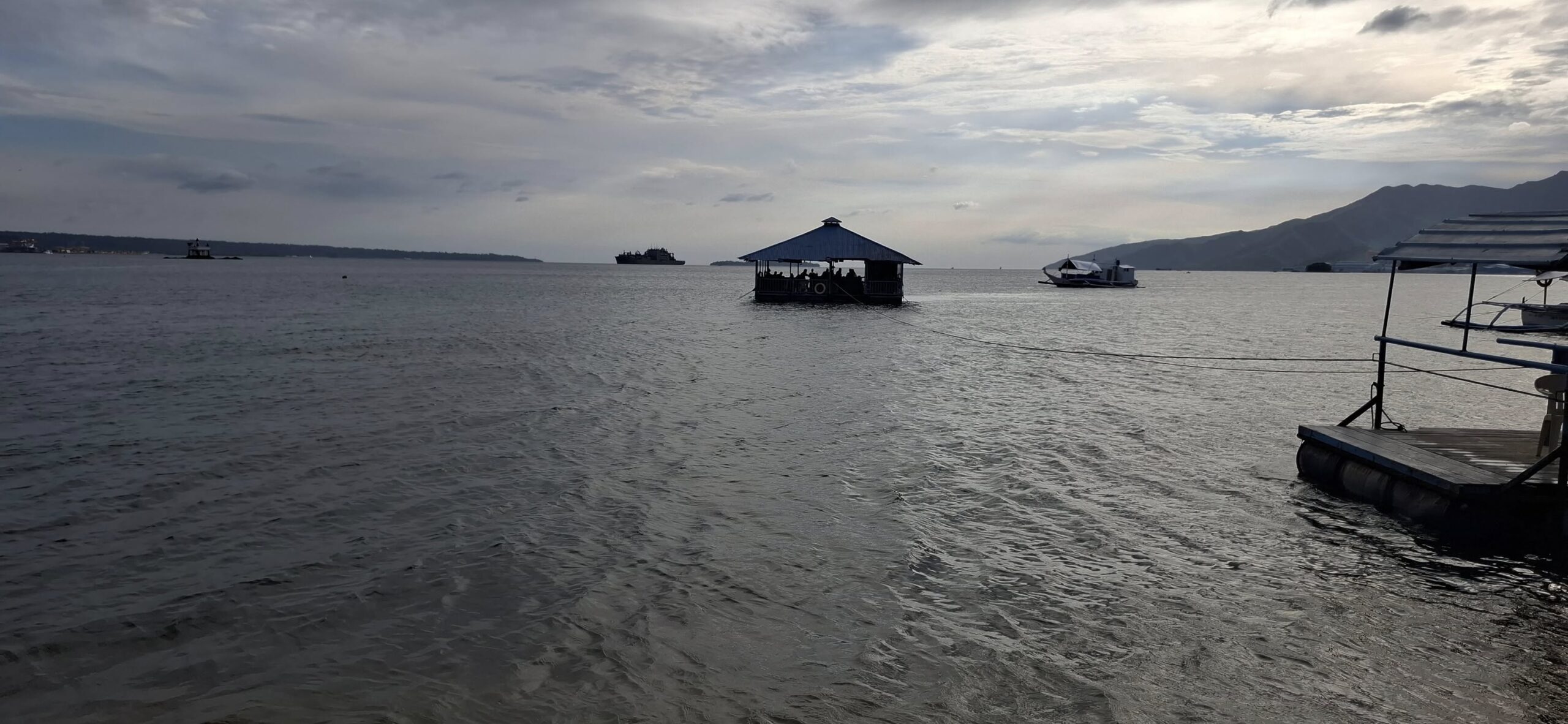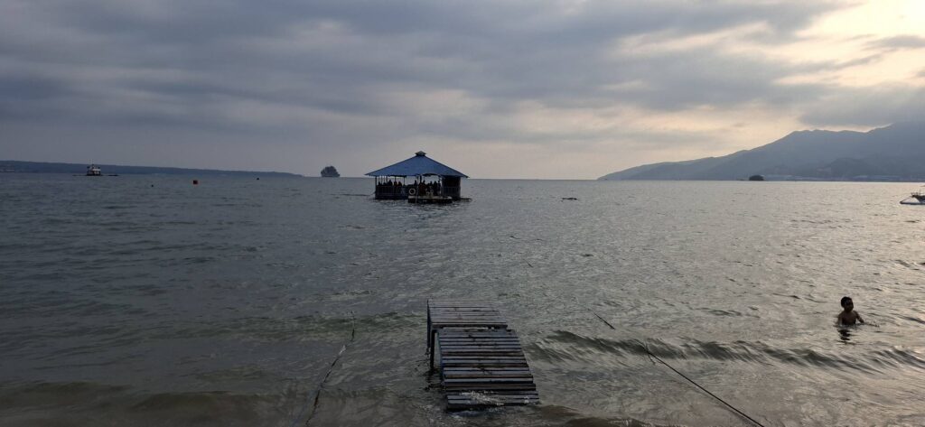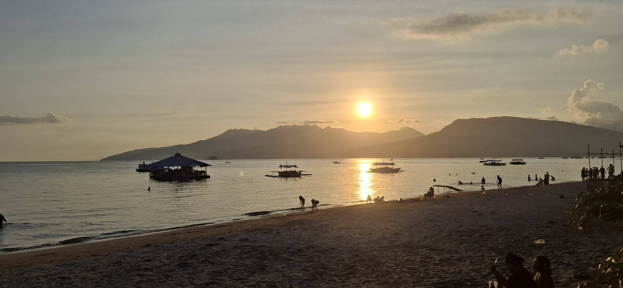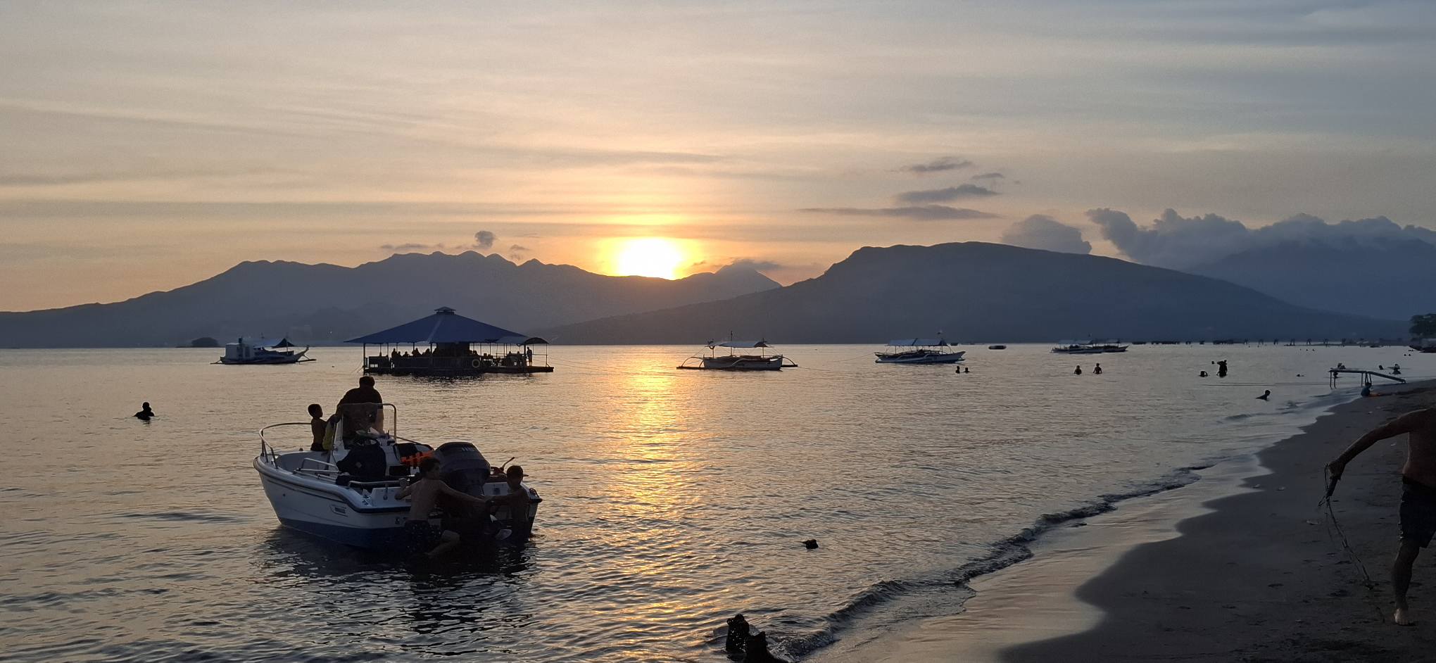 Yesterday was a holiday here (Rizal Day), so the beach was busier than usual.Our destination awaits as we await the arrival of the transport raft.A sun shot from the beach while we waited.I almost always enjoy the ambiance that comes with rockin’ on the water.And then some folks we know came by in their boat. They pulled alongside the floating bar, but didn’t get out. We bought them a drink, and they offered to take us for a spin. I declined, but Swan joined them.Swan returning from her ride.She said it was fun.Meanwhile, I feared those clouds were going to spoil my sunset view.Turns out, I was wrong about that.Going……going……gone!