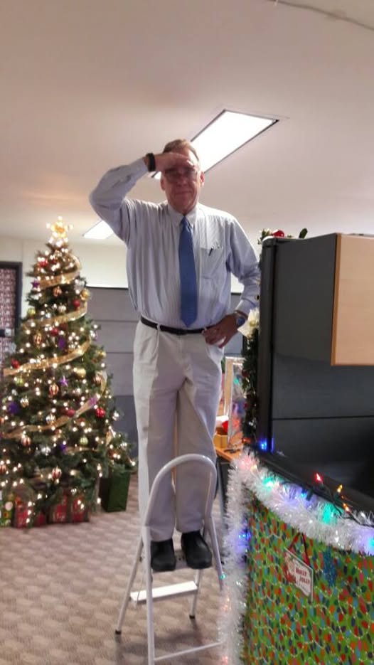 Supervising the decorating of the office for Christmas.