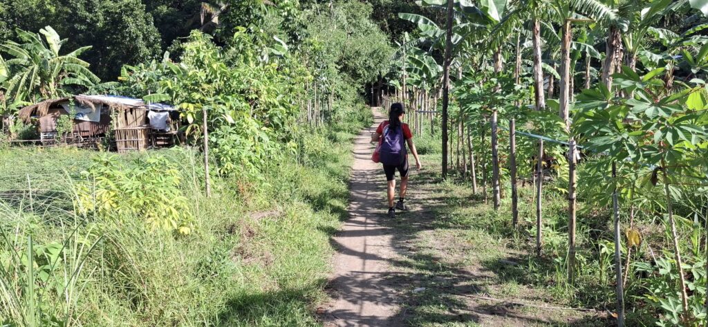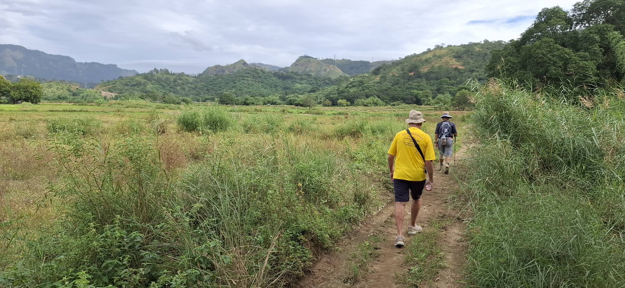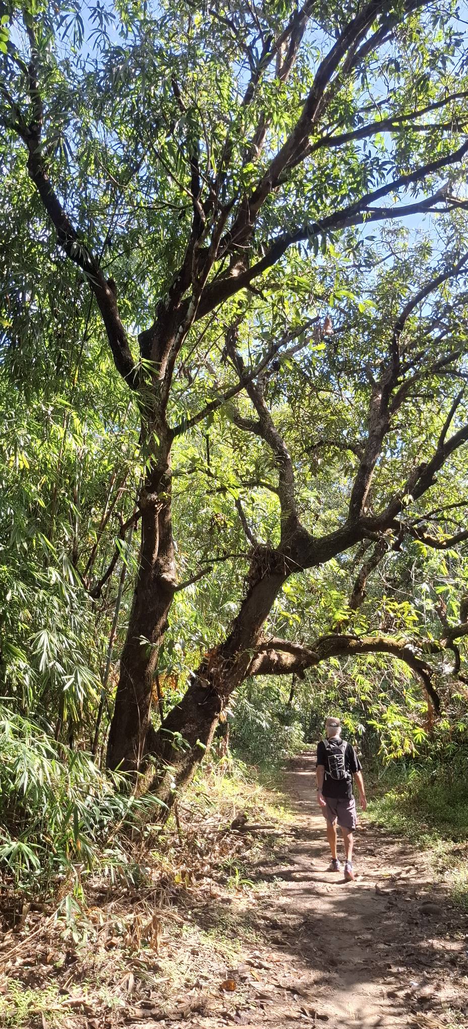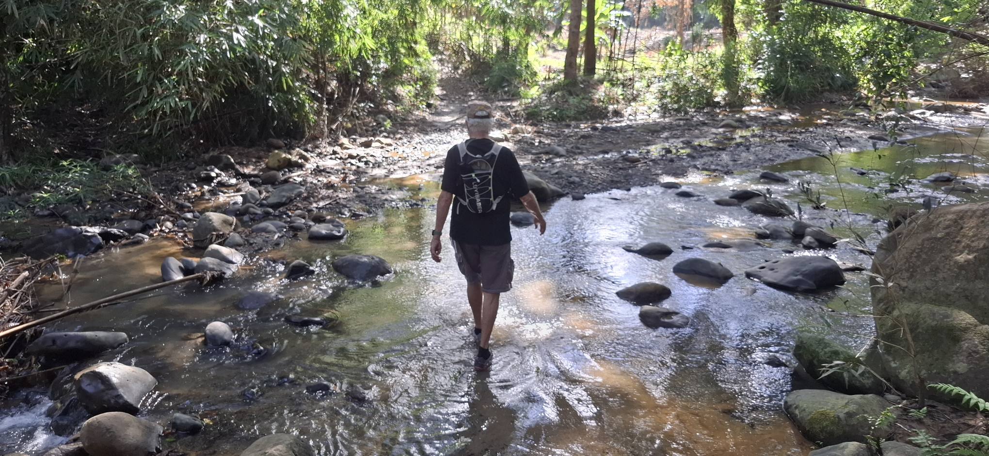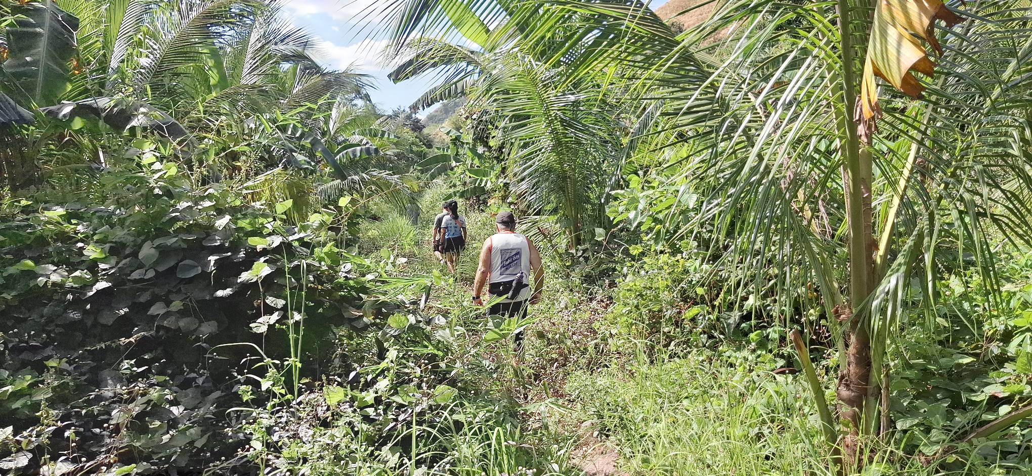 This little sari-sari store was where we bought a bottle of Sprite to help Scott reenergize on our last trip out this way.Our trail was mostly flat, but surrounded by beautiful hills.God appears to be smiling on one of the friendly locals we encountered.Another local was kind enough to guide us to our intended path after we had lost the trail.Nope, not here.A flowering bush that reminded me of gaenalee blossoms in Korea.The first of three water crossings on our outbound trek. We crossed them again on the way back.As I’m wont to say, there’s freedom in wet feet.A tree I liked.Elevation over vegetation.Onward we trek.Walk on!It ain’t much, but how much do you need to be happy?I’d say that qualifies as a waterfall.Sweets for the sweet.The final wet feet on our hike.There and back again was a 6K journey.