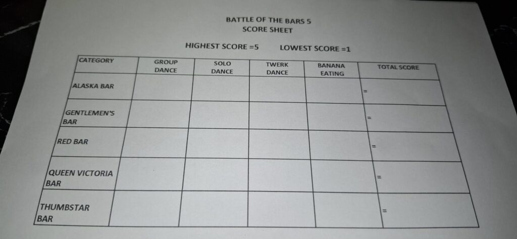 The highlight of my day was attending the Battle of the Bars, which I call “the BOB” as it seems to be a derivative of the recently deceased SOB. It’s a dance contest featuring girls from five bars, although the format was a little different from what I’m accustomed to.