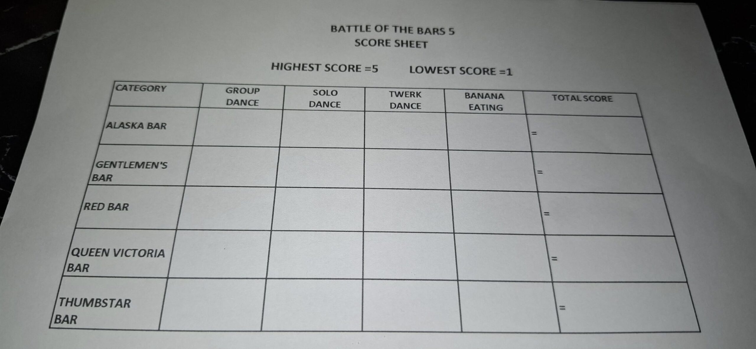I was given a score sheet to judge the contest, with each team competing in four events.