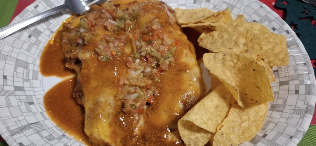 The Christmas vibe permeated our table top.Sorry, no birria for you!I went with the beef enchiladas. Spicy they were!