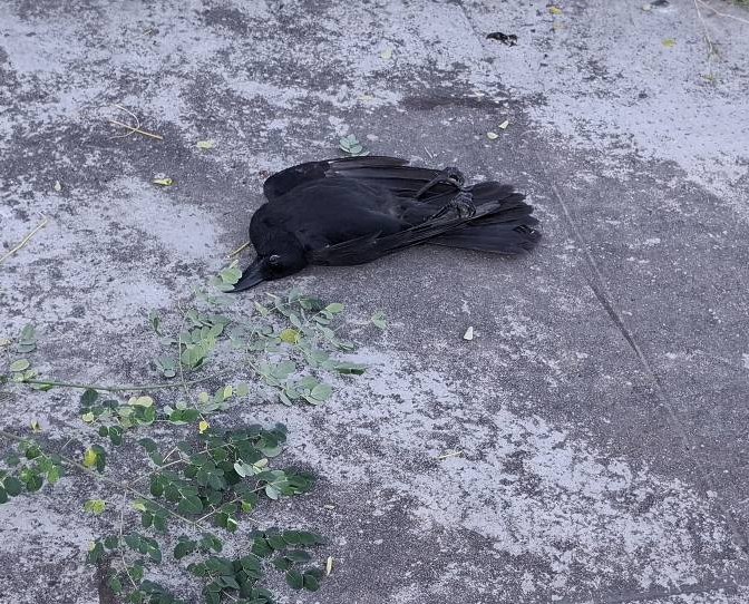 As seen on the sidewalk during my morning dog walk. No idea what killed it, but I’m thinking that branch might be a clue.
