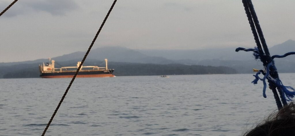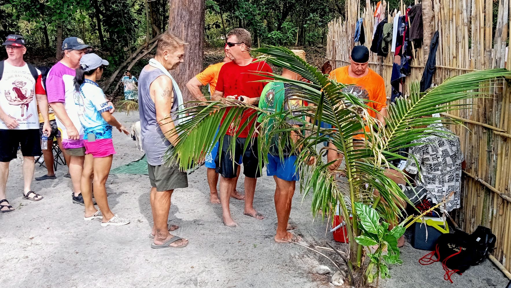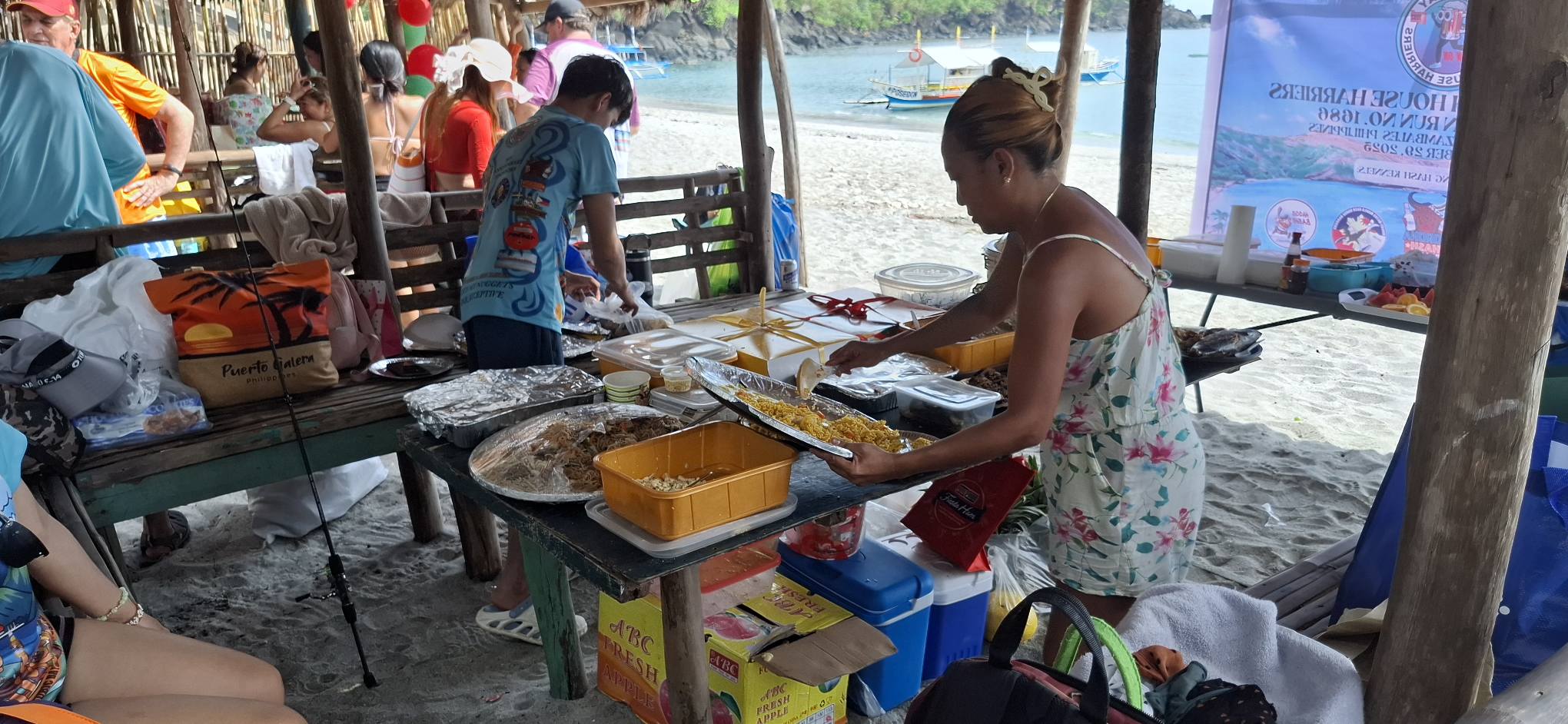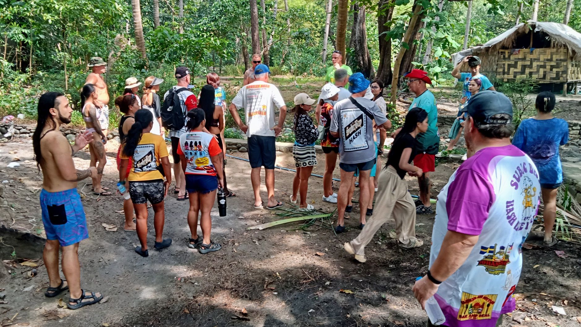 I awoke to hazy skies. Most of it had burned off by the time we arrived in Sampaloc.How much beer will 100+ Hashers consume in the course of the day? Here’s what we brought with us.Gathering on the beach at Treasure Island prior to boarding our banca boats. Loaded up and ready to roll, er, float.See you later, Baloy!Sampaloc here we come!The way ahead.My boat mates.The Philippine Navy has a shipyard on the bay.Hyundai is now running the former Hanjin shipyard.Sampaloc Cove is just around that peninsula point in the bay.I was intrigued by these dwellings on the hillside: no road access and no beach for a boat landing. However you get there, it must make for a hard life.The lighthouse where the bay meets the sea.Goodbye Subic Bay and hello South China Sea!And up ahead is the cove they call Sampaloc.Our venue for the Hash Outstation awaits.Disembarking on the sands of Sampaloc.More boats on the cove.Let’s do this!Lining up to pay the Hash fees. 800 pesos per head for all-you-can-eat, drink, and be merry.Hanging out waiting for something else to do.Gathering for the Hare’s guidance regarding the Hash trail.And we are On-On!Heading for the good kind of falls.Some nice scenery along the way……no ifs, ands, or butts about it.The waterhole at the top of the trail.There was a nice rockslide into this pool, although I chose not to partake.Fun in the sun.A house in the middle of nowhere.Smoke signals.Why did this chicken cross my path?Perhaps the shortest Hash trail in history.Chillin’ after the hike.A view from my perch.Killin’ time.Setting up the food table.There’s something fishy going on here.Still hanging out in the shade next to the ice chest. I brought my own San Miguel Zero since the Hash couldn’t find any for sale in town.The Hash Gash doing their thing.I was getting bored, and Pubic Head joined me for a beach walk.It’s a whole other world living out here in isolation.Some of the kids we bestowed with cookies and lollipops.Finally, it was time to do the Hash Circle.Having our usual block of ice was not logistically feasible, so we resorted to what the La Union Hash calls a “bucket brigade” and doused the victims with water. I definitely prefer the ice!When the time came to board our boats for the trip back home, I was more than ready to go. Cums Alone got in a quick swim before we departed.Meanwhile, the locals were jumping off rocks.The drunken boat ride back to Baloy.But at least we all made it back alive.A race with the sun on our return journey.A ship heading out to sea.The sun won, and we deboarded in the dark.