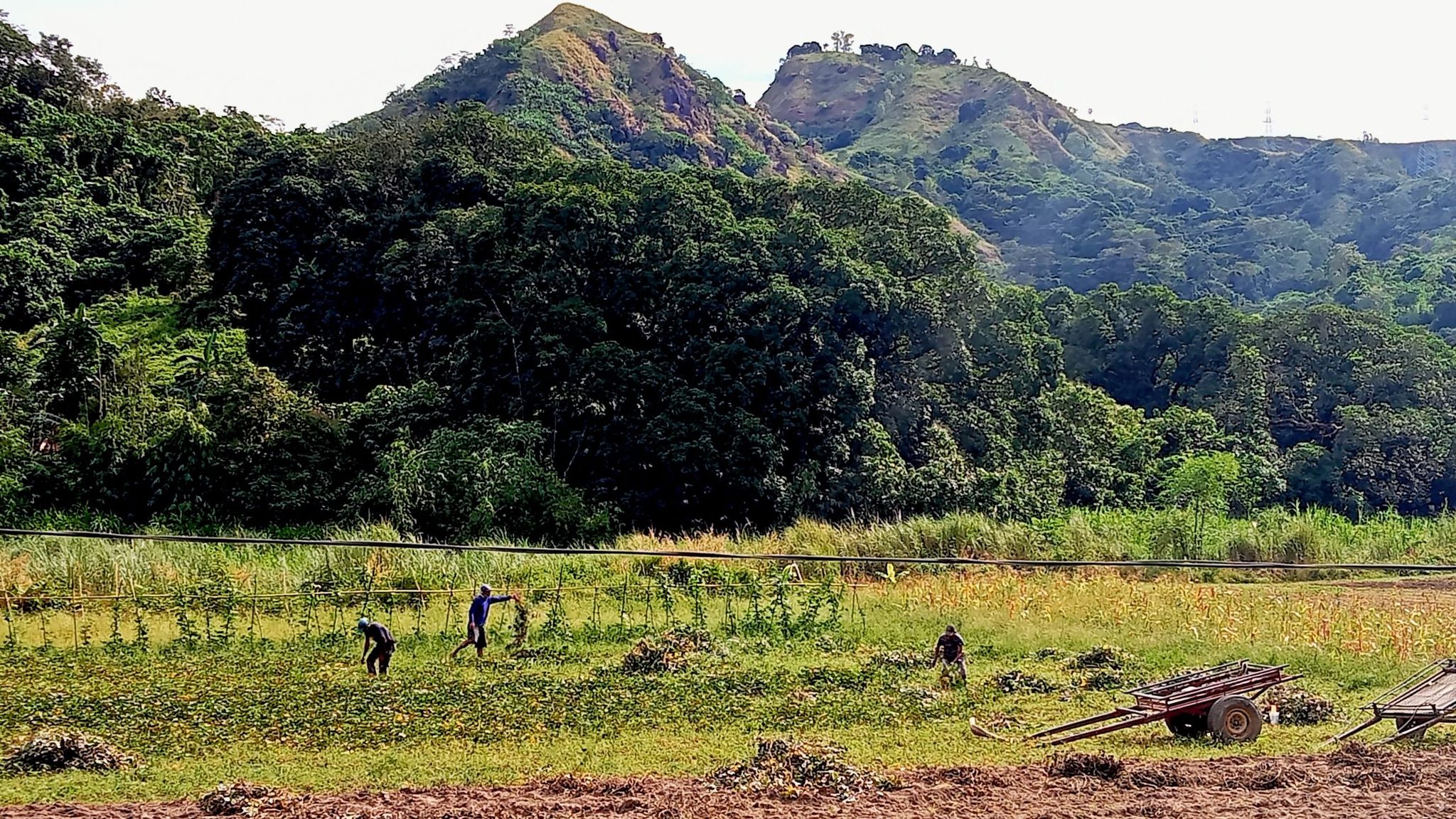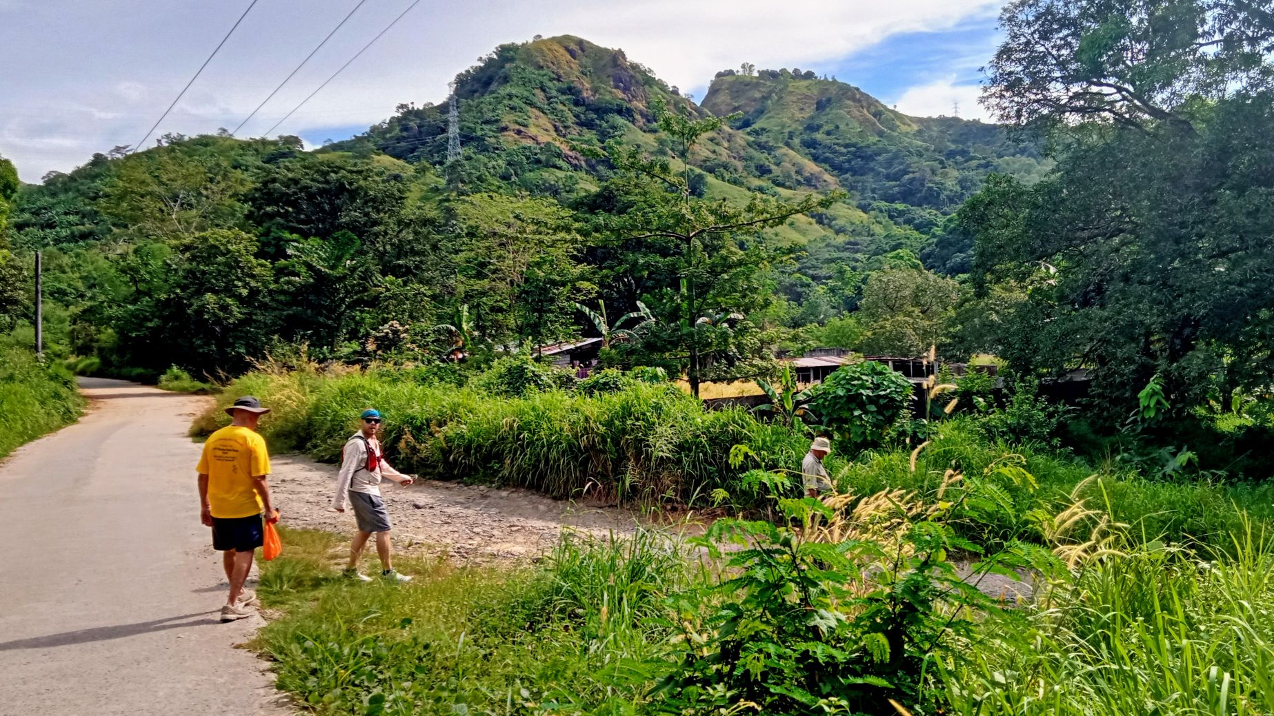 And we are On-On!Down the road……and into the fields.A bushy goat on a rope.Over a squishy suspension bridge that left me feeling a little seasick at the end.That’s the bridge I’m talking about.All the other Subic girls took the long trail, but Swan stuck with me.The flatness of Pozorrubio would probably get boring after a while, but since I was seeing everything for the first time, I enjoyed the views.Passed through lots of farm land.A tree I fancied.Flowers by the riverside were worthy of a photo.We ain’t fast, so near the end of the trail we were bringing up the rear.A horny cow.I know what to do when I come to a fork in the road, but how do you deal with a fork in a post?There was something about this tree I liked.The route we walked.