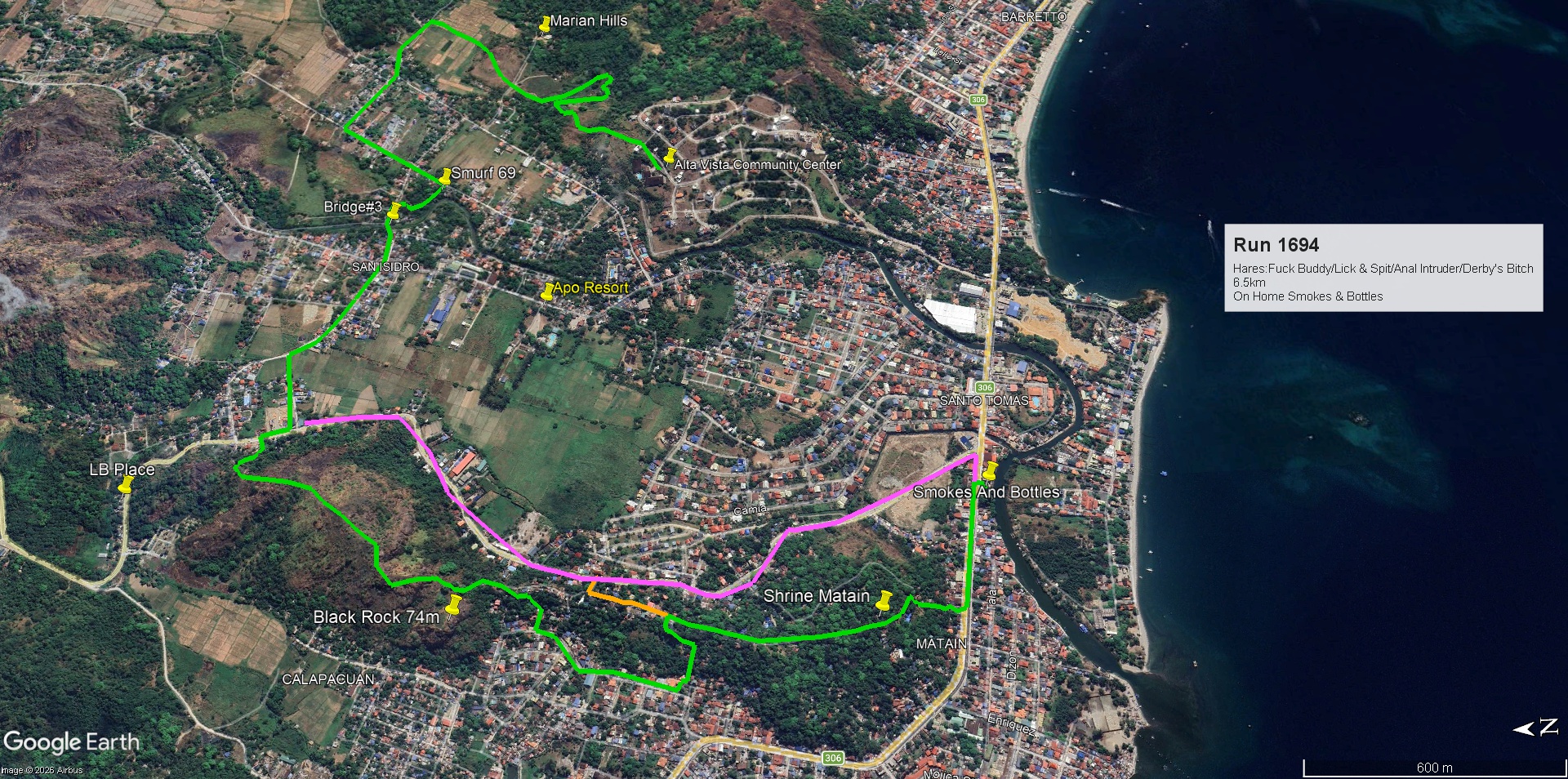 The Harriet’s: Lick and Spit, Fuck Buddy, Derby’s Bitch, and Anal Intruder.Hashers gather at the start in Alta Vista.A cow and a mountain.Getting down!It’s nice on rice!Katchi kapshida!A fairly well-marked trail.The way ahead.On the backroads of San Isidro.A beer stop at Covid 69’s house. I like beer, and I like hiking. But not at the same time. I stuck with water.Back on the trail.Leaking Willy did the long trail and looked tired when he caught up with us short-trail slowpokes.Our come-to-Jesus moment.Our heavenly view.Making our way down to the On-Home at Smokes and Bottles.Hash Gash.Chillin’ before the Circle.Chillin’ on ice in the circle.A Hashy birthday!The long and short of it. My version was just shy of 6K.
