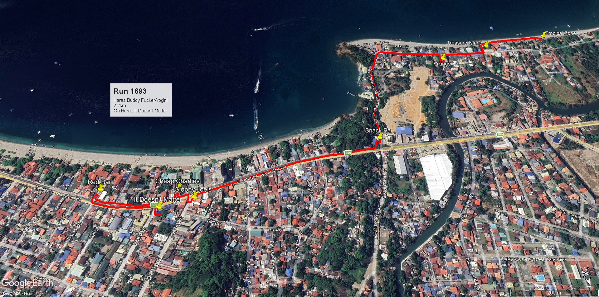 Off we go!Only a month younger than me. RIP Rodolfo.The first of several bridges we crossed on our journey. Also, the sturdiest.The early portion of the trail ran along the banks of the Magnan-Vaca River.Where the long and short trails diverged. Except Leech My Nuggets doesn’t use the term “short.”I’d never been this far down the river before.A new way to go is always nice to find.And here’s another place to go.But I’m not ready to go there yet.The biggest challenge we faced was a series of rickety bridges.Like this one……and that one.I’m happy to report that they all carried the load.The path ahead.A gathering of “cripples.”Sweets for the sweet.Riverboats.I’ve learned to deal with a fork in the road, but what do you do when you encounter two?That old gal doing her laundry is one of my charity projects.We don’t run into her that often, but on the occasions when we do, we slip her 500 pesos. She is raising her deceased daughter’s kids, and it’s a struggle, I’m sure.Now we are on the home stretch.Arriving at Sully’s place.The purple “cripple” trail bypassed the hill climbbefore rejoining the main trail. I enjoyed the riverwalk.Our host for the evening, Sully.Hanging out at Sully’s place.Some Hash Gash.I enjoyed the trail so much that I voluntarily joined the Hare (Leech is on the right) on the ice.It’s nice on ice!And then it was time for the sun to go down……and another Hash came to an end.