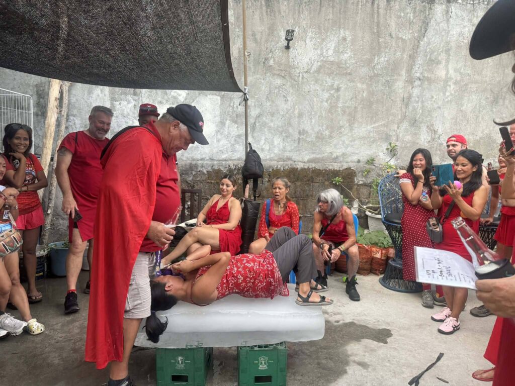 I made the most of my Thirstday this week. Even stayed out past 9 pm, as hard as that may be to believe. Swan and I kicked things off with a pleasant walk through the Naugsol valley. Then I got the good news from Dr. Jo that my blood work was negative for pancreatic cancer. An overdue foot spa to scrape away the dead skin from my feet, followed by beers at Red Bar, Jumpin’ Jacks, and It Doesn’t Matter, before we joined the fifth anniversary celebration at Smokes and Bottles. That’s what I call pushing the boundaries, but then again, you only live once.