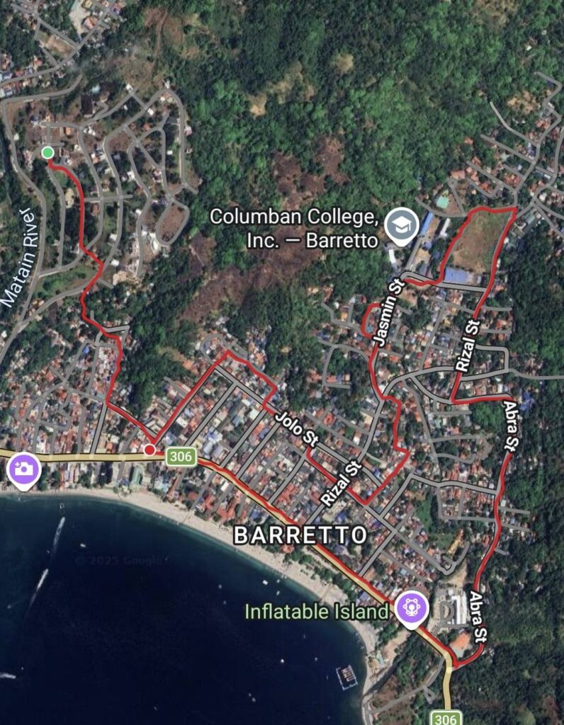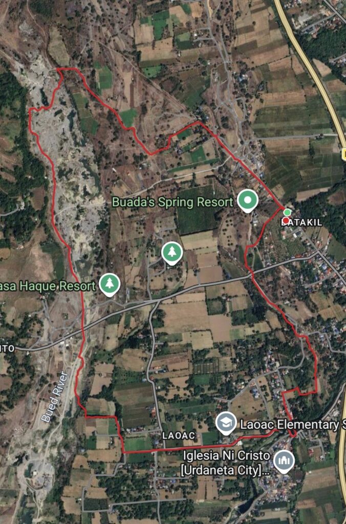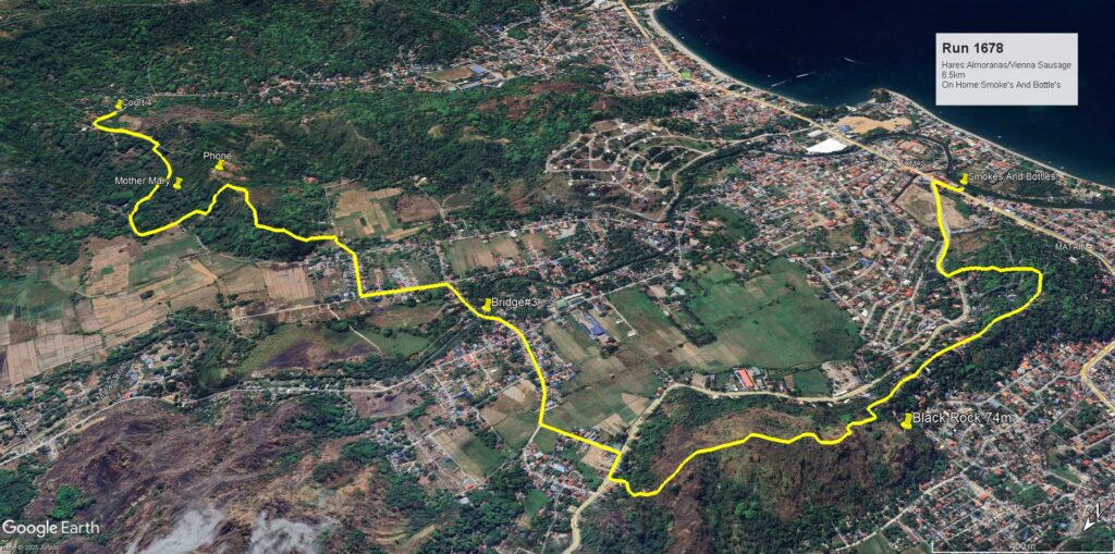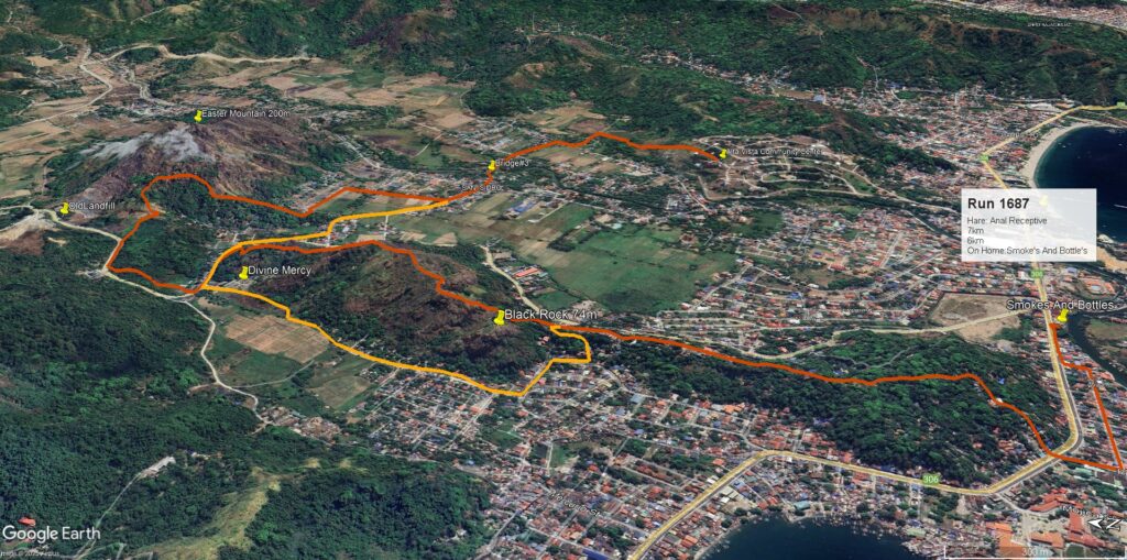 I’m pretty sure the shortcutters outnumbered the Hashers who did the whole trail.Off we go, headed up Rizal Extension.Heading for the hills.Upsy daisy.Splendor in the grass.A woodsy vibe.Does anyone remember postcards?Homemade shade.Out of the hills in Marian Hills (yeah, the village itself is flat).Anal Receptive was the first long-trail runner to pass our group.Getting it done. A climb into Alta Vista, then onward to the On-Home at Cyclone Bar.Some Hash Gash at Cyclone.It’s nice on ice!The old farts at the Circle.That’s the trail I did half of…My trail looked like this.