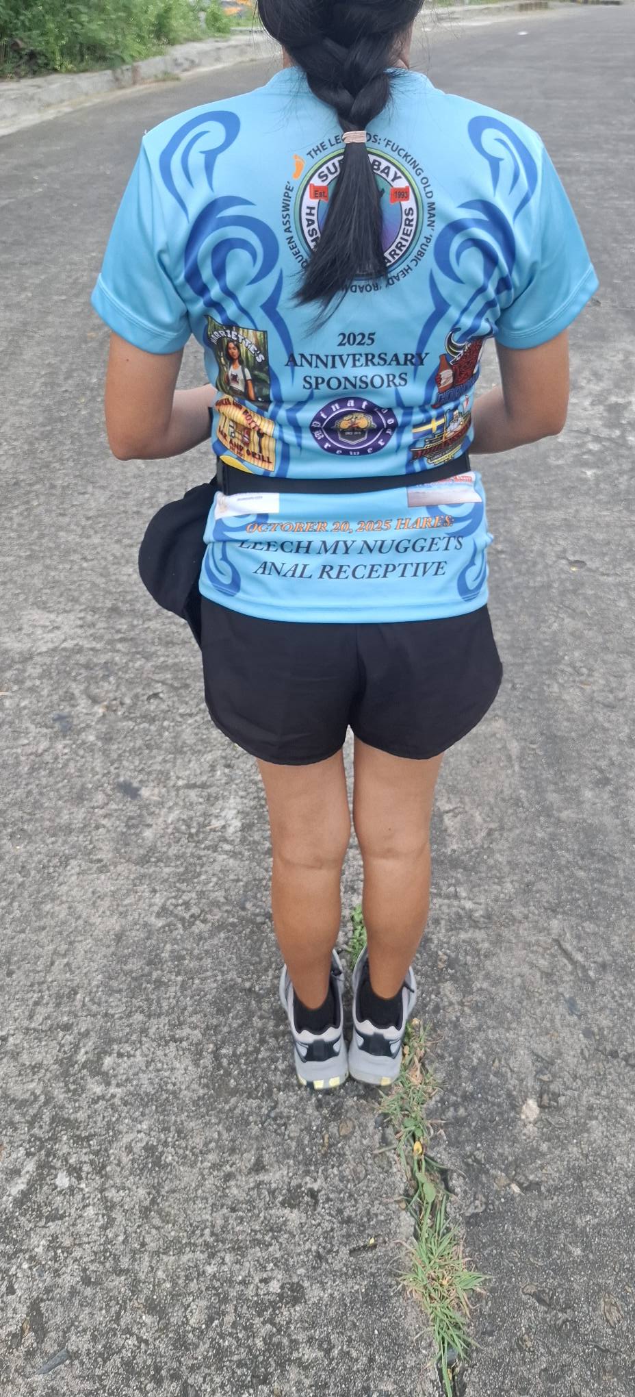 Okay, let’s get to the Hash. There were two trail options: the long at 8 kilometers, and the shorter 7-kilometer version. Seeing as how I’m an older fucker with sore legs, and I had a hangover, I went with the 7K route.
