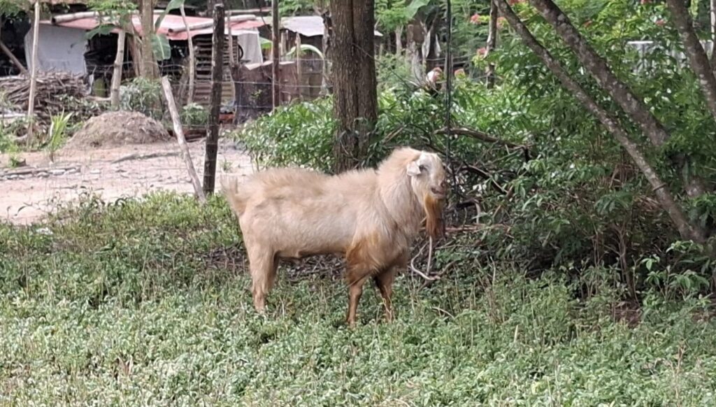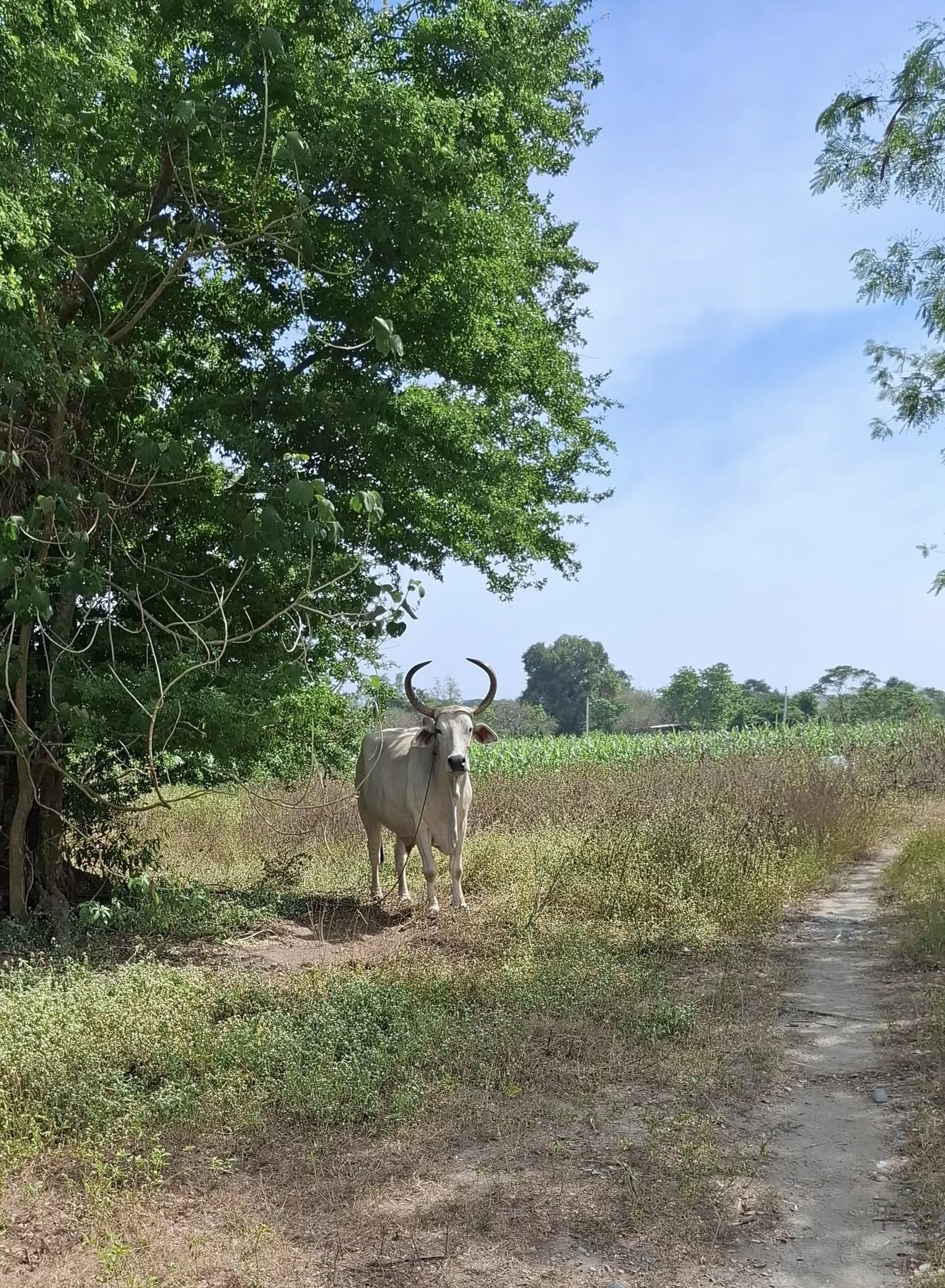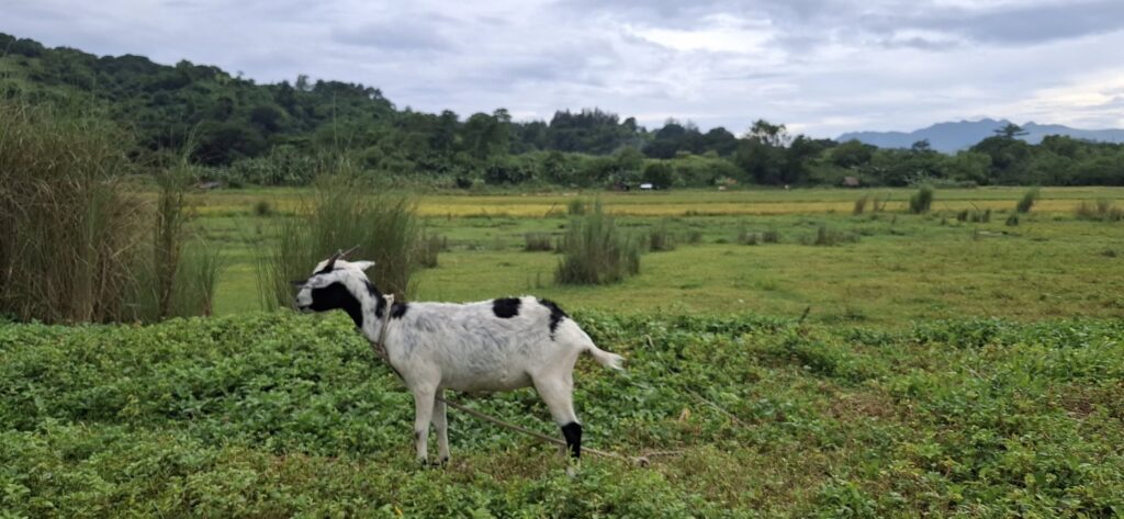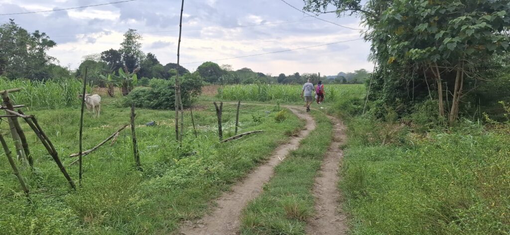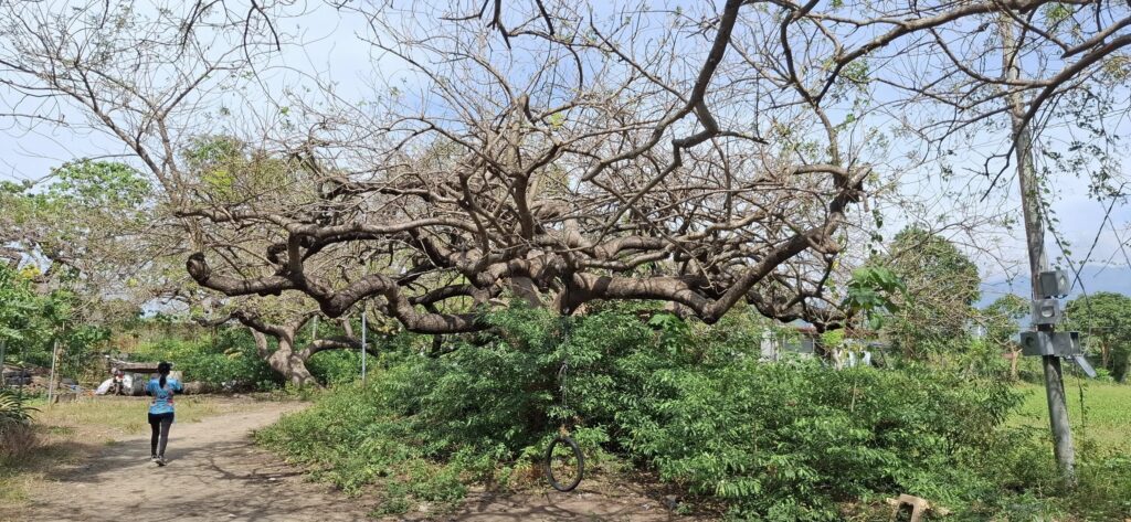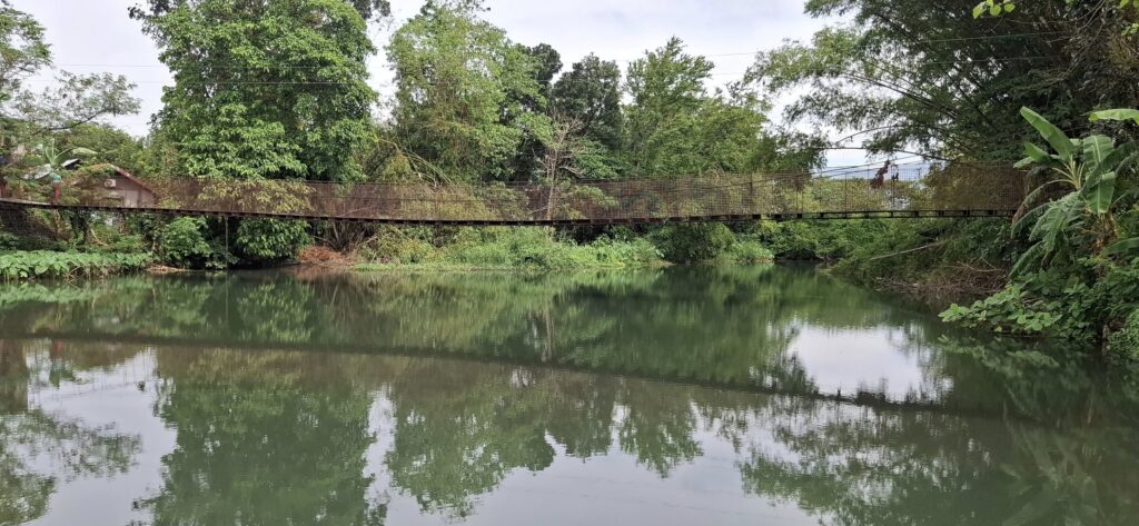 And we are On-On!Down the road……and into the fields.A bushy goat on a rope.Over a squishy suspension bridge that left me feeling a little seasick at the end.That’s the bridge I’m talking about.All the other Subic girls took the long trail, but Swan stuck with me.The flatness of Pozorrubio would probably get boring after a while, but since I was seeing everything for the first time, I enjoyed the views.Passed through lots of farm land.A tree I fancied.Flowers by the riverside were worthy of a photo.We ain’t fast, so near the end of the trail we were bringing up the rear.A horny cow.I know what to do when I come to a fork in the road, but how do you deal with a fork in a post?There was something about this tree I liked.The route we walked.