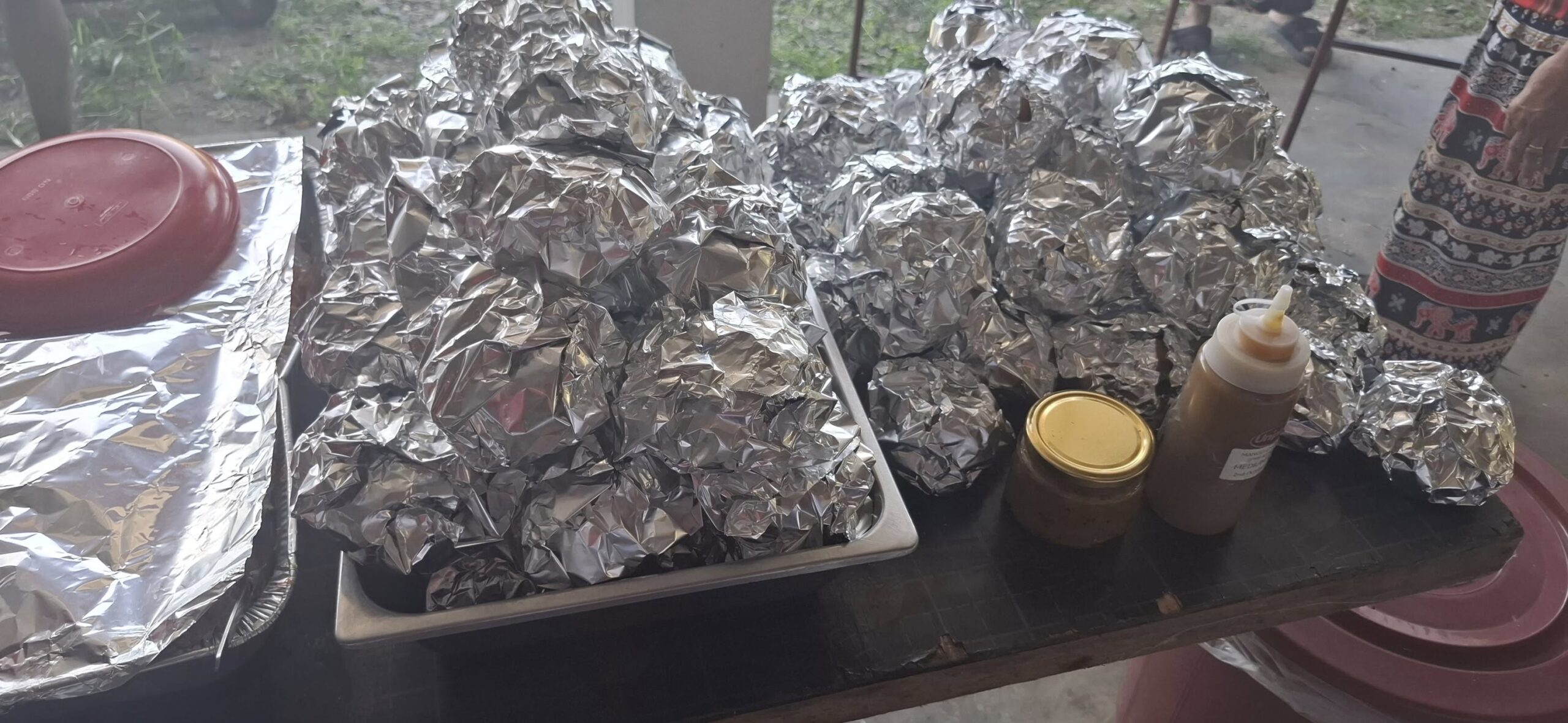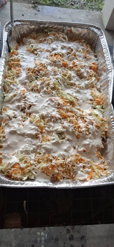 Grillin’.Coleslaw.Diced wieners waiting for some ketchup.Putting it all together.Burgers wrapped and ready to eat.Hungry Hashers waiting for their turn.