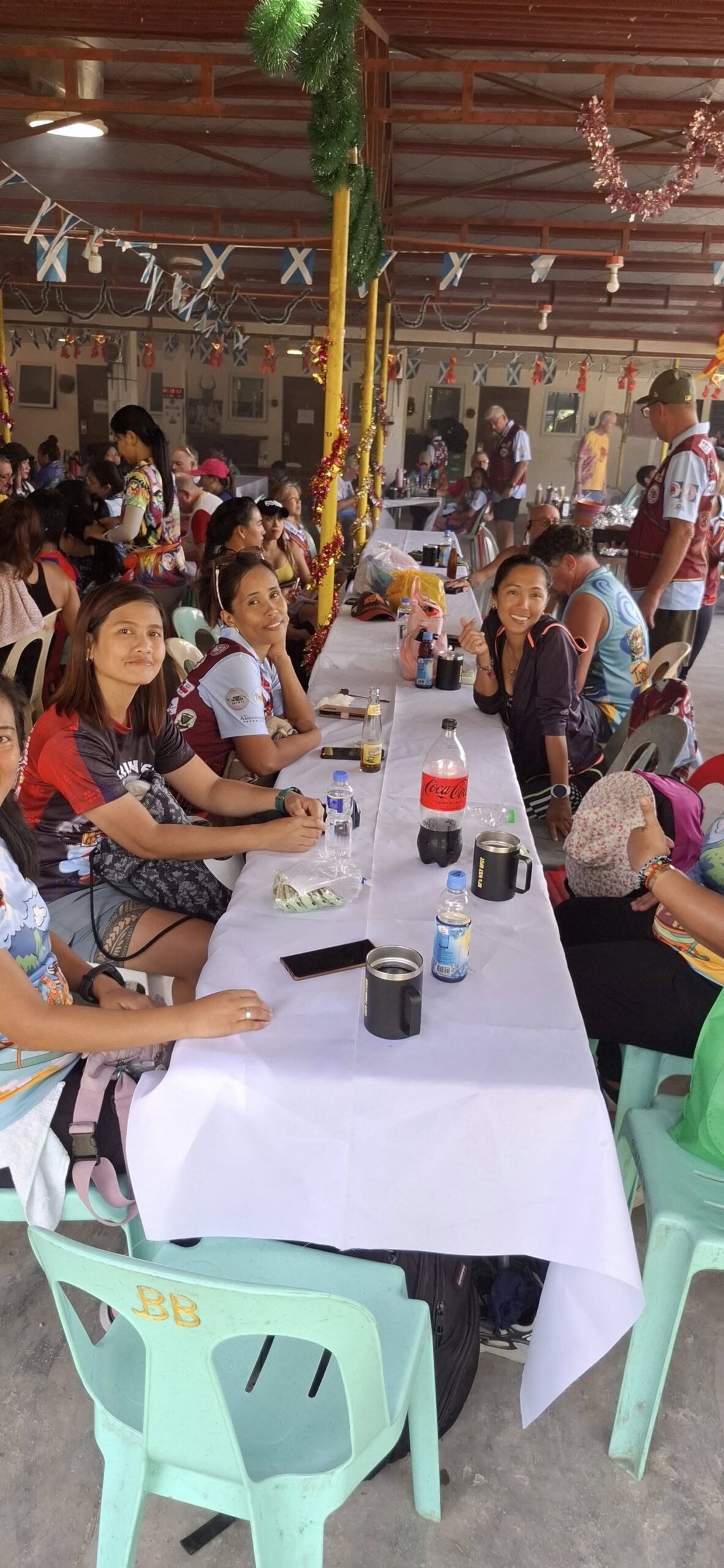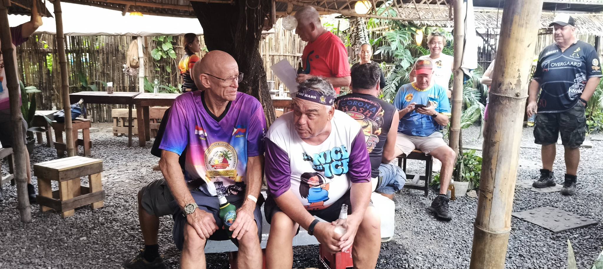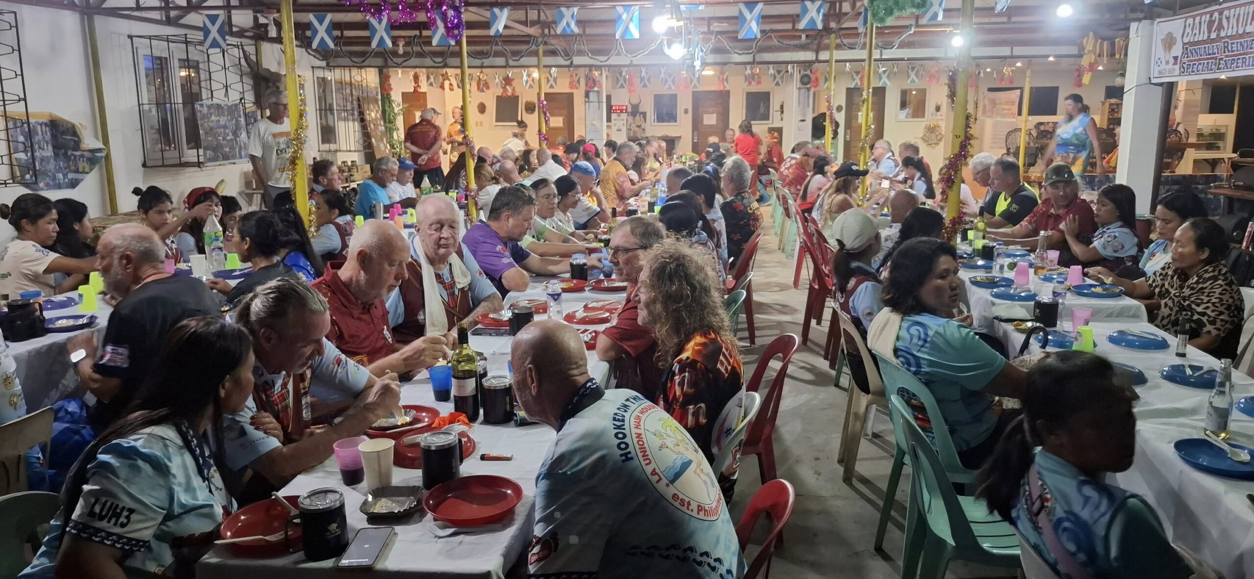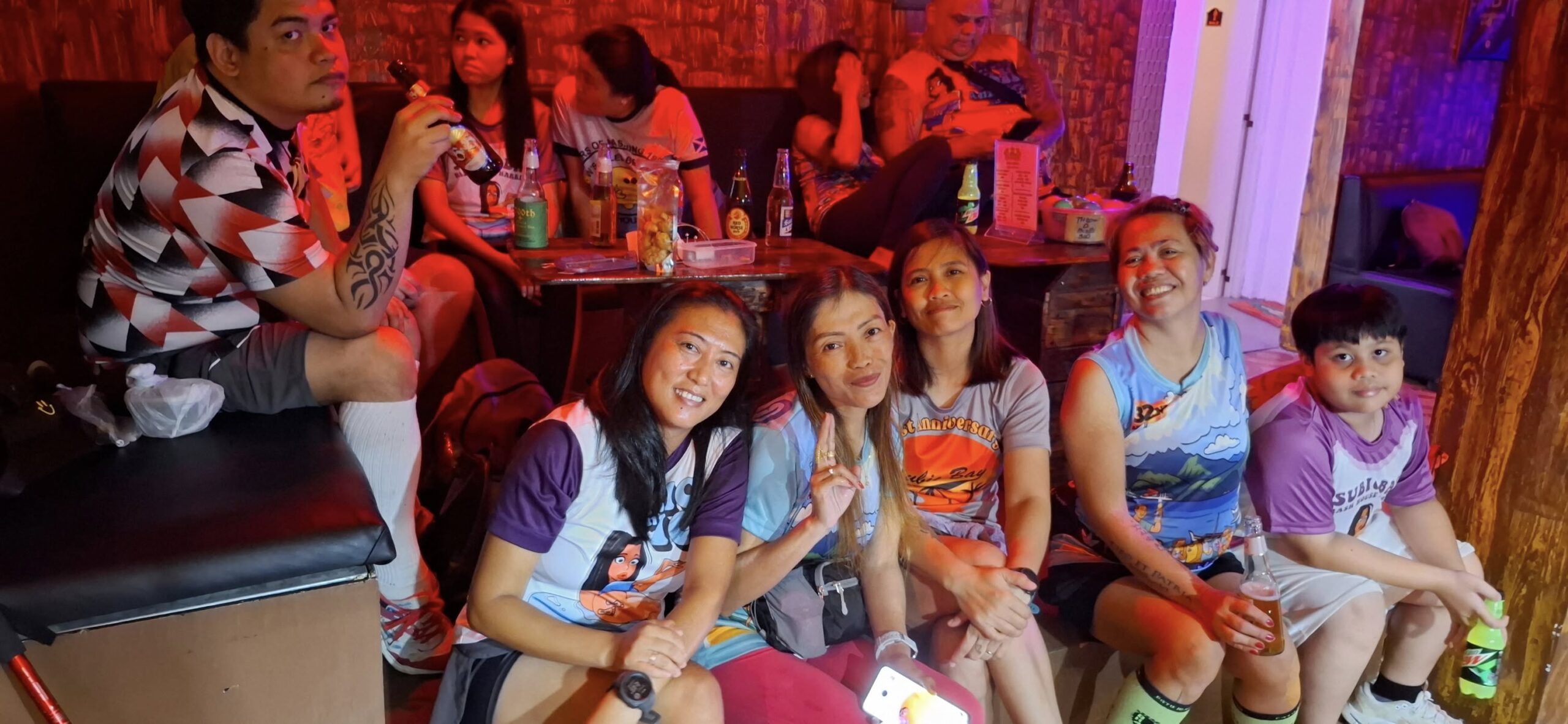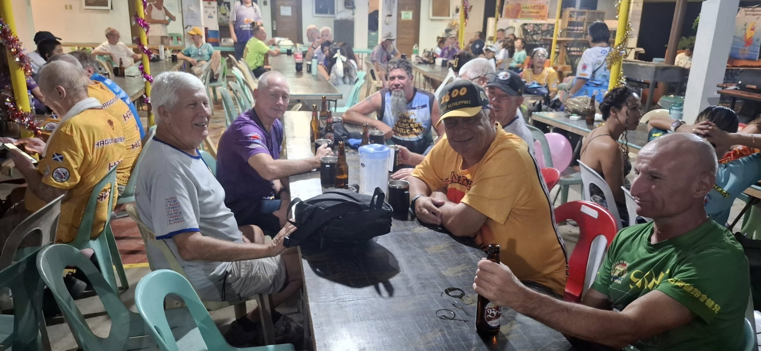 Leech My Nuggets did his usual fine job laying the trail. The purple line was his short version, the orange line was the wimp way.And away we go.On the streets of a nice subdivision.Then into the wild.It was nice having Pubic Head on trail with us again.These Subic Hillbillies were the day’s first cookie recipients.Then we were back on the streets of a local neighborhood.That’s the way it is sometimes.Marching onward.The highway portion of our journey.Years ago, Eagles Bar was a Hash On-Home venue. That was before my time here, but from what I’ve heard, I’m sorry I missed it.Arriving at yesterday’s On-Home.That view from 13.The Hash Gash table.Me and her.Pubic Head and I enjoying the view.Circle up!Meanwhile, this was happening.Going down.Over and out.The after-Hash gathering at It Doesn’t Matter.Being serenaded by some Christmas carolers.
