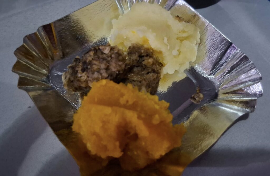 Our meal was introduced with the sweet sound of bagpipes.A small sampling of haggis with potato sides was served as an appetizer. Like a good Scot, I ate all of mine, even though it is not my favorite dish.The dining hall full of hungry Hashers.