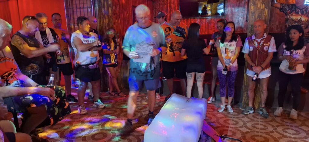 Sir Clitoris at the Tropical Garden.My red “dress” was a hooded cloak.Hashers on the beach, going to the first stop on the bar crawl, Treasure Island.Dressed for suck cess.Our Hash Grandmaster, Buddy Fucker, hails from Montana.Making our way to our second stop, Viking Resort.At Viking.The third venue, SnackBar.That would be Tiny Cunt, looking like, well…Stop #4, Sloppy Joe’s.What’s a Hash without a climb?The 5th venue, Cheap Charlies.The Hash Gash at Cheap Charlies.Red Bar was the last stop on the bar crawl.Then we moved on to It Doesn’t Matter for the Hash Circle.Who’s the breast one?I prefer the real thing.Cums Alone receiving recognition for her 69th Run with the Subic Bay Hash House Harriers.Slippery When Wet got the Hashit this week.It’s nice on ice! Or so the saying goes.