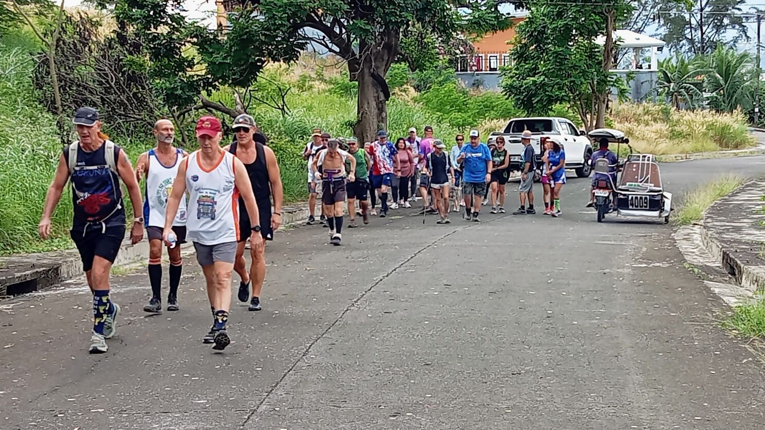 That’s the Hare, Leech My Nuggets, in yellow.A gathering of Hashers awaiting the 2 pm start time.Me and my group said, “Fuck that,” and started a few minutes early. The rest of the Hashers passed me before I was even halfway up the hill.We started with a stroll up Banaba Street. It is steeper than it appears in this photo.And then we left the pavement behind and the real “fun” began.Don’t be fooled. I didn’t take pictures during the steepest parts.The struggle continues.On up!The view from here.I thought I’d found a nice urinal until someone advised it was a water well.One of the three barbed-wire fences we had to overcome.A tree that caught my eye.Another shortcutter who followed my lead for a downhill/flat street walk route.Rollin’ On-Home.Our On-Home venue for the second week in a row.The Hare’s trail is in green, and my “shortcut”is in red.Hanging out before the Circle.Chairs? We don’t need no stinkin’ chairs…On the ice.The old folks zone.