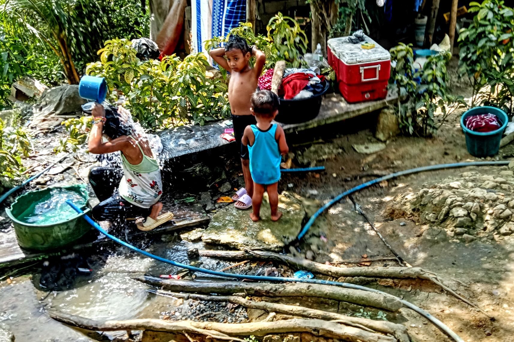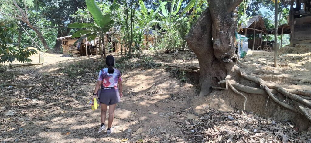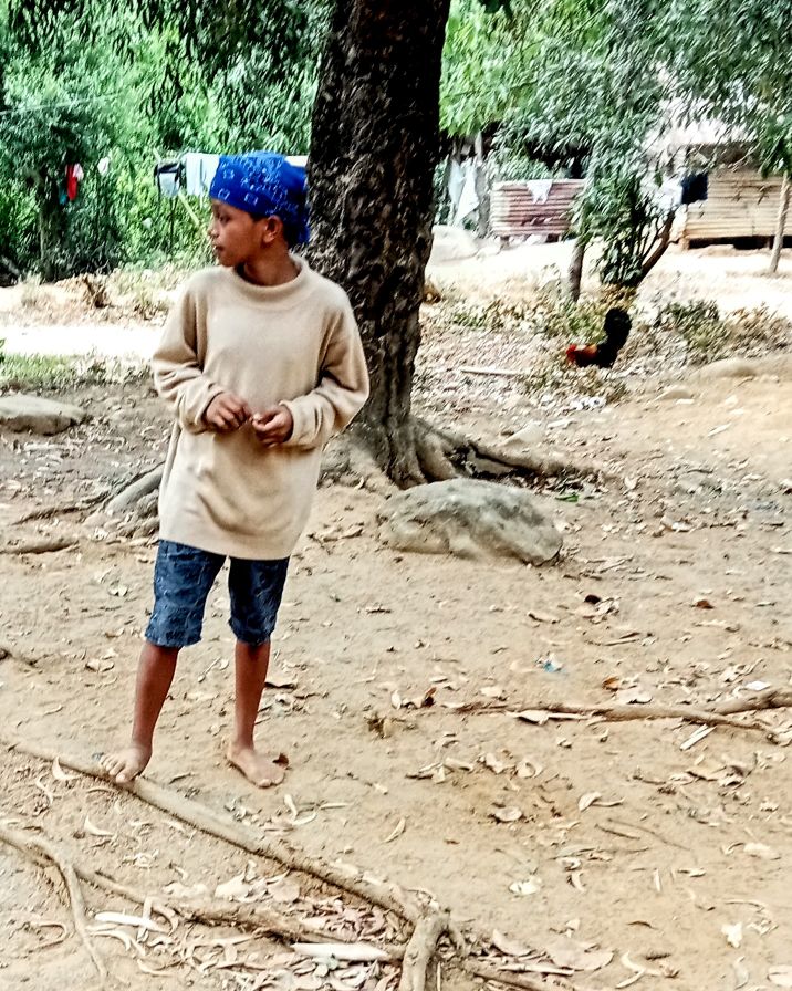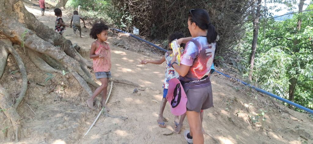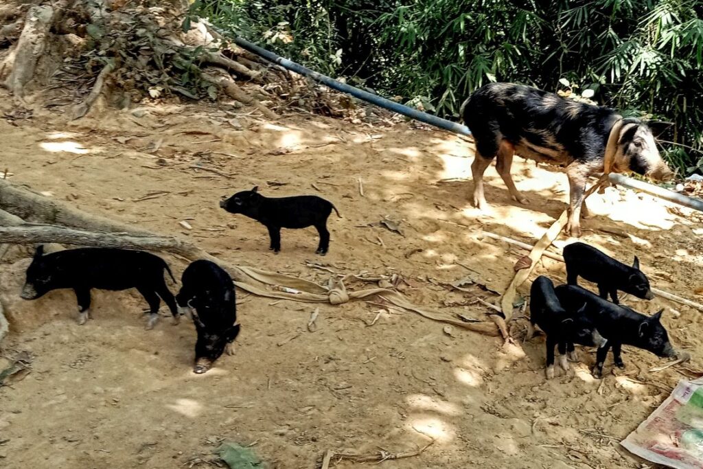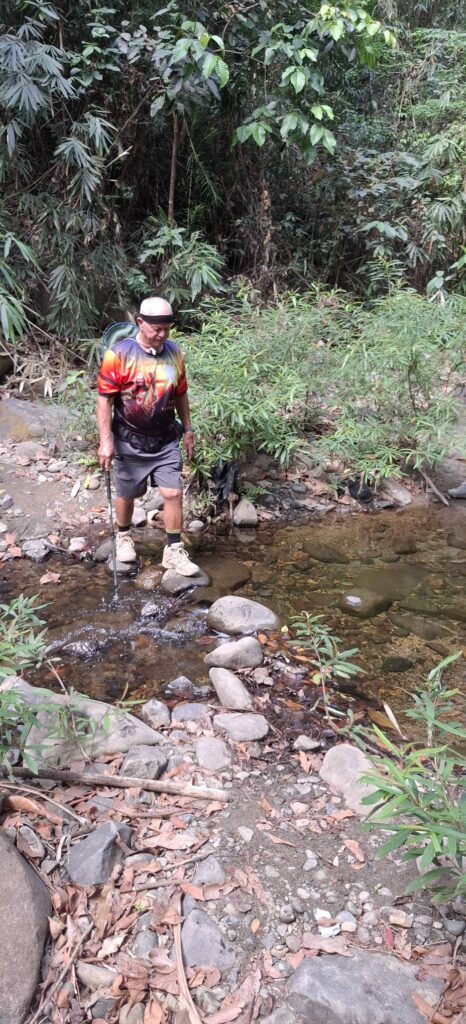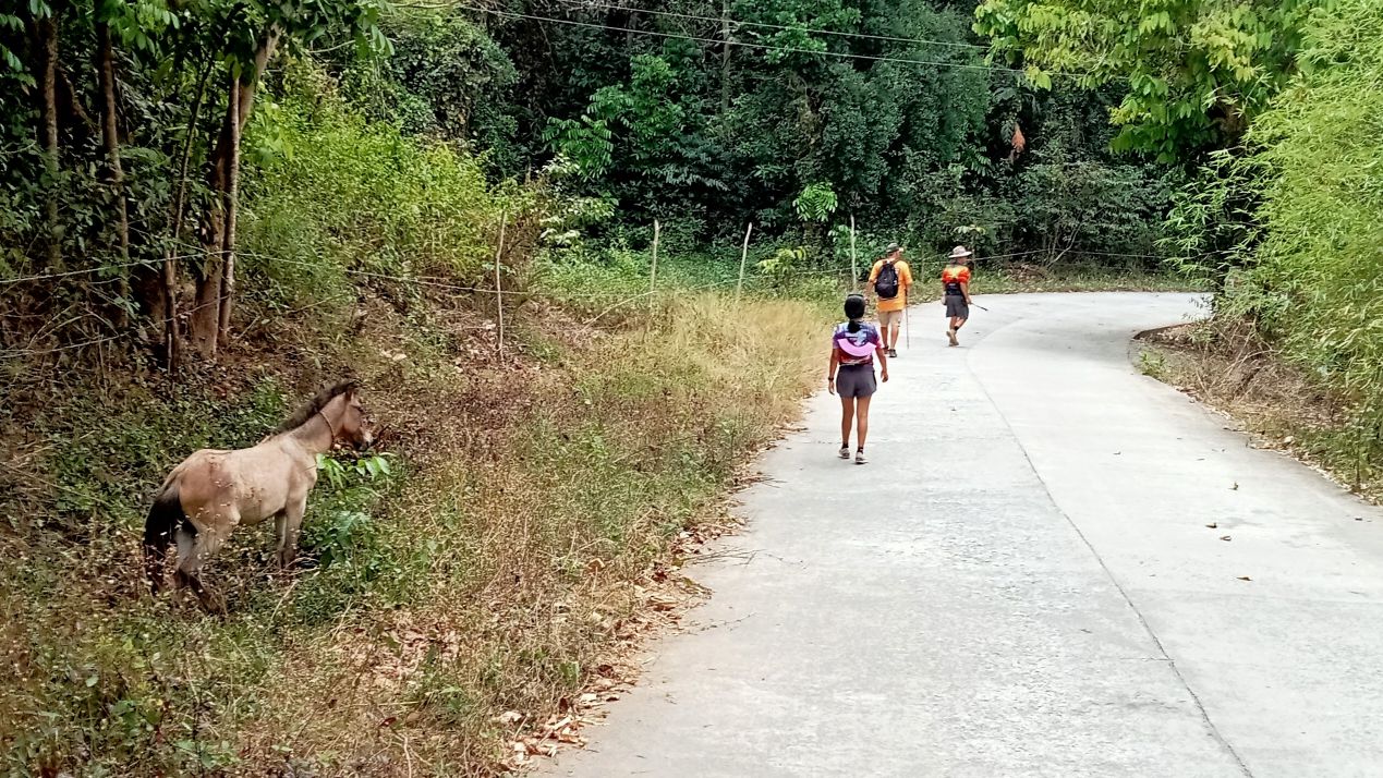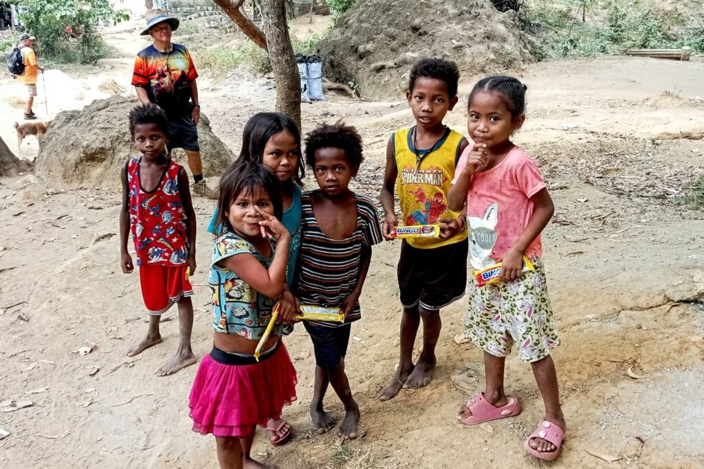 My fellow travelers. An advantage of low turnout is that we all fit into Scott’s car, and we can venture out to places that can only be reached by vehicle.The way ahead.Who knew we came in a bag? Or maybe we wind up in one.The first of several creek crossings. I didn’t get my feet wet until the final one.Steps to nowhere. This used to be a bridge.A Swan on the rocks.On the path to contentment.Another water crossing.Where pineapples come from.There were no falls, but some wet feet.The final creek crossing.Another carabao encounter. This one gave me the evil eye, but I made my way around him without incident.Into the village we go. The faded paint says: Aeta Cultural Heritage Center. It appeared to have been repurposed as someone’s living quarters.Bath time.Laundry day.Scrubbing the pots and pans.Aeta children enjoying their sweets.Little piggies waiting for market.The final climb of our hike.A pause at the top.Strolling through the hilltop village.Dispensing sweets for the sweet.We were looking for a different way back down, and hired this youngster as our guide.Walk this way.More kids to please.Hail Mary!I took this photo so I’d remember the name of where we were.It’s rare to see a horse in these parts, but here you go.Almost done with our journey.Back to where we started.It wasn’t long (around 4K), but it was pleasant.