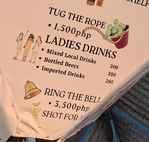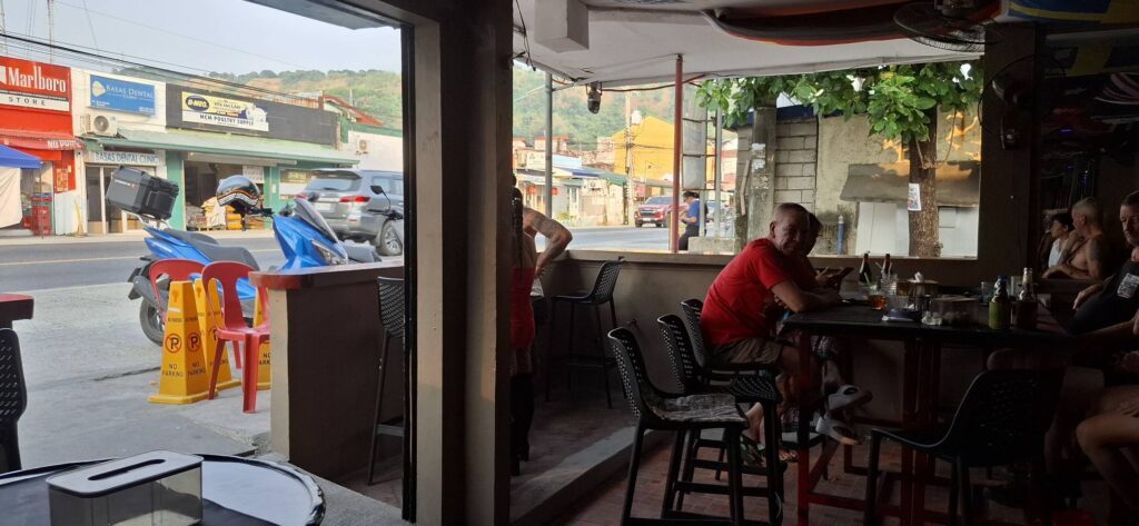 And then our dinner plans hit a bump in the road. We plopped down at Treasure Island, as is our custom, only to be told there was no red wine available. It doesn’t make sense for a dining establishment to be out of wine, but so be it. We decided to walk up the road and have one of those steak dinners at Viking Resort. But when we arrived, karaoke music was blasting at full volume. I found that irksome, but this is the Philippines. I don’t have to listen to that shit while I’m eating, though, so we moved on, then grabbed a trike for Mango’s. And guess what? The waitress said she was out of red wine. (queue up: take a deep breath, relax, and accept the Filipino way). Luckily, the manager, someone I’ve known for years, was standing nearby, and I said to her, How can you not have red wine? She responded, “We have it”, and took the waitress with her to the stockroom. She returned with a big bottle of red wine, and the evening was saved.