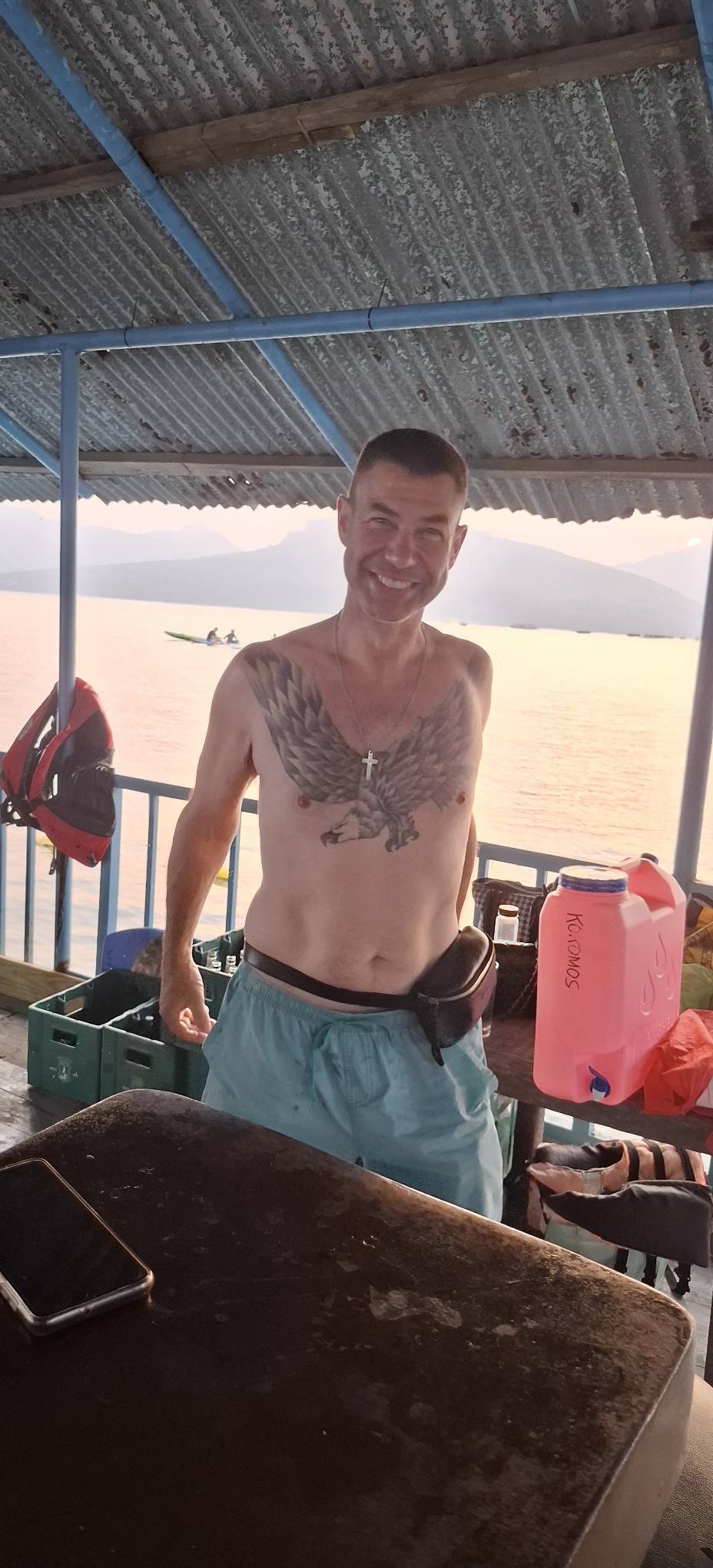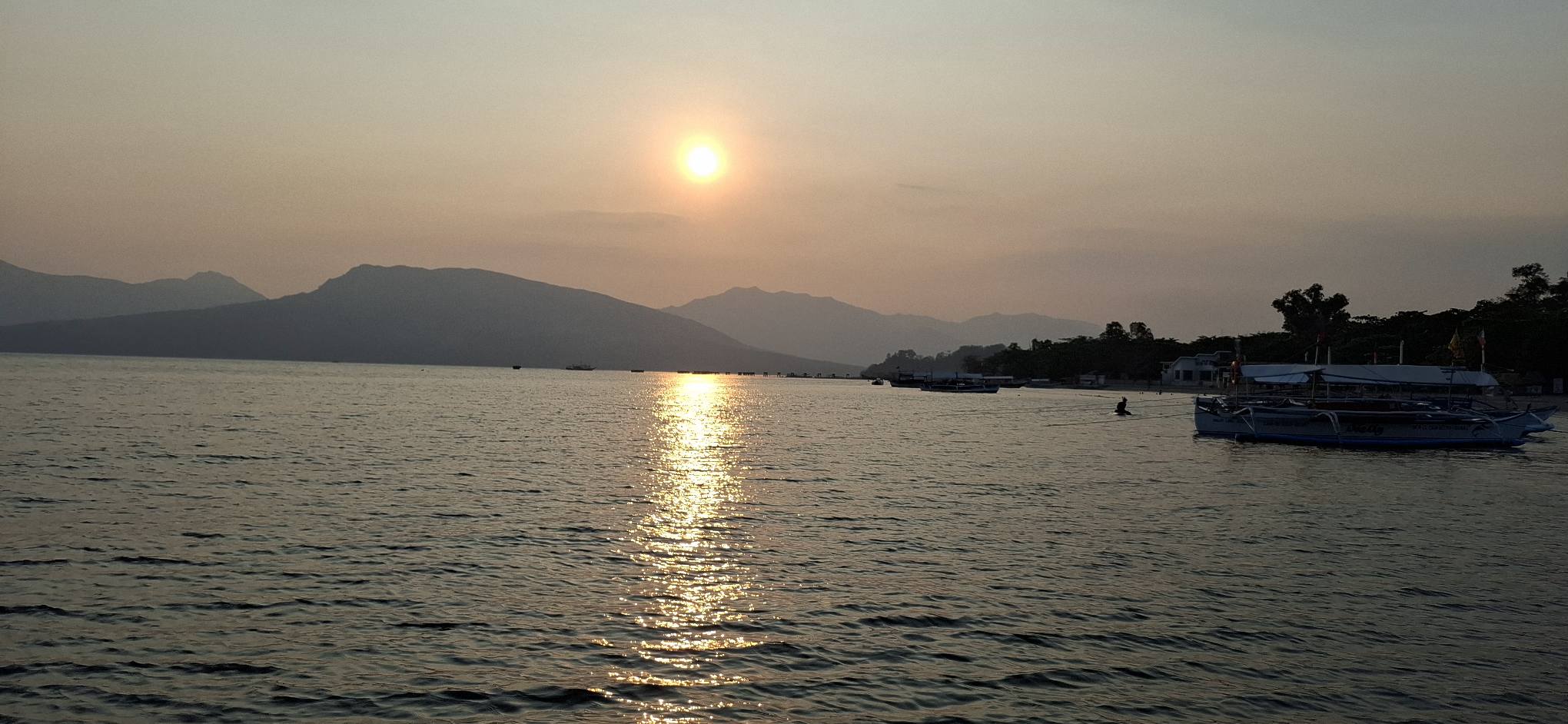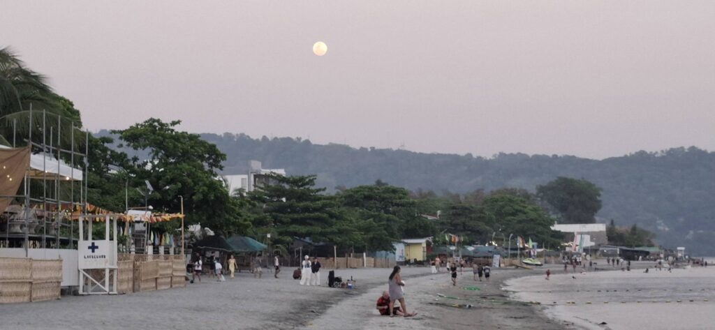 Toes in the sand.Sunlight on the water.Only one other customer was on the floating bar when we arrived, and he had tabled all the girls. Bless his heart!He bought multiple rounds of lady drinks for all the girls, including the bartender and cashier. No idea how much he spent, but it was a lot. Honestly, I respect the guys who have a good time with the girls and spread the joy by sharing the money. Locals like me can’t keep bars like this open on our own.One of the gals had something weird going on with her leg. Never saw anything like that before. It didn’t seem to bother her, she danced around and didn’t try to hide it nor did she appear to be in any pain. Good for her, keep on going!A bit later, my pal Mike came aboard for a beer. Nice to see you again!That time again.Sun is done.But the moon is on the rise.