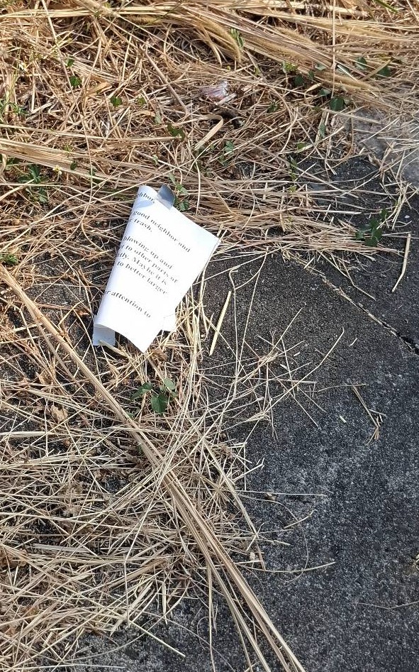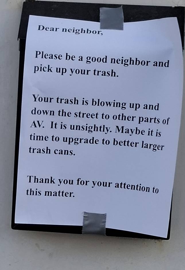 Oh, this gave me a good chuckle. Remember the note one of my neighbors had posted on another neighbor’s mailbox?