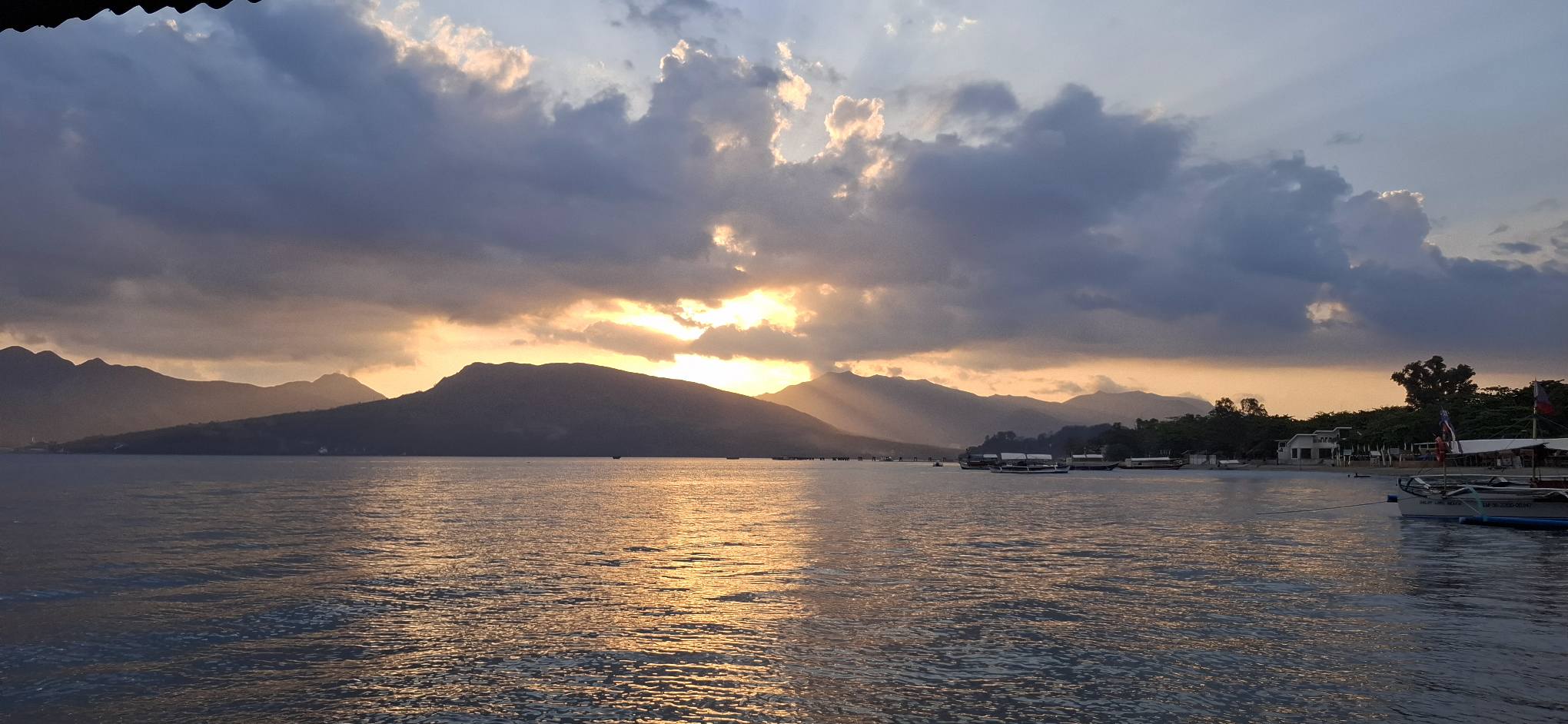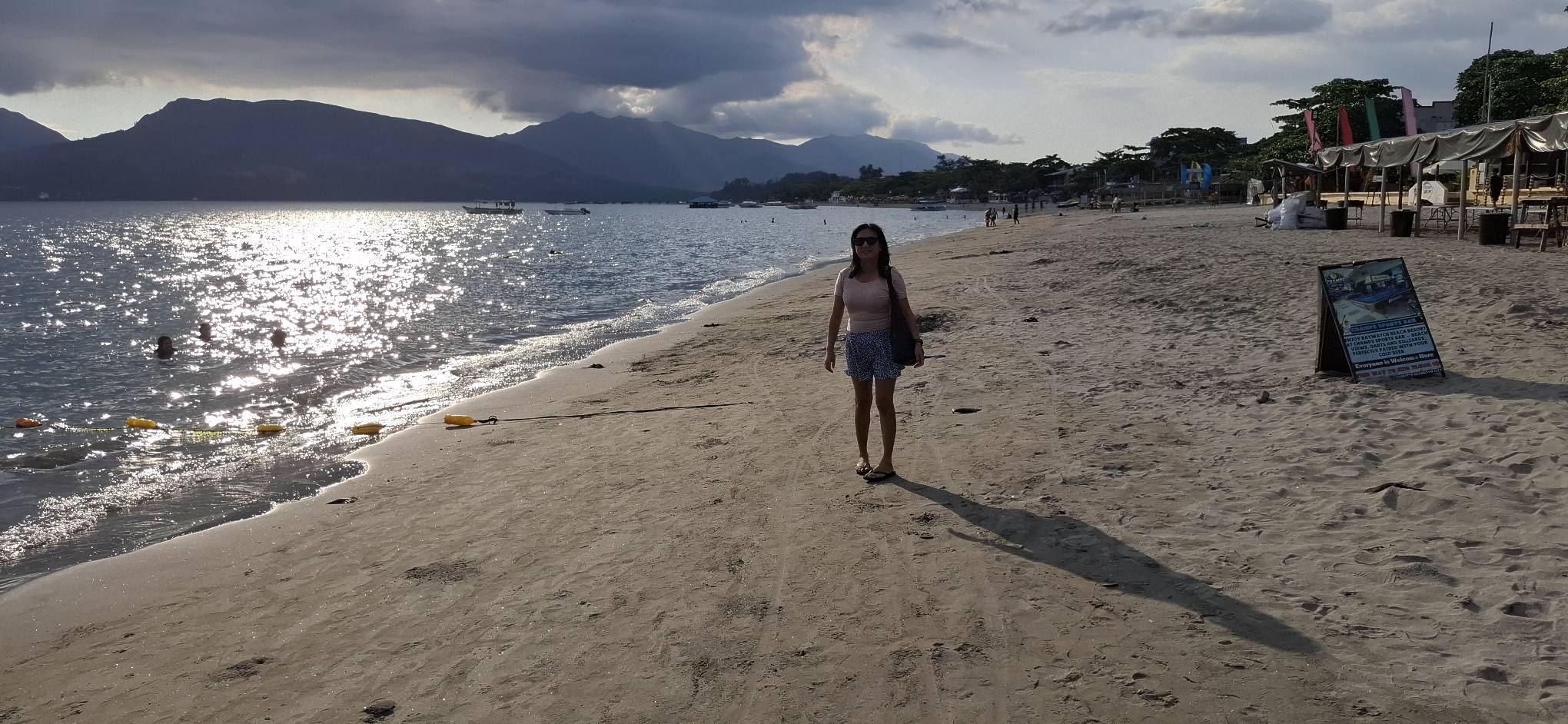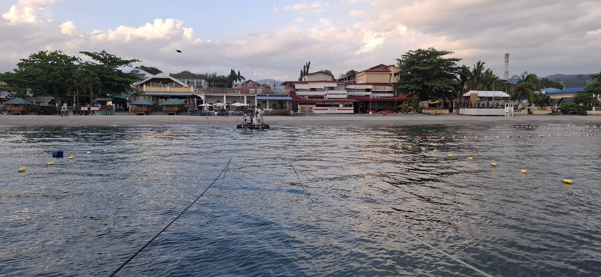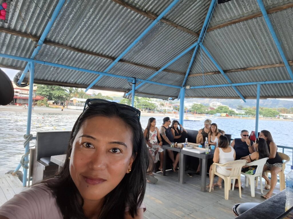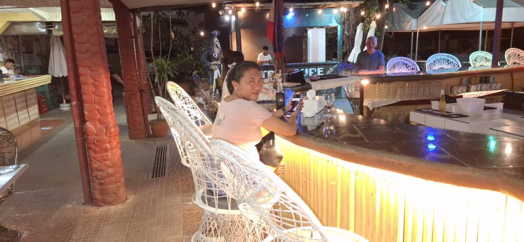 Toes in the sand……sun in the sky…,,,and a bar on the water.Busy on the floater this week. That group of youngish men behind us had tabled lots of the girls and were plying them with lady drinks and a pizza delivered from Treasure Island.Whenever one of these Navy supply ships (crewed by civilians) is anchored in the bay, the younger guys make a showing in Barretto.The five o’clock sun.The Baloy Beach view.And then this happened again.Beauty is in the eye of the beer holder.Thanks for another nice show!Time for dinner at Treasure Island.My dinner date.We shared a sweet-and-sour pork dish……and some beef quesadillas. They were both very tasty.