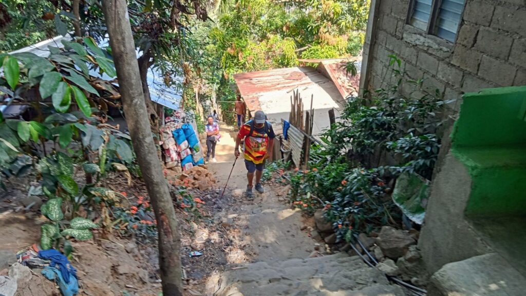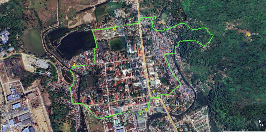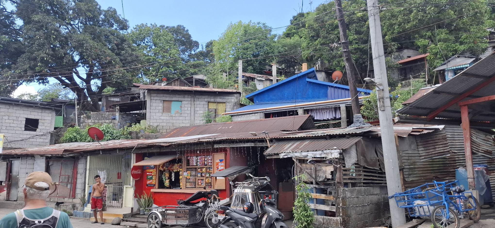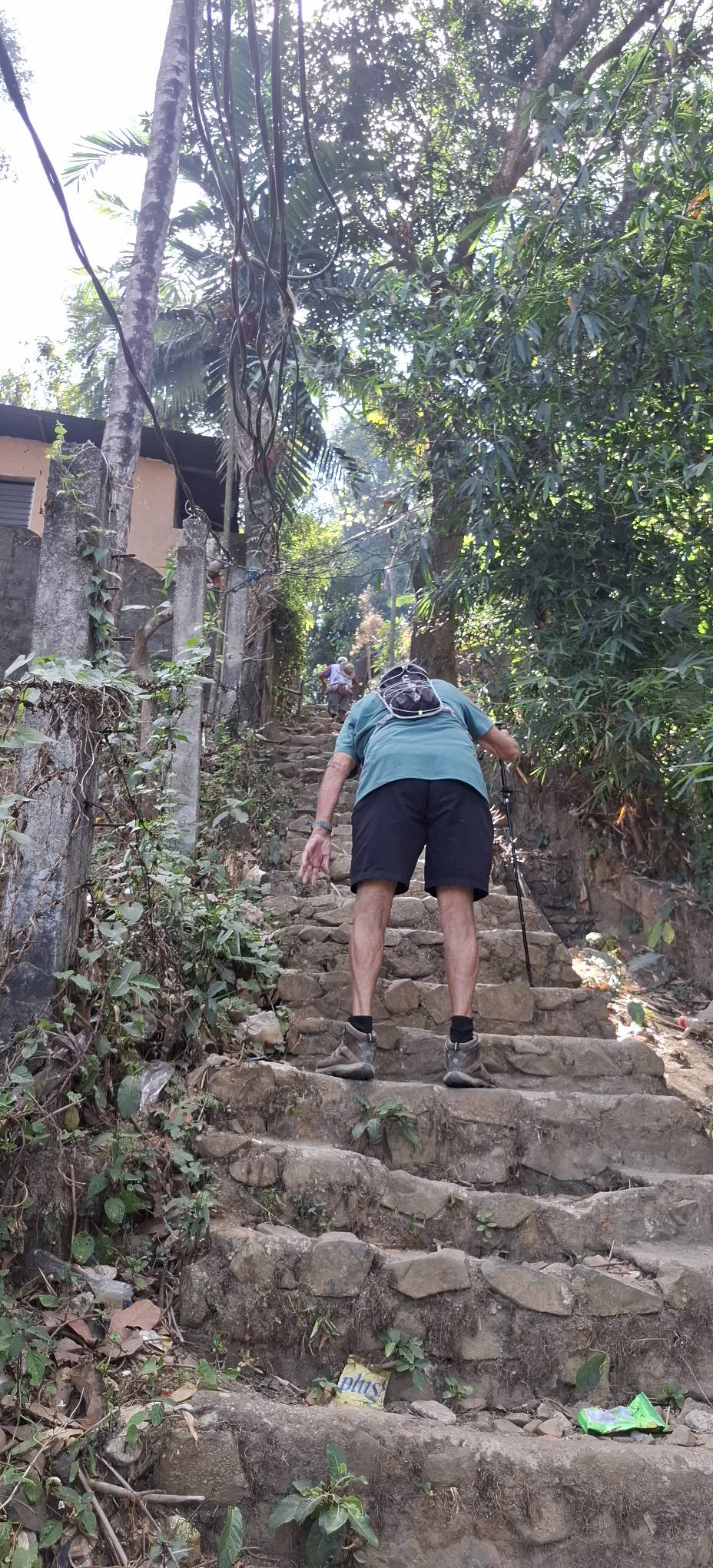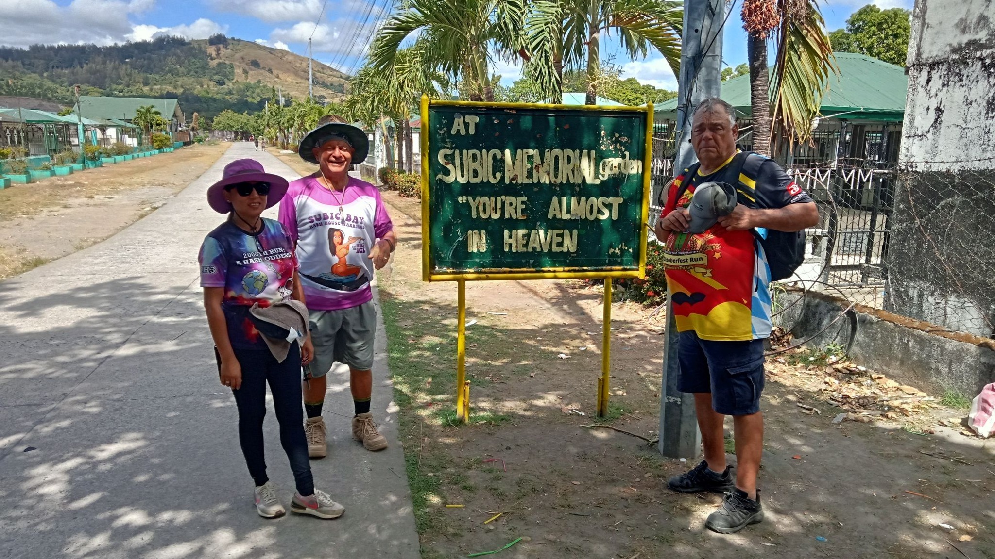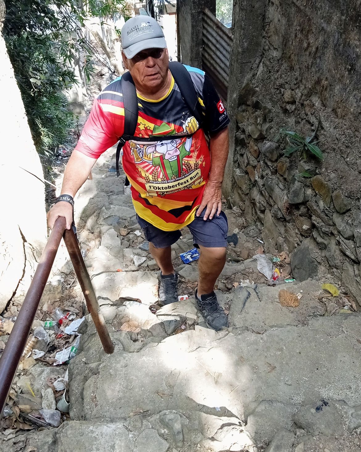 I think Scott might have wished I had opted out.I didn’t count how many, but there were lots of steps, and they were uneven and irregular.Fighting my way upward.A view from the top.It is hard to imagine living up here and making those steps we just climbed part of a daily commute.Mountain views are nice from here, though.And now for the downward trek.Back on the pavement.On the riverside.That’s as close to heaven as I want to be for now.Something to ponder.A different river to cross.Subic living.Where the river meets the bay.Climbing those steps made it feel a lot longer than 5K.
