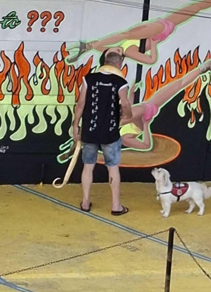 I was on my own in town yesterday, and started things off at the familiar Cheap Charlies. I took my usual seat facing the highway, and lo and behold, Hot Zone owner Jay came outdoors with his pet.